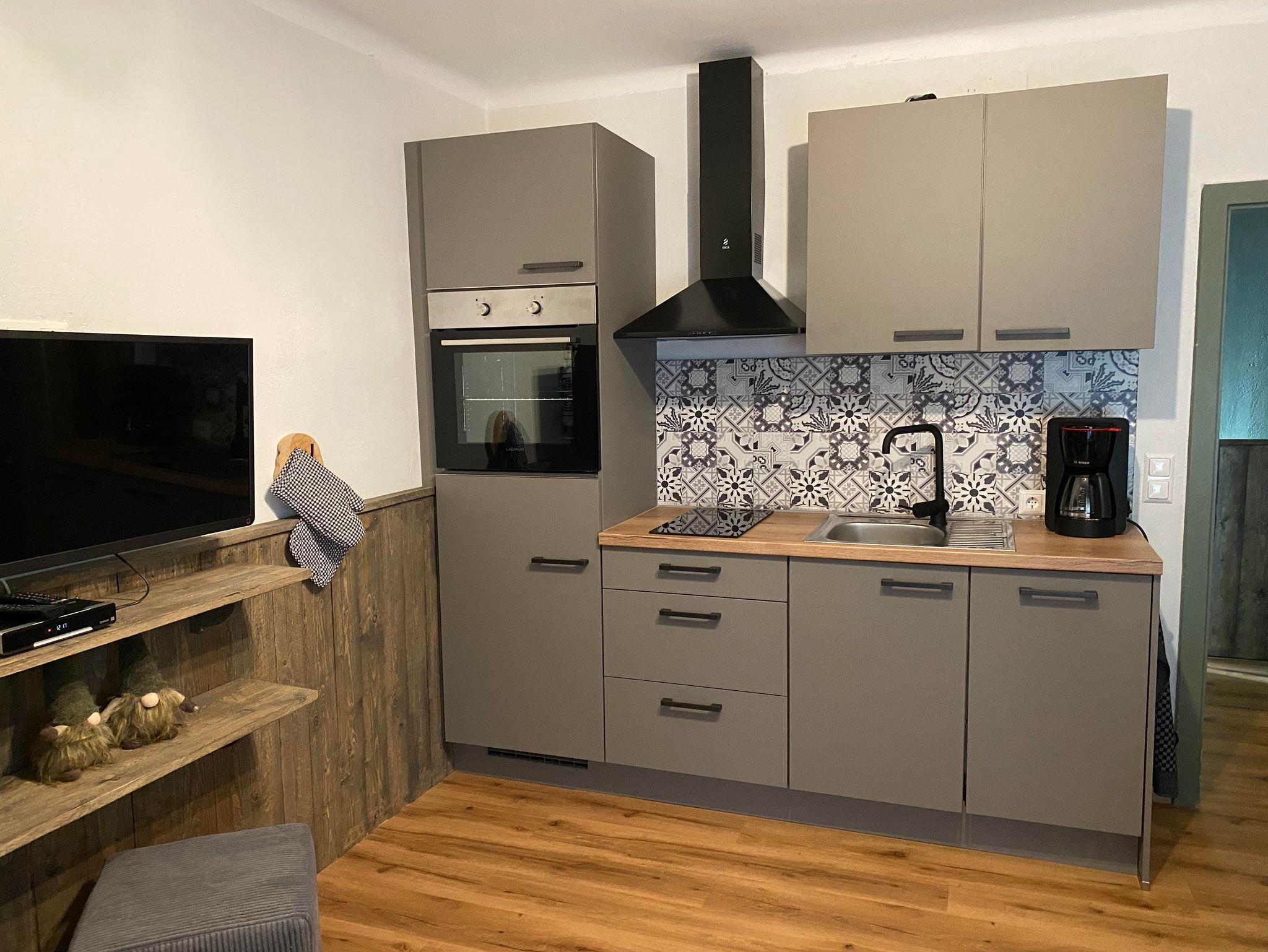 Brettlejause besteht aus einem Flur mit Durchgang zum Badezimmer. Ein Wohn-/Esszimmer mit Sofa und ein separates Schlafzimmer.