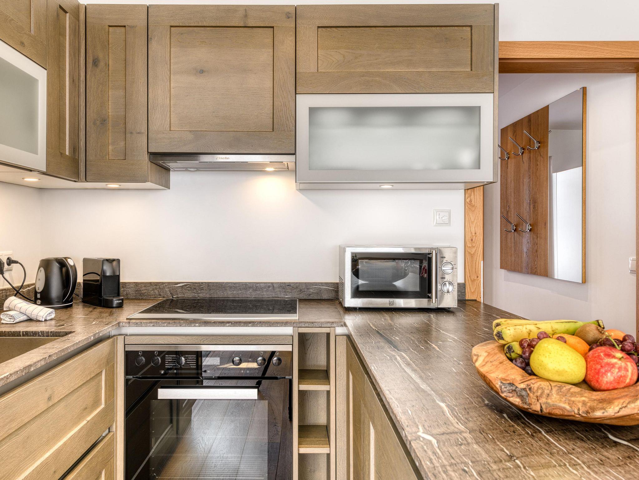 Gut ausgestattete Küche: Herd, Geschirrspüler, Nespresso-Kaffeemaschine (Kapseln an der Rezeption)