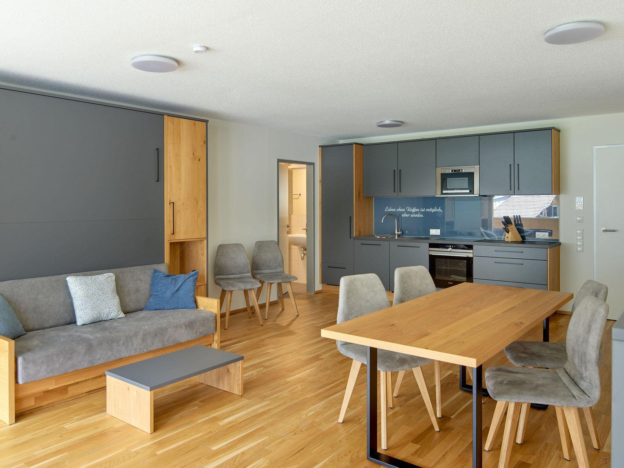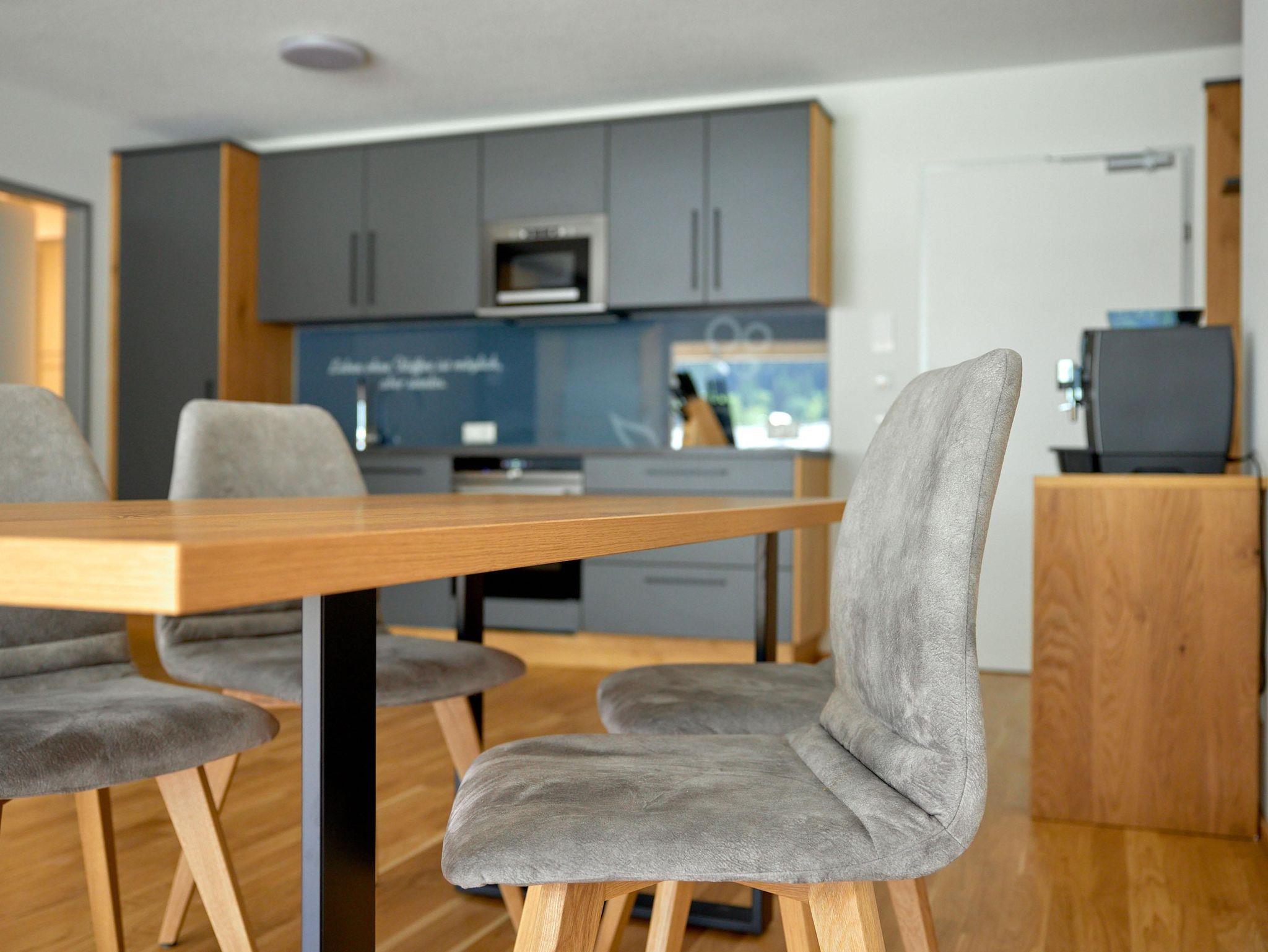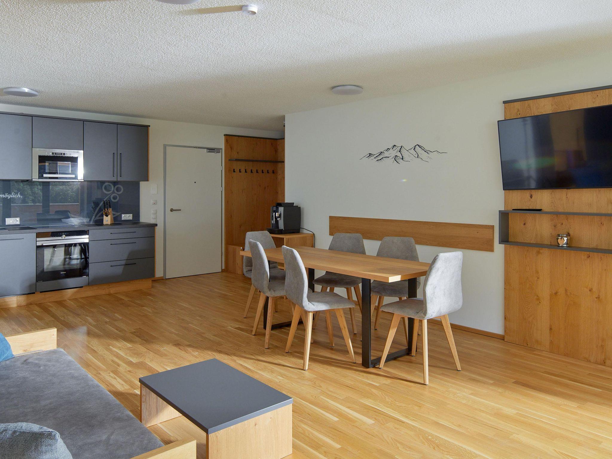 Willkommen im Zapfig Living Apartment 13, Deinem perfekten Rückzugsort für einen erholsamen Aufenthalt. Die 80 m² Unterkunft im 1.Stock bietet ein gemütliches Wohnzimmer inkl. ausziehbaren Kingsizebett mit Smart-TV, 2 Schlafzimmer (Kingsizebett+ausziehbares Einzelbett+Smart-TV) sowie eine voll ausgestattete Küche. Die 2 Badezimmer verfügen über Dusche und WC. Genieße den Komfort einer eigenen Unterkunft+entspanne in alpiner Umgebung. Vom Balkon mit Liegenstühlen besteht Bergblick.