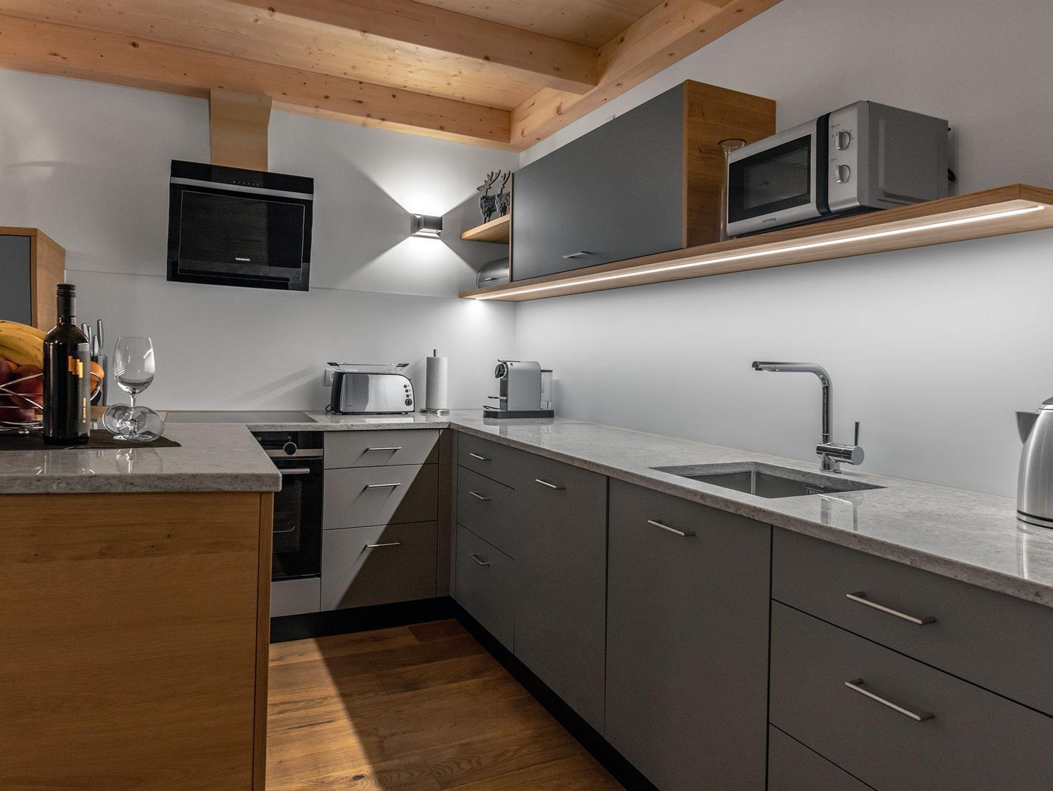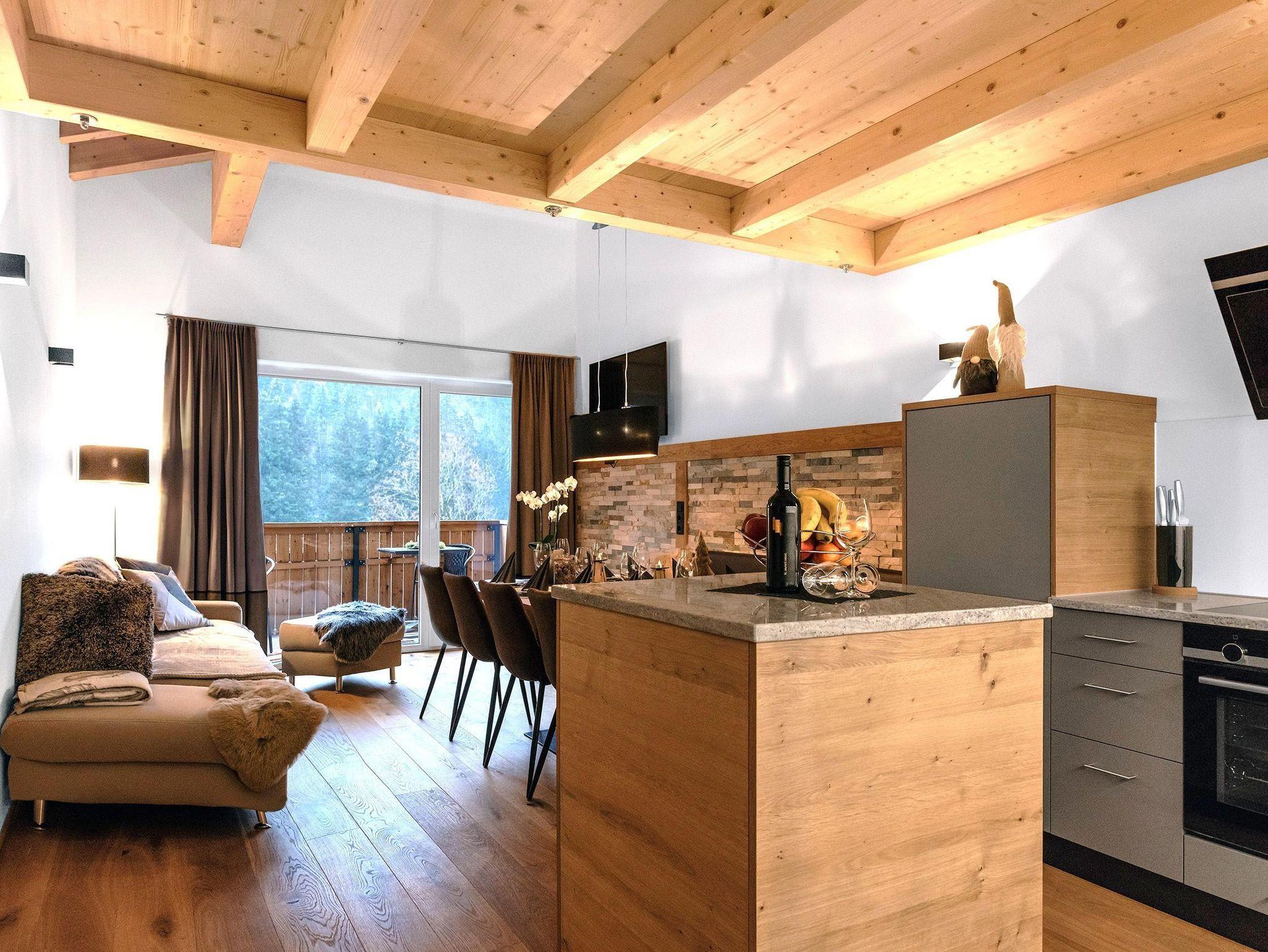 Geräumiges Wohnzimmer/Esszimmer/Küche mit Inselbar mit 5 Meter hoher Decke sowie Relaxgalerie zum Entspannen über der Küche eingebaut.