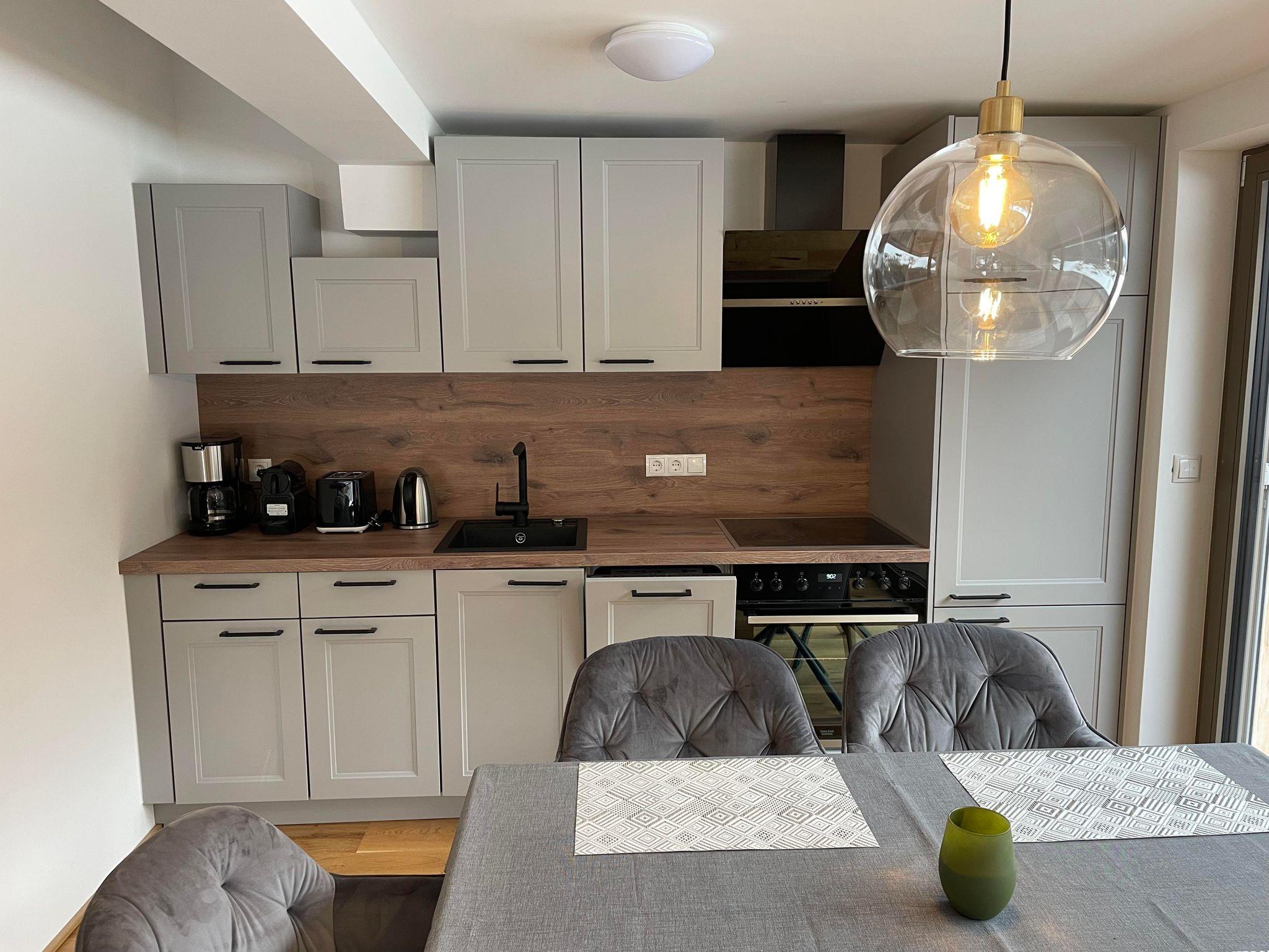 Die offene Küche ist komplett ausgstattet und verfügt über einen Backofen mit Ceran-Kochfeld, Filter-Kaffeemaschine (Filter Nr. 4), Wasserkocher, Toaster und Kühlschrank mit Gefrierfach.