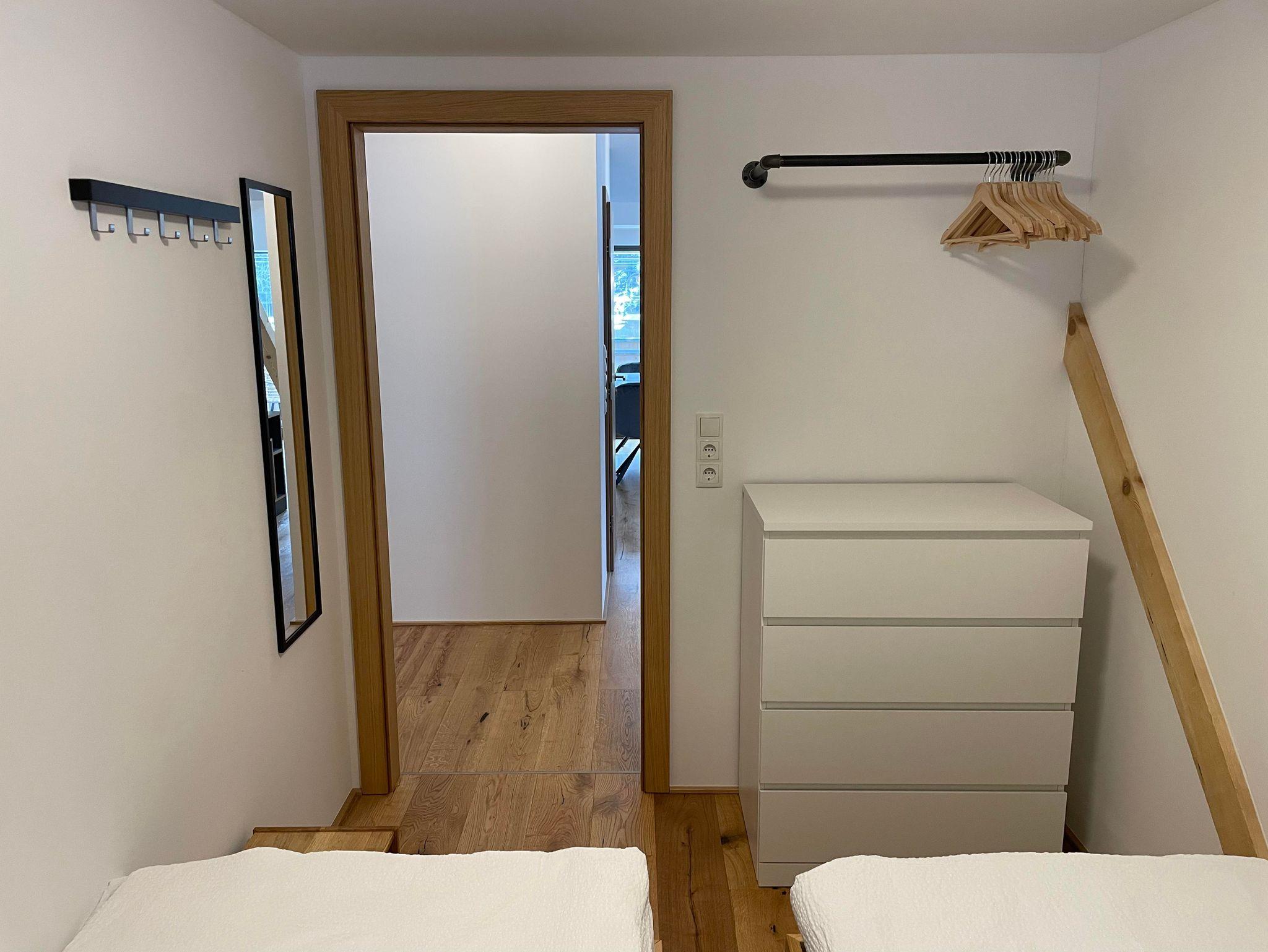 Ein Schlafzimmer hat ein Doppelbett. Im anderen Schlafzimmer sind 2 Einzelbetten, die bei Bedarf zu einem Doppelbett zusammengeschoben werden können. Zur Wohung gehört auch ein überdachter Carport-Stellplatz (Nr. 6). Das Badezimmer verfügt über eine Dusche sowie über eine Waschmaschine mit Trockner. Ein Haartrockner ist vorhanden. WLAN ist inklusive.