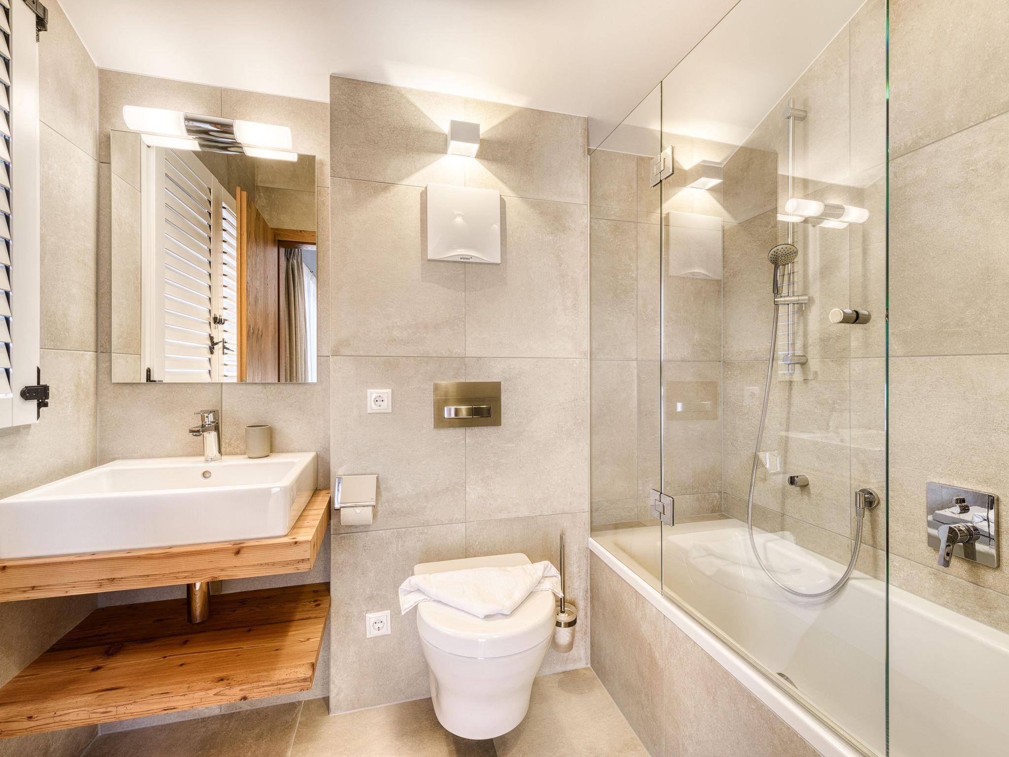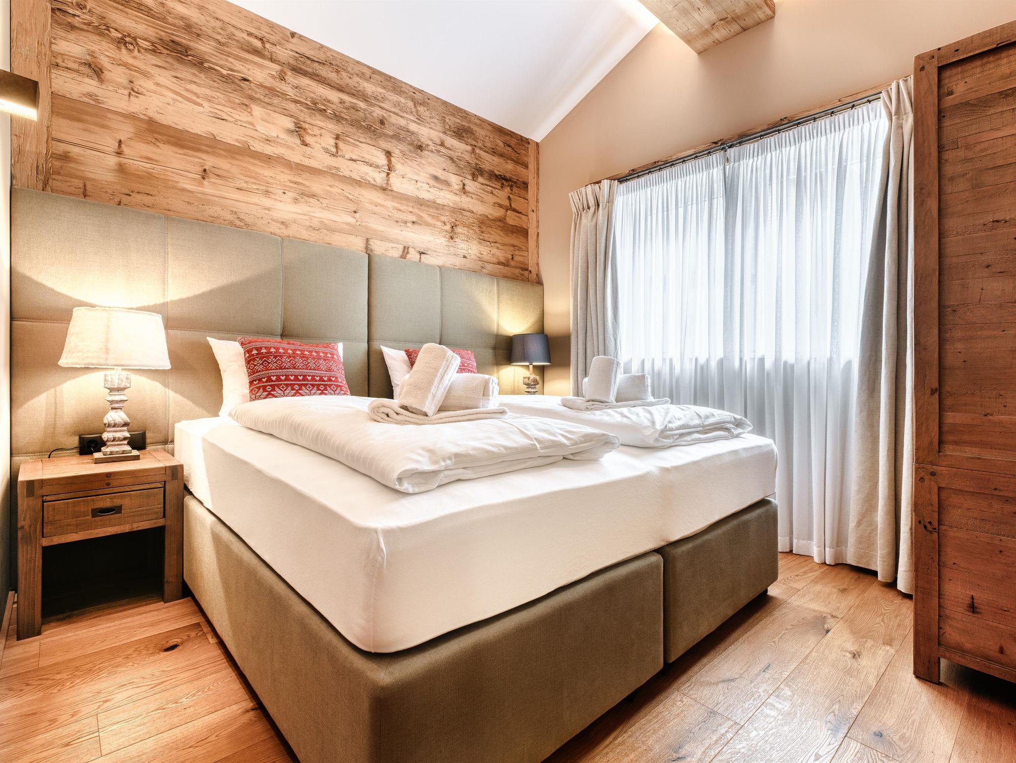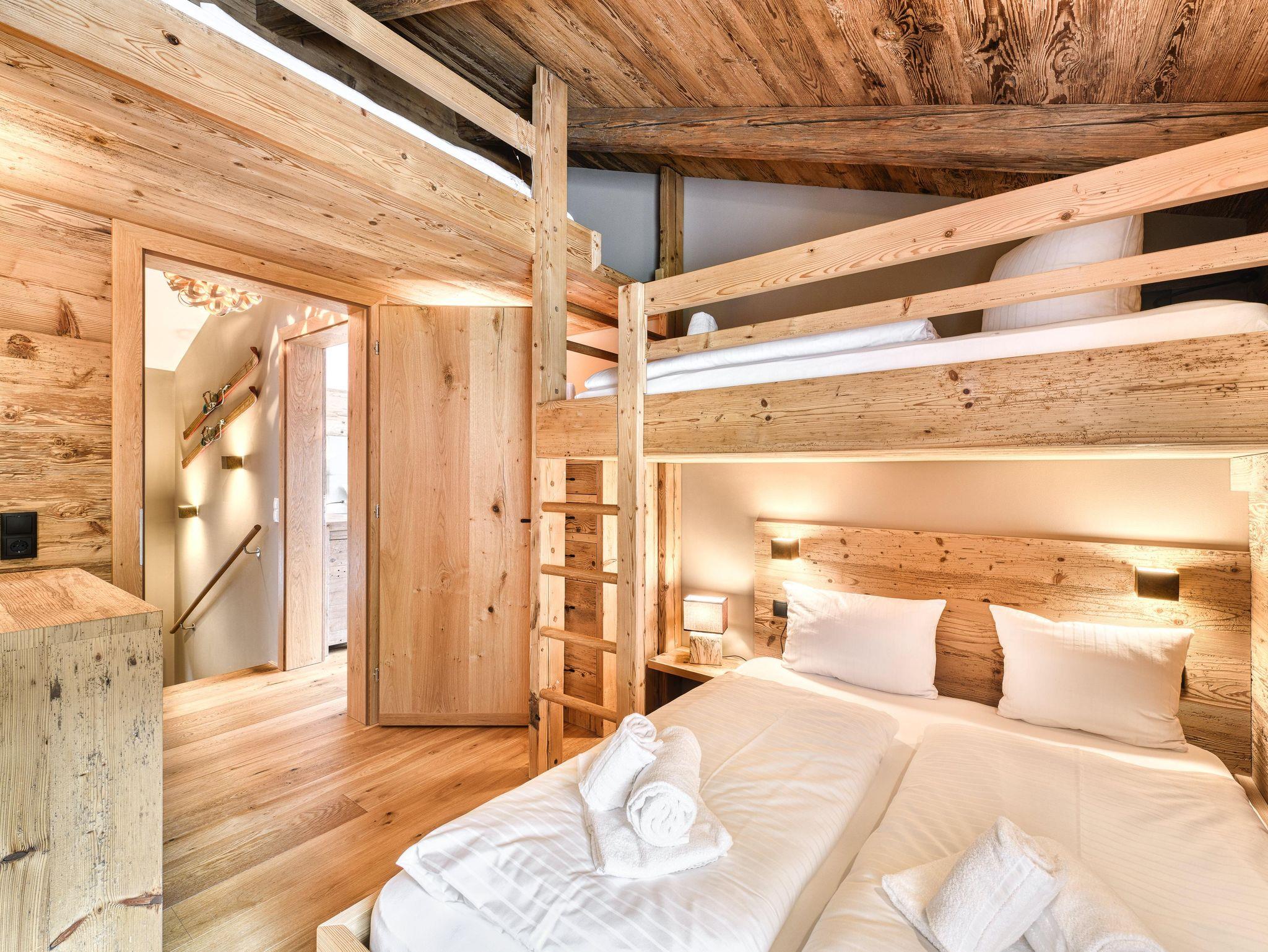 Im Obergeschoss bieten 3 Schlafzimmer mit 3 Bädern ein luxuriöses Wohngefühl und erholsamen Schlaf. Die Altholz Vertäfelung verleiht dem Chalet ein heimeliges und warmes Ambiente.