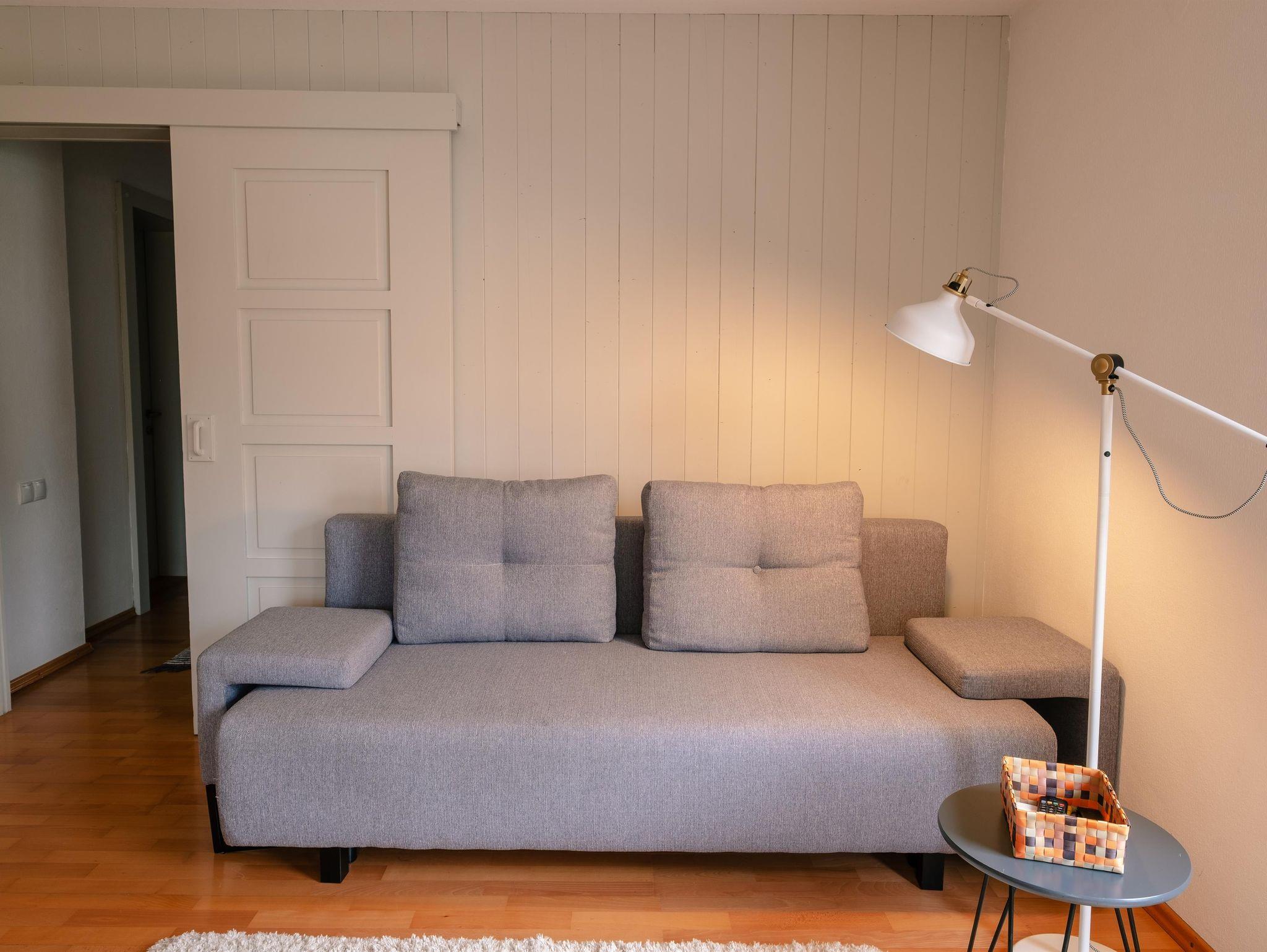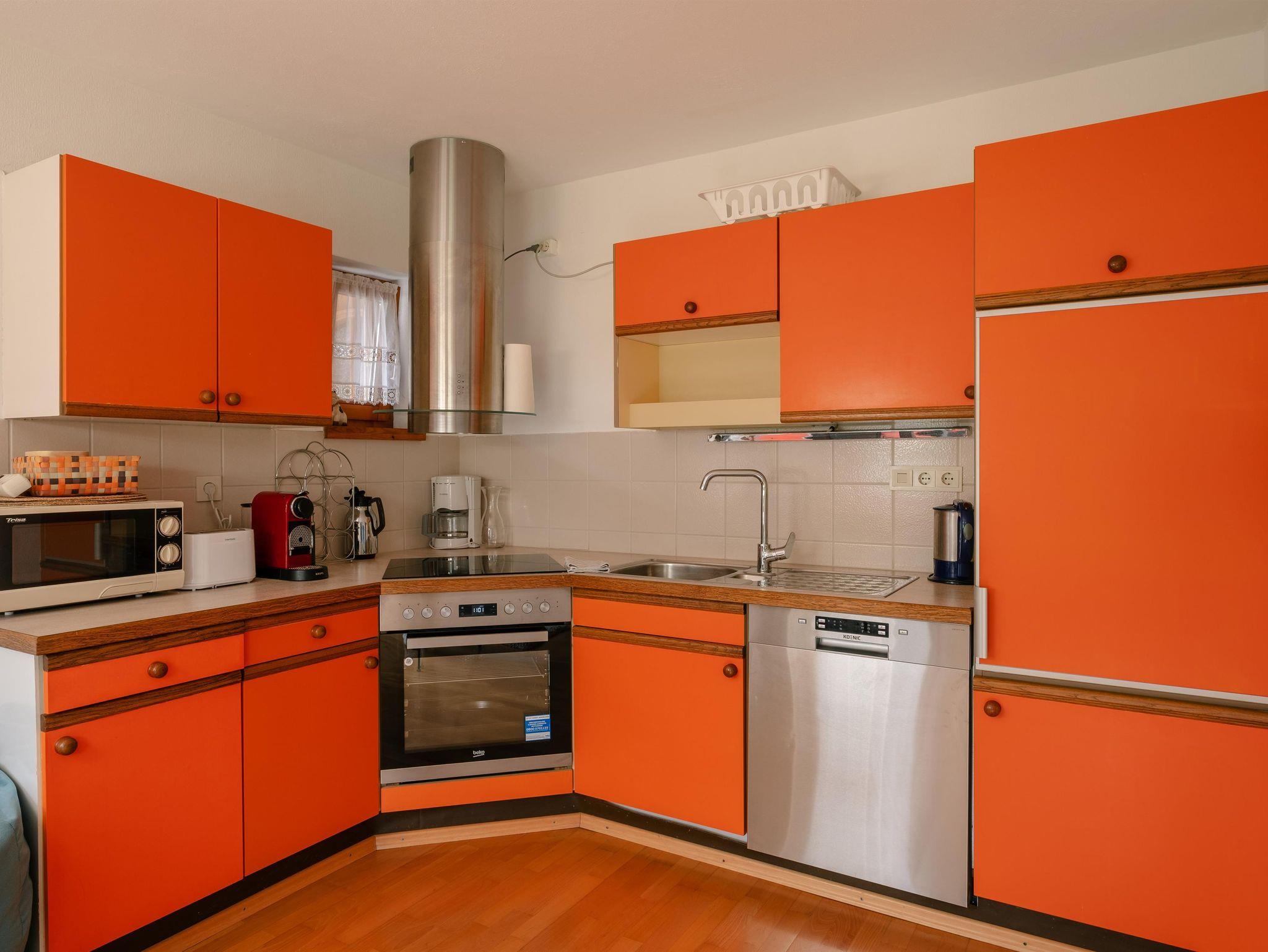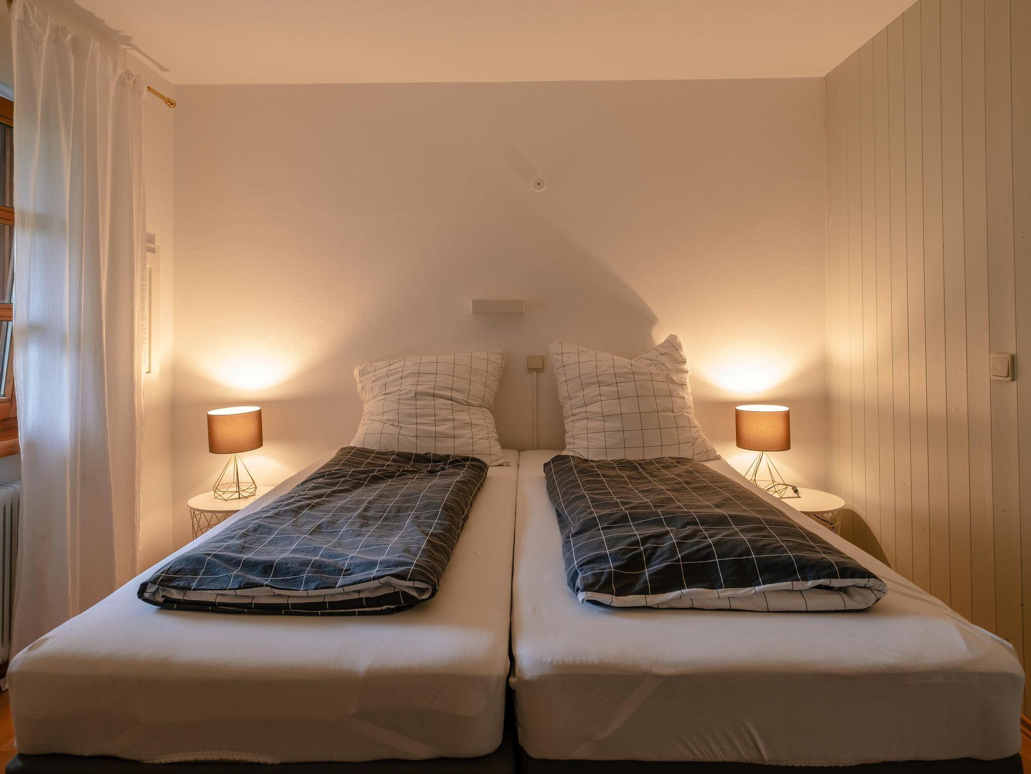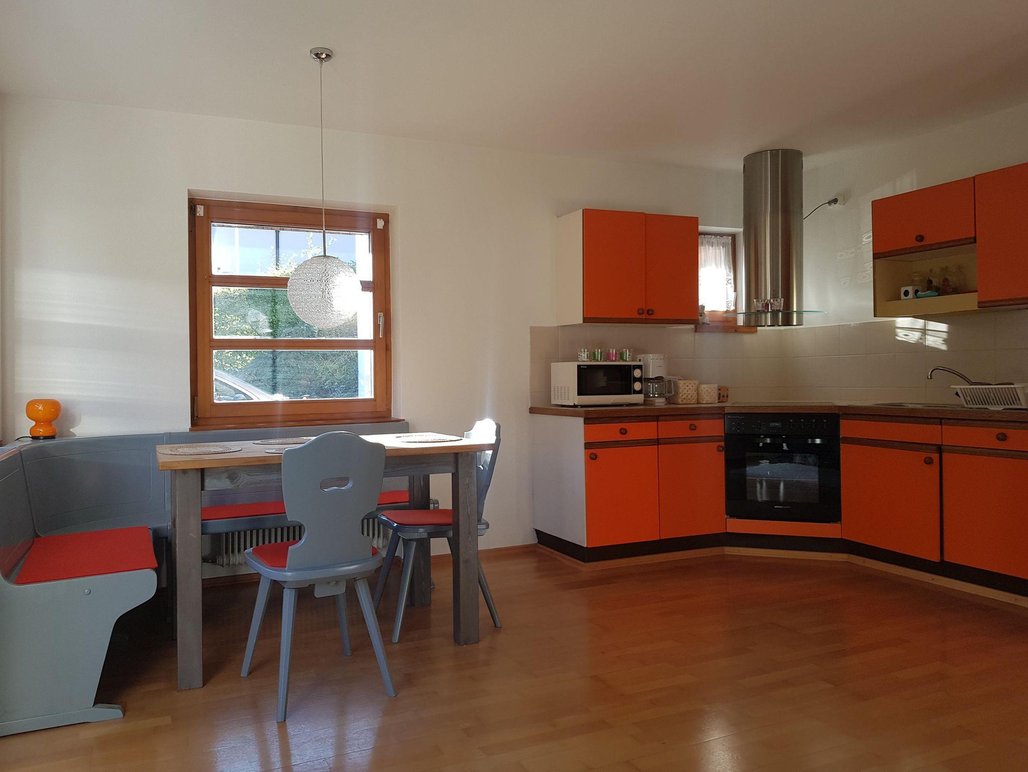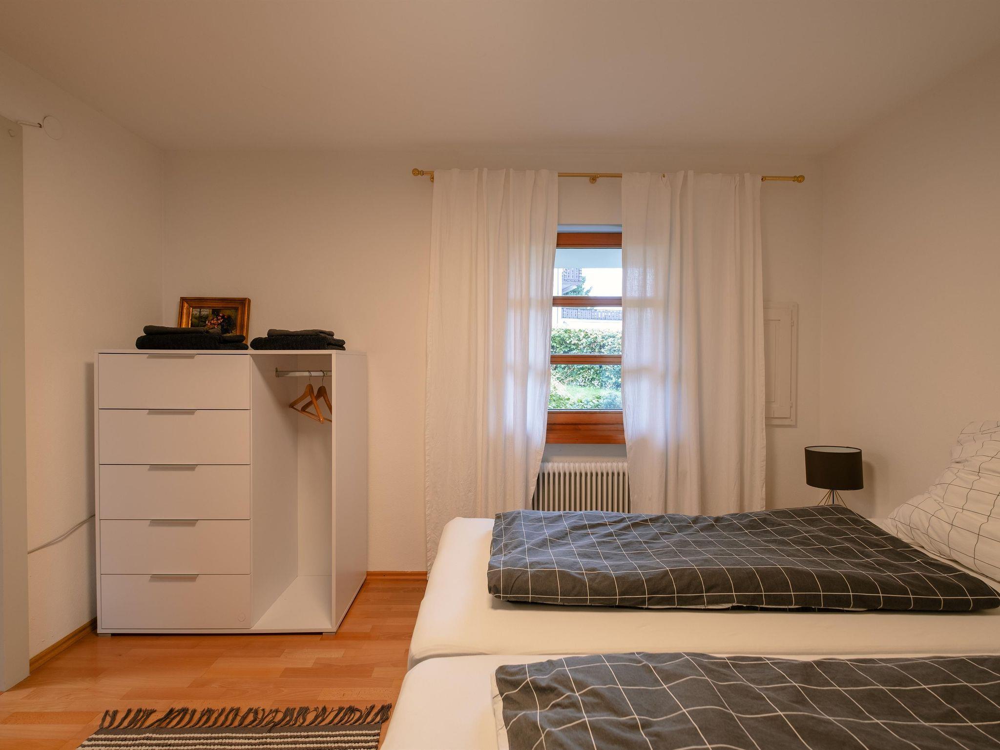 Die 2-Zimmerwohnung im EG ist ca. 45 qm groß. Sie besitzt einen offenen, hellen Wohn-Essraum mit integrierter Küche und Schlafsofa. Das Schlafsofa (1,40 m breit) und die Eckbank mit Tisch und Stühlen laden zum Verweilen ein. Die nach Süden ausgerichteten großen Fenster und die Fenstertüre, verschaffen dem Raum ein helles und sehr angenehmes Ambiente. Durch die Fenstertüre gelangt man aus dem Wohnzimmer direkt in den südseiteigen Gartenanteil mit Stühlen und Esstisch mit Sonnenschirm. Eine Holzschiebetür trennt das Schlafzimmer vom Wohnzimmer. Vom Schlafzimmer mit den 2-Betten/Doppelbett kommt man direkt über eine Türe in einen separaten Stau-Raum und einen begehbarer Kleiderschrank. Zur Wohnung gehört ein Bad mit Dusche und WC. Den Gästen im Haus steht eine Sauna (im Garten, gegen extra Gebühr) sowie Ski- und Fahrradkeller mit Skischuhheizung zur Verfügung. Jede Wohnung besitzt einen Stellplatz im Hof.