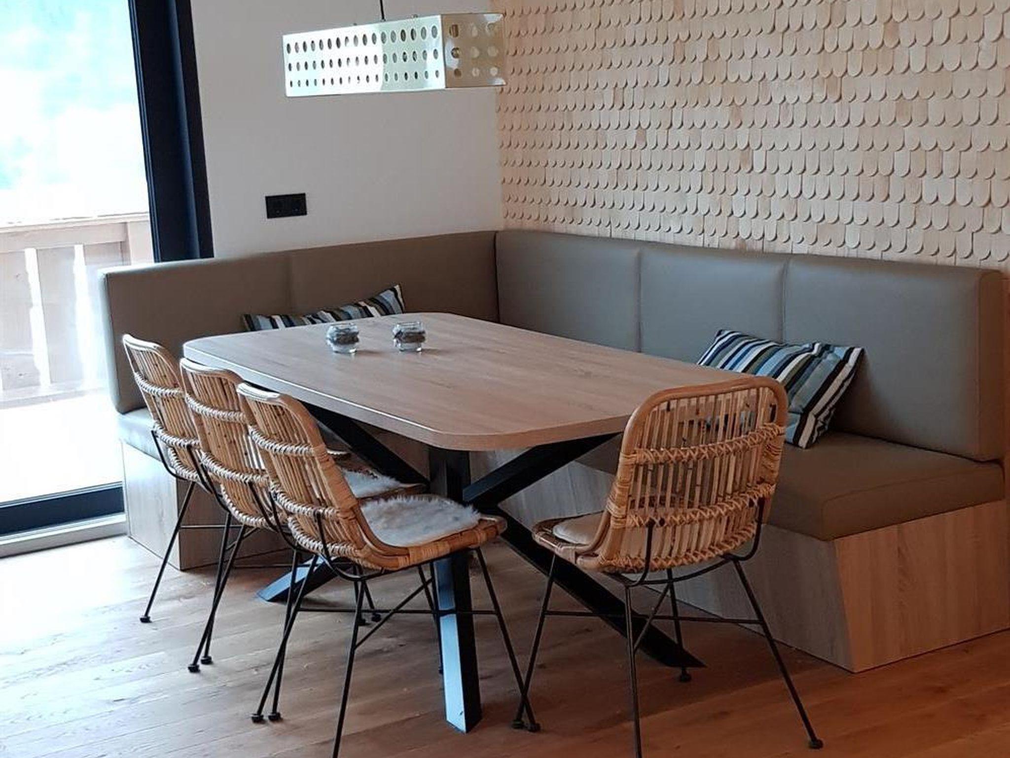 Eingang auf Straßenniveau; Halle mit eigenem Skiraum mit Schuhtrockner; geräumiger Wohnraum mit Designerküche als Highlight - ausgestattet mit allen Geräten und Kücheninsel. Ein sehr geräumiger Essbereich, sowie ein Sitzbereich mit ausreichend und bequemen Sitzgelegenheiten. Der Balkon ist vom Wohnzimmer aus durch eine Schiebetür zugänglich.