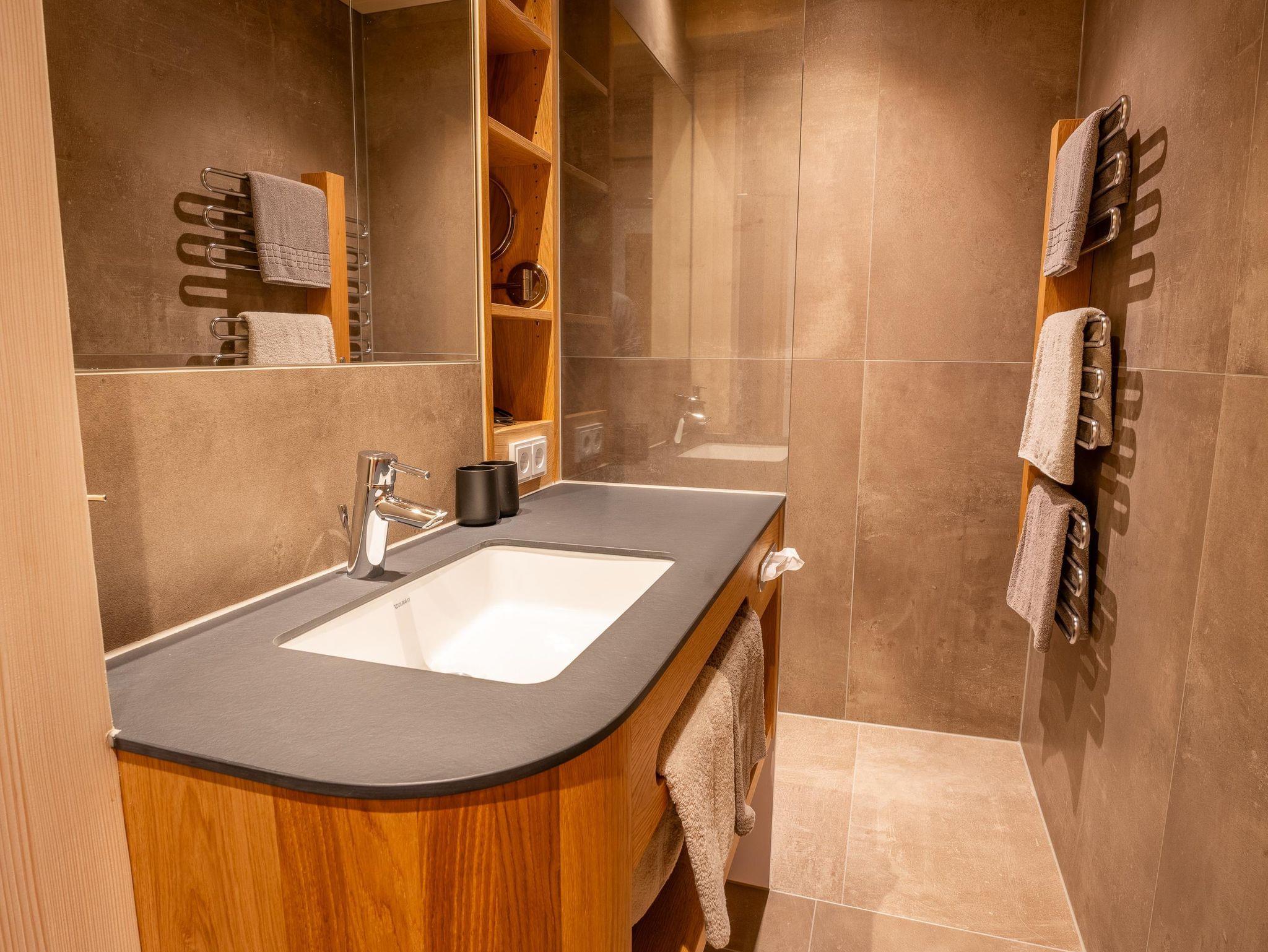 Unsere ca. 50 m² große Ferienwohnung UGA-BERG befindet sich im 3. Obergeschoss. Sie bietet Platz für zwei bis maximal fünf Personen und überzeugt mit klarem Design, so viel wie möglich Tageslicht und einem sonnigen Balkon. Zwei getrennte Schlafzimmer sorgen für Komfort: Eines ist mit einem Doppelbett und einer Couch ausgestattet, das andere mit zwei einzeln stehenden Betten. Beide Zimmer verfügen über ein eigenes TV-Gerät. Der Eingangsbereich ist großzügig angelegt und bietet reichlich Garderobenfläche. Von hier aus erreichen Sie beide Schlafzimmer, das Badezimmer mit Dusche und Waschbecken sowie das separate WC. Der offene Küchenbereich ist mit modernen und hochwertigen Siemens-Geräten ausgestattet: Backofen, Mikrowelle, Induktionskochfeld, Kühlschrank mit Tiefkühlfach und Spülmaschine sowie zusätzliche Elektrogeräte (Kaffeemaschine, Wasserkocher, Toaster, Plattengrill, Handmixer) lassen keine Wünsche offen.