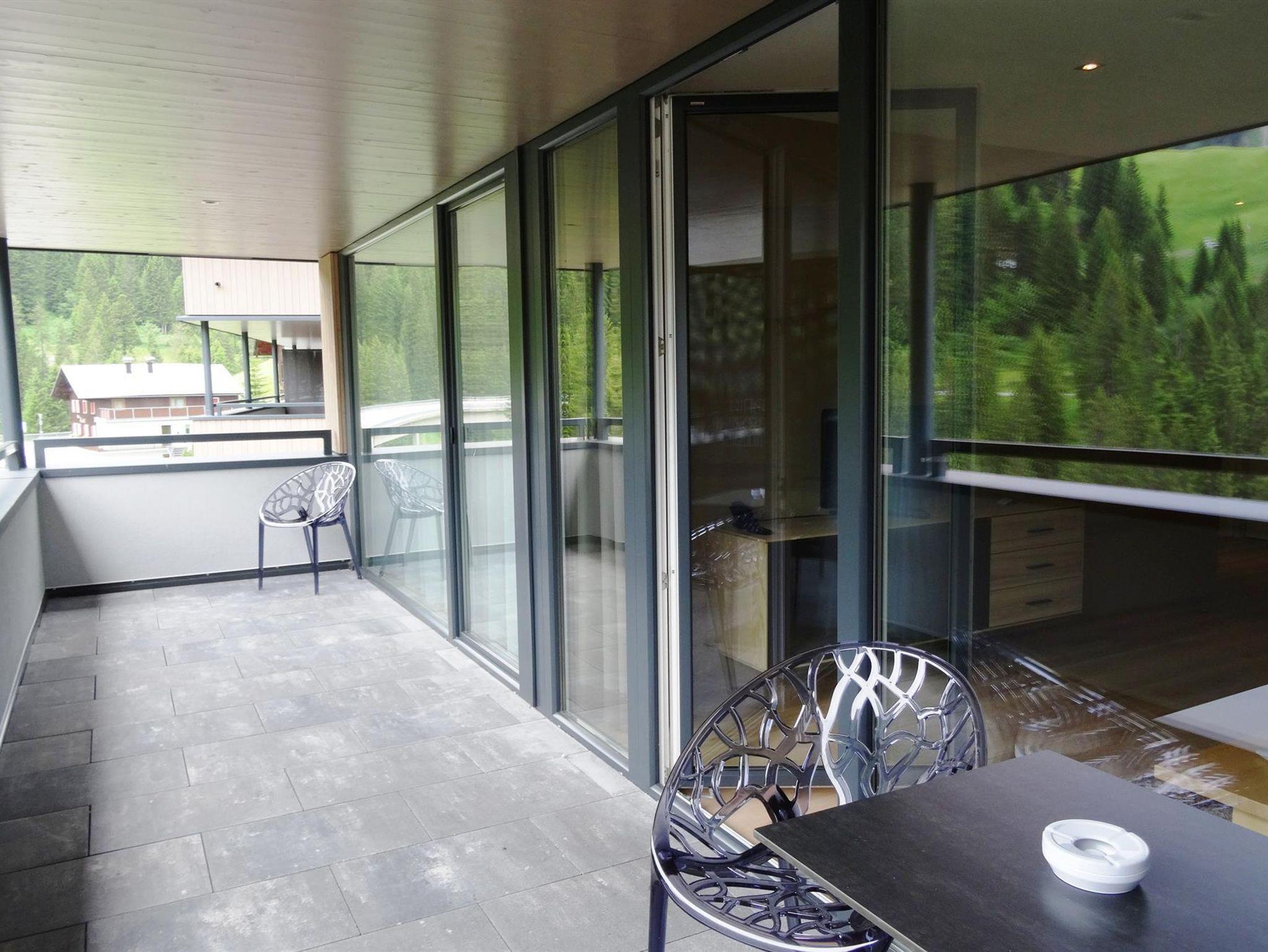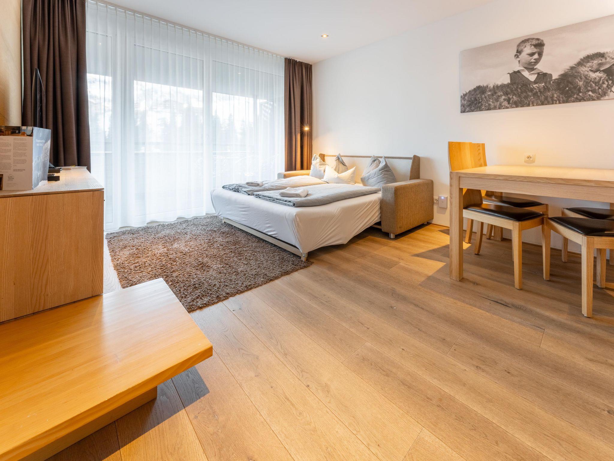 Obwohl das Zimmer keinen Balkon hat, sorgen die großen Fenster für ausreichend Tageslicht und ermöglichen Ihnen einen herrlichen Blick auf die umliegende Berglandschaft. Egal zu welcher Jahreszeit Sie unser Hotel besuchen, Sie können sich immer auf eine beeindruckende Aussicht freuen.