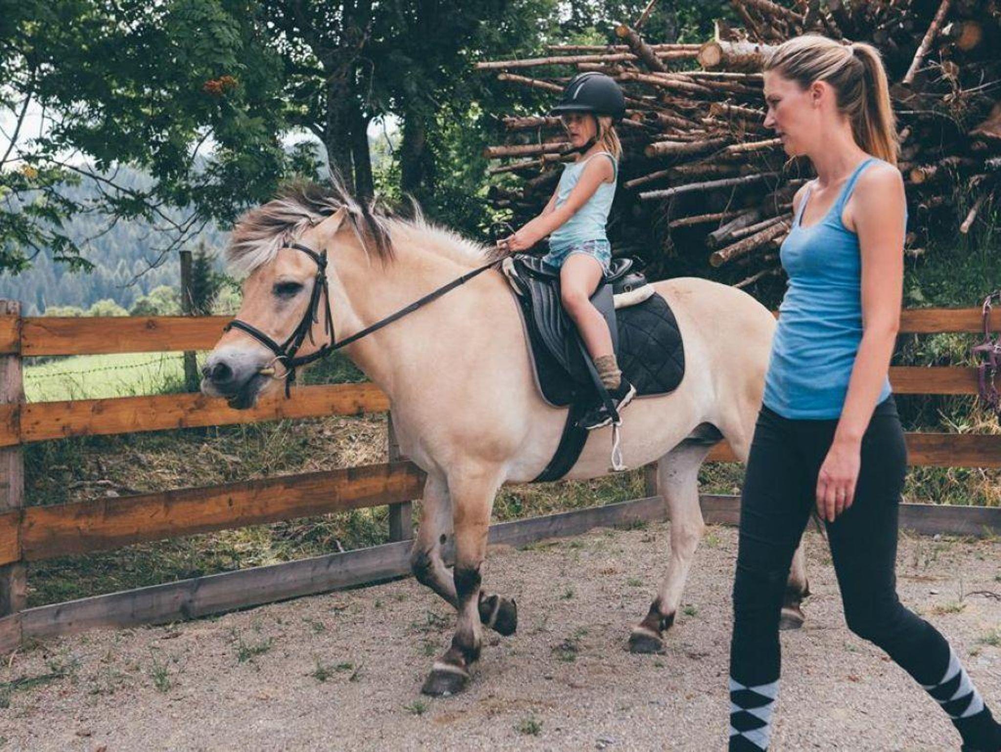 Für alle Pferdeliebhaber gibt es die Möglichkeit, unsere Ponys und Pferde zu putzen, zu satteln und zu füttern. Auf dem hofeigenen Reitplatz können die Kinder erste Reiterfahrungen sammeln oder ihre Fähigkeiten verbessern.