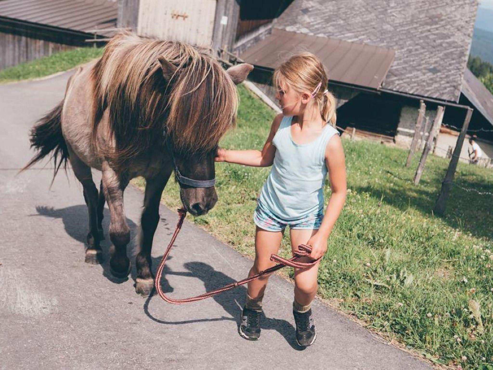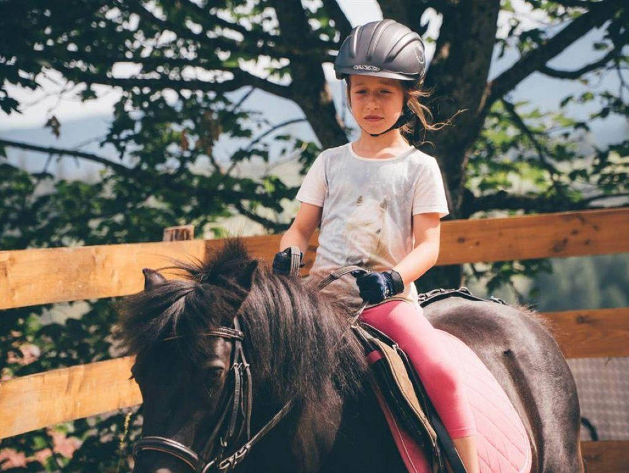 Für alle Pferdeliebhaber gibt es die Möglichkeit, unsere Ponys und Pferde zu putzen, zu satteln und zu füttern. Auf dem hofeigenen Reitplatz können die Kinder erste Reiterfahrungen sammeln oder ihre Fähigkeiten verbessern.