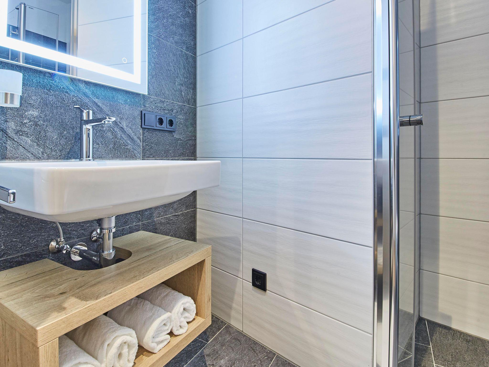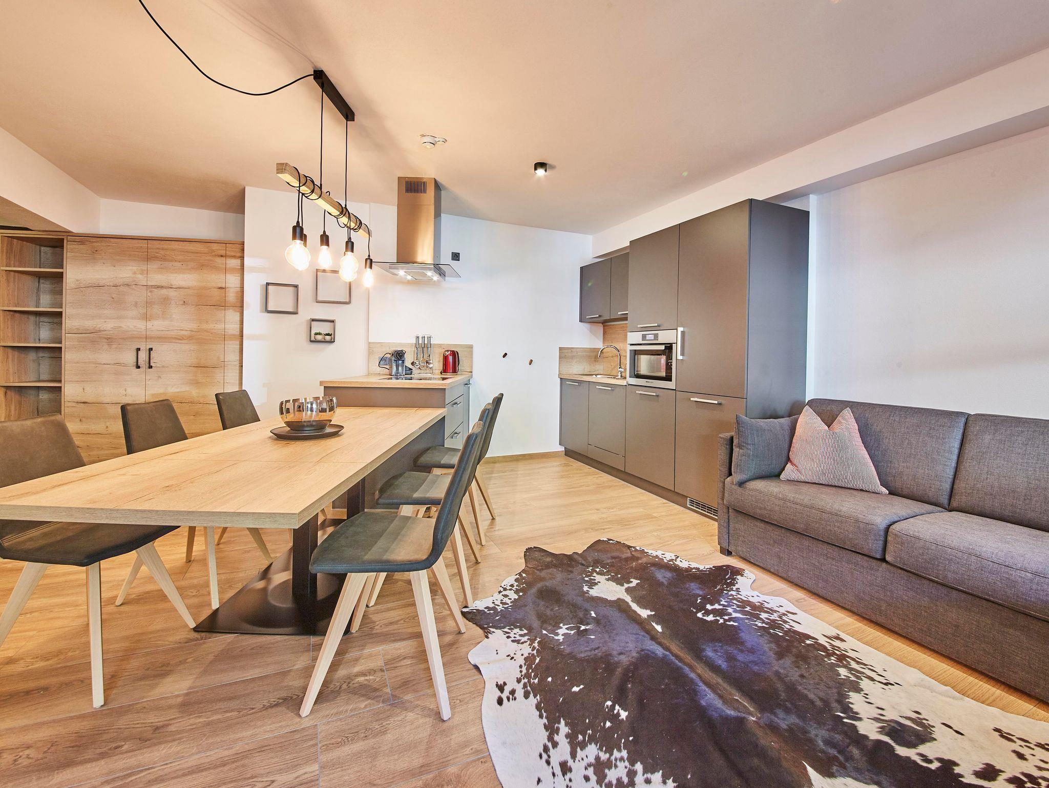 Willkommen im Premium Apartment Peak 5! Dieses großzügige Apartment bietet auf 75 m² Platz für bis zu 8 Personen und beeindruckt mit zwei stilvoll eingerichteten Schlafzimmern, die jeweils mit komfortablen Doppelbetten ausgestattet sind; eines der Zimmer verfügt zudem über ein Etagenbett. Die beiden modernen Badezimmer en suite sind mit Dusche, WC und einer eigenen Sauna ausgestattet. Hier oder im Wohnbereich mit Schlafsofa und voll ausgestatteter Küche können Sie nach einem aktiven Tag in den Bergen herrlich entspannen und neue Energie tanken.