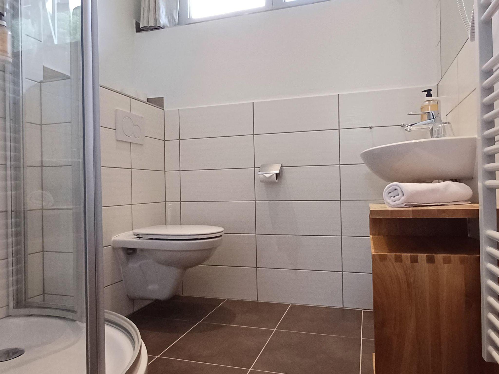 Das Zimmer bietet ein Badezimmer mit Dusche, WC und Föhn, teilweise ein Boxspringbett, eine Sitzecke, Balkon, WLAN und Sat-TV.