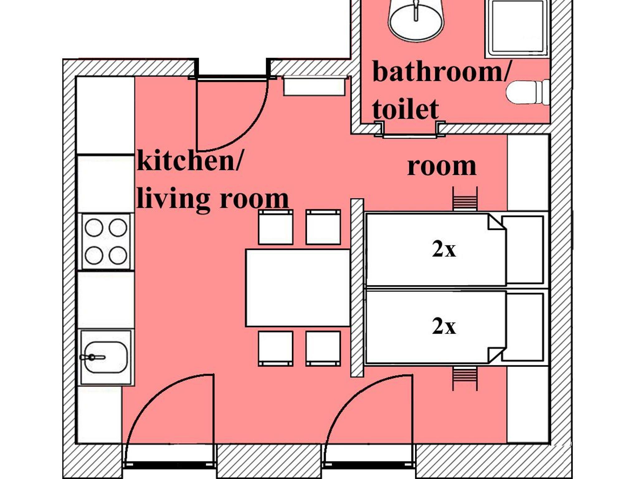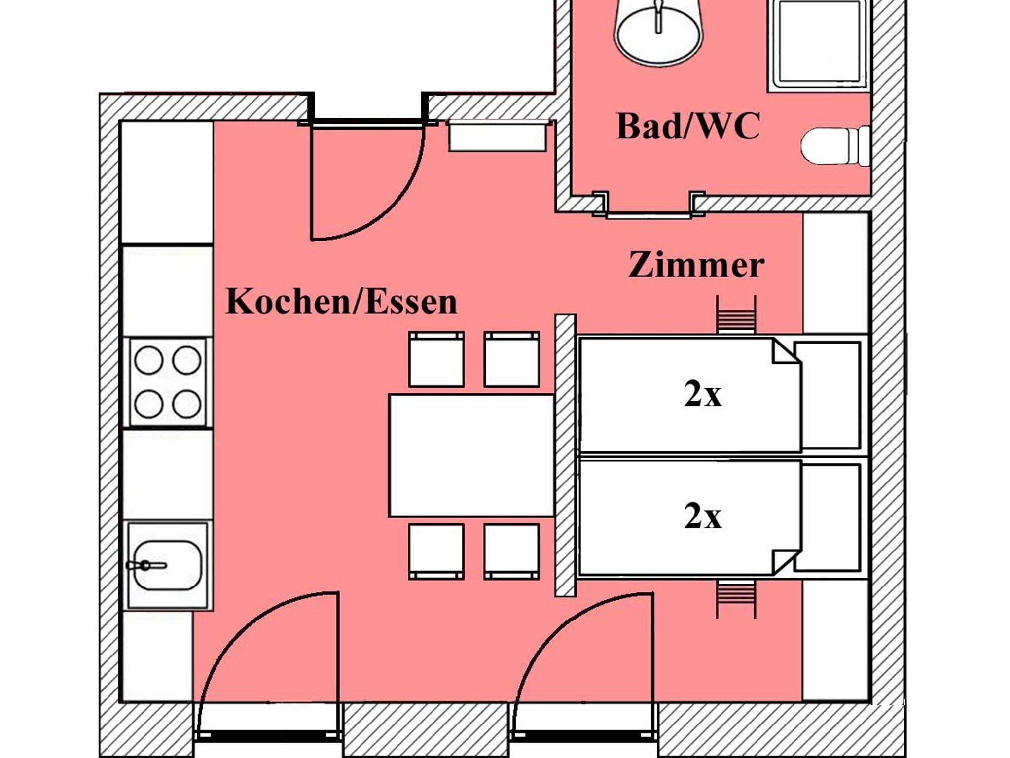 ~ 30 m2 für max. 3 Personen. Eine große Wohnung mit einer Wohnküche mit Küchenzeile mit Ceran Kochfeld, Mikrowelle, Kühlschrank und Kaffeemaschine. Esstisch mit 4 Stühlen, Sat-TV in der Wohnküche, ein Vierbettschlafzimmer mit deinem Doppelstockbett, Bad mit Dusche, Waschbecken und WC. Wohnung hat einen eigenen Balkonzugang.