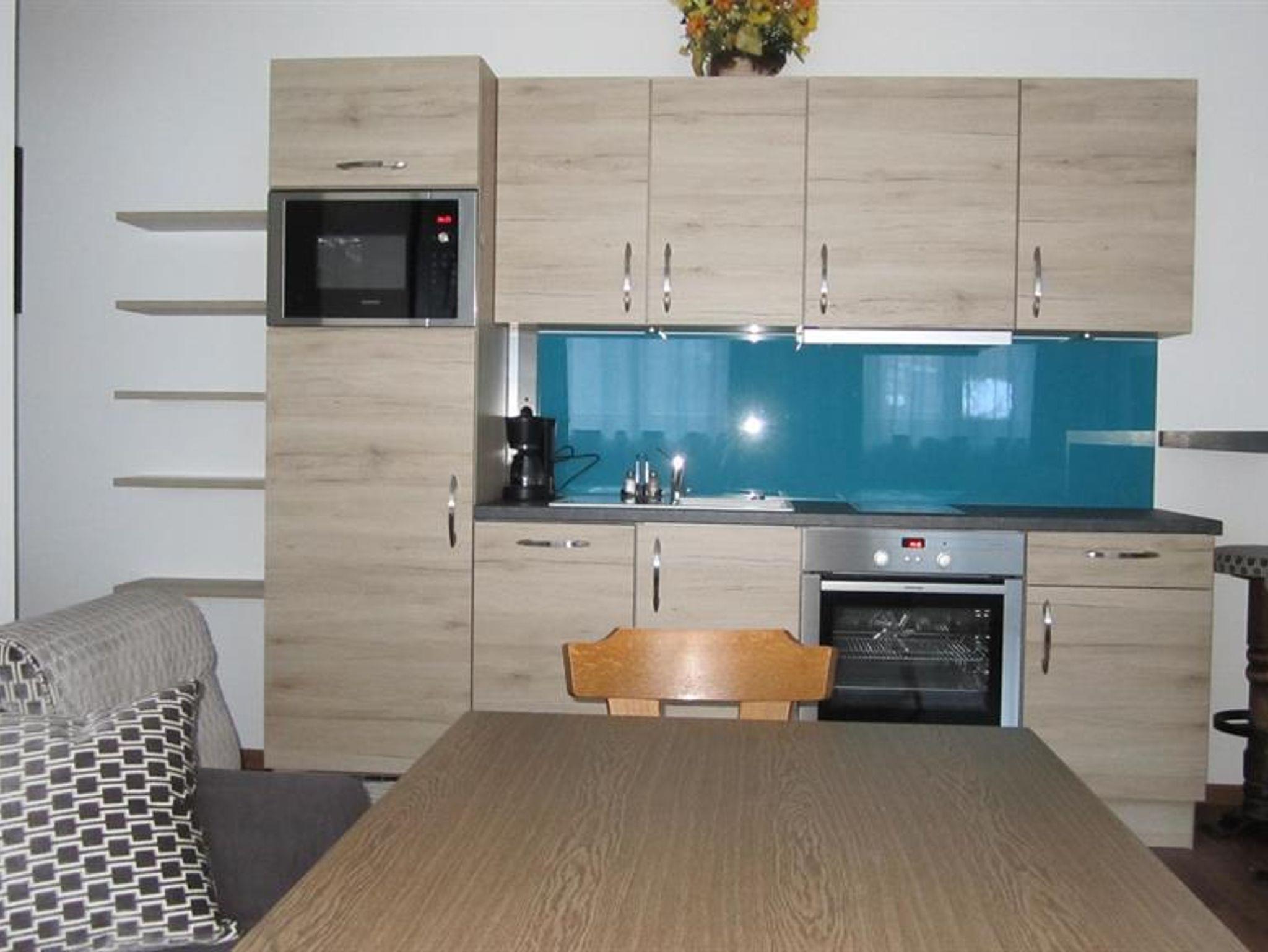 • Wohnschlafraum mit komplett eingerichteter Küchenzeile, Kühlschrank mit kleinem Gefrierfach, Filterkaffeemaschine, Wasserkocher, Geschirrspüler, Backrohr, Ceranfeld, Mikrowelle, Esstisch mit Stühlen, Doppelschlafsofa, SAT-TV, Safe, WLAN