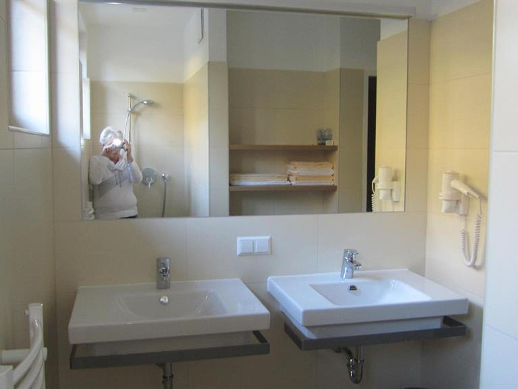 • Badezimmer mit Doppelwaschbecken, Dusche, Föhn und Handtuchtrockner,