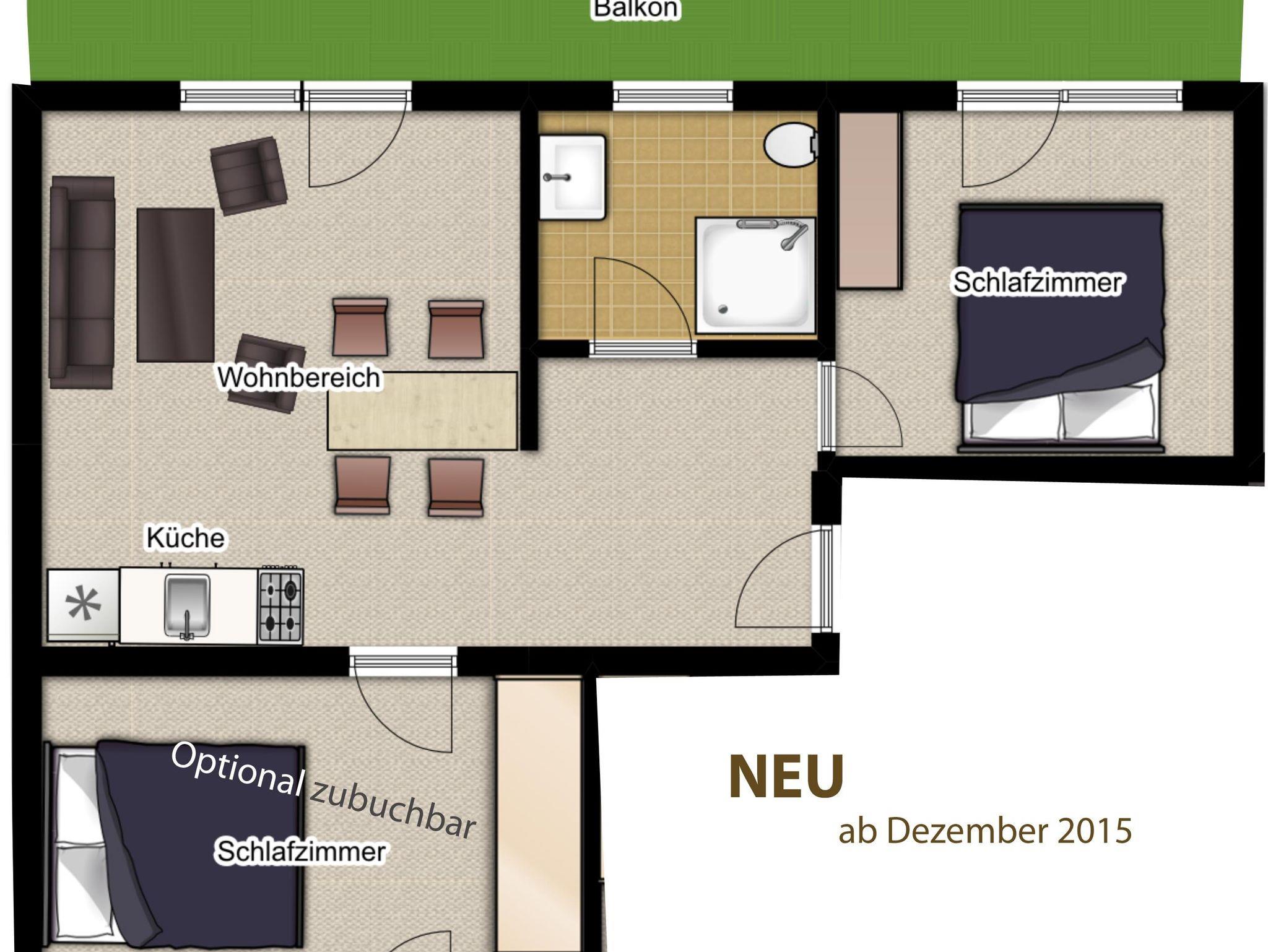 Eine größere Wohnung mit Balkon bietet 2 Schlafzimmer - die weitere Einrichtung ist gleich wie bei den beiden kleineren.