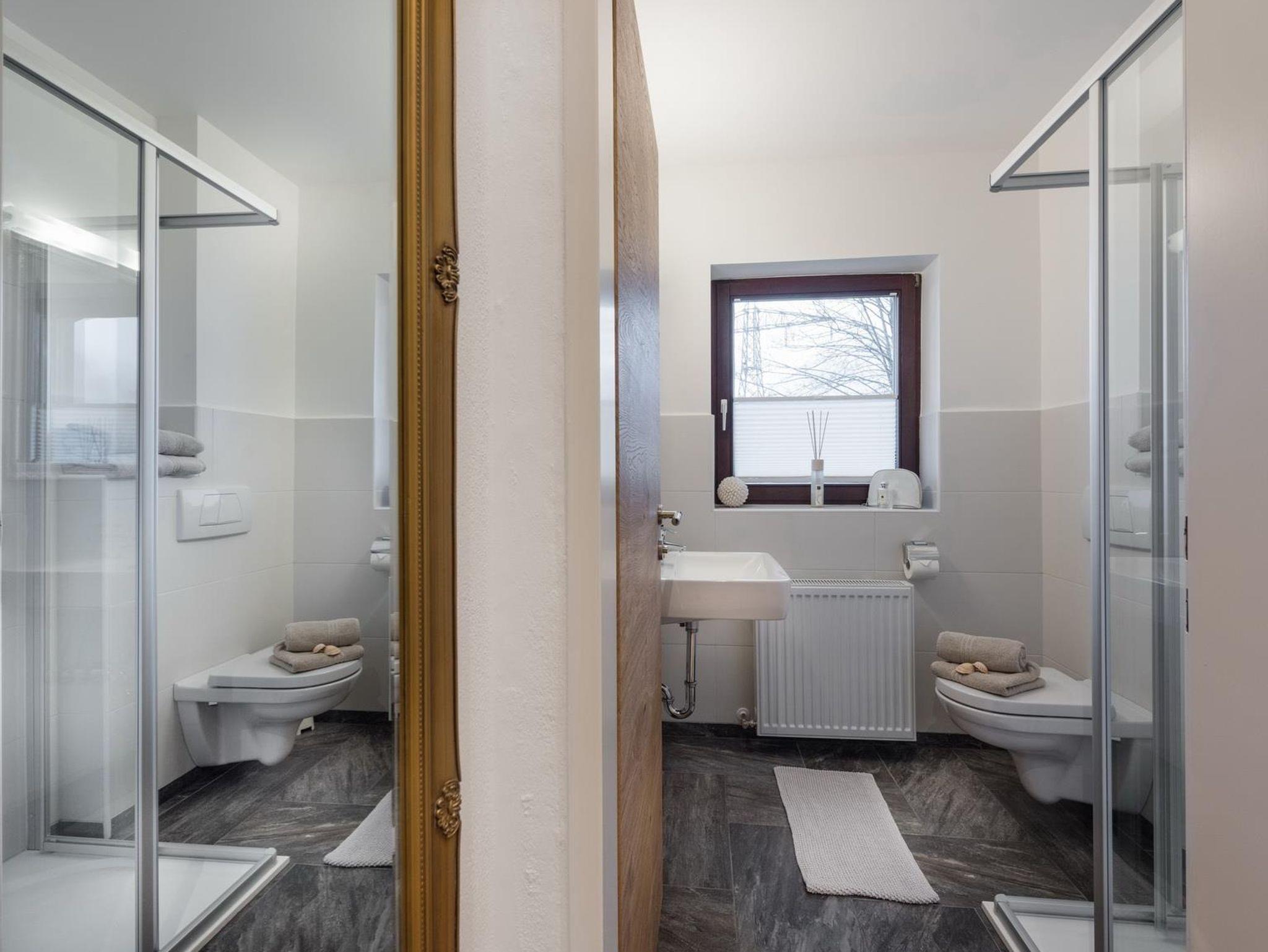 Im Erdgeschoss befindet sich darüber hinaus noch eine große Ferienwohnung mit 3 Schlafzimmern, 2 Bädern mit WC - eines mit Bidet und Badewanne und eines mit großer Dusche - einem sehr großen Küchen-Esszimmerbereich, der durch einen Kachelofen vom Wohnzimmer getrennt ist.