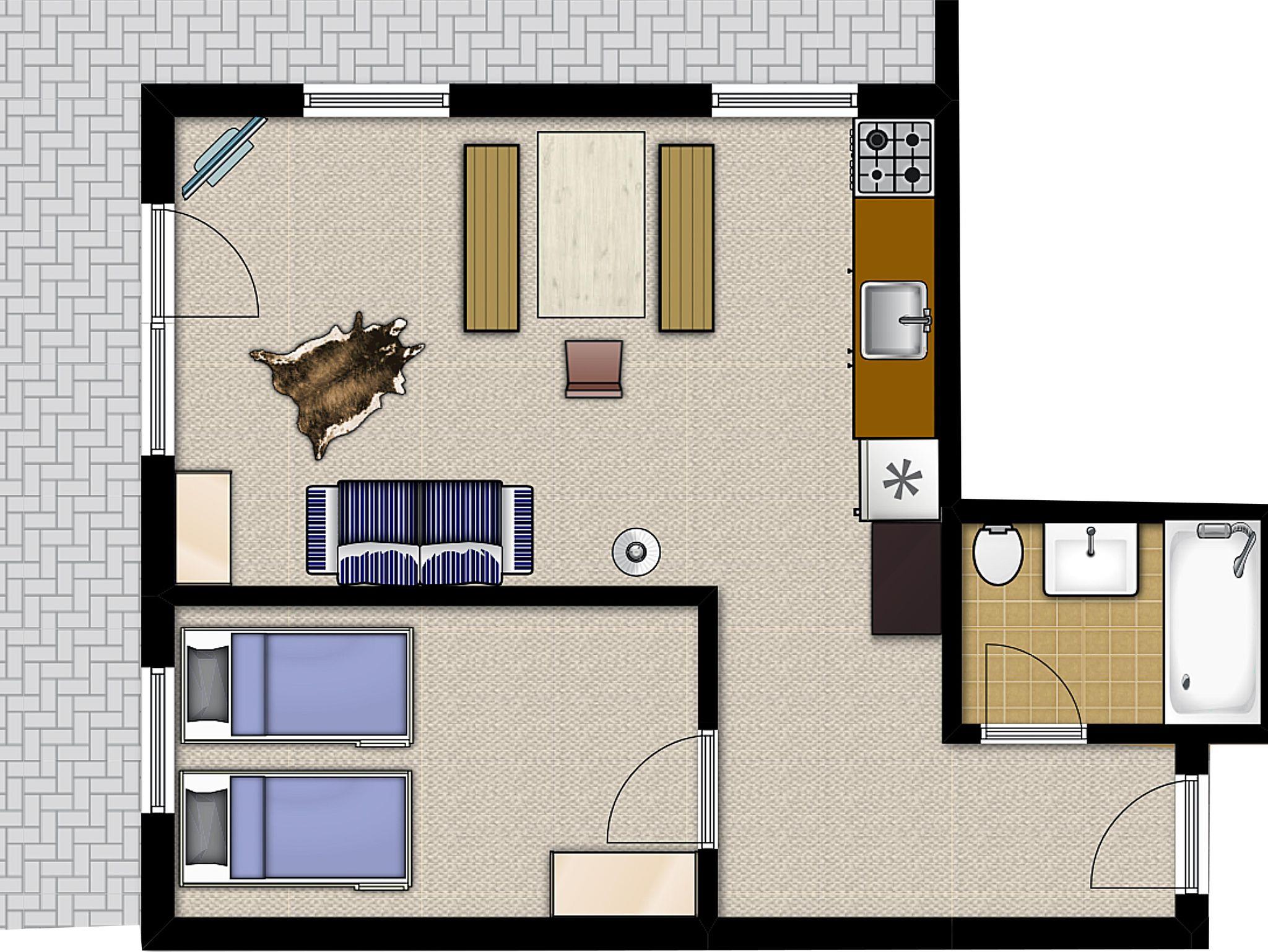 Gemütliches Appartement mit 50 qm Wohnfläche mit Schlafzimmer (2-bettig mit Zusatzbett), Wohnschlafzimmer, Bad/WC und Küche sowie Terrasse. Hochwertige Ausstattung. High-Speed-W-LAN & Flat-Screen TV mit Internetanbindung. Dieses Appartement bietet Platz für 2 - 5 Personen.