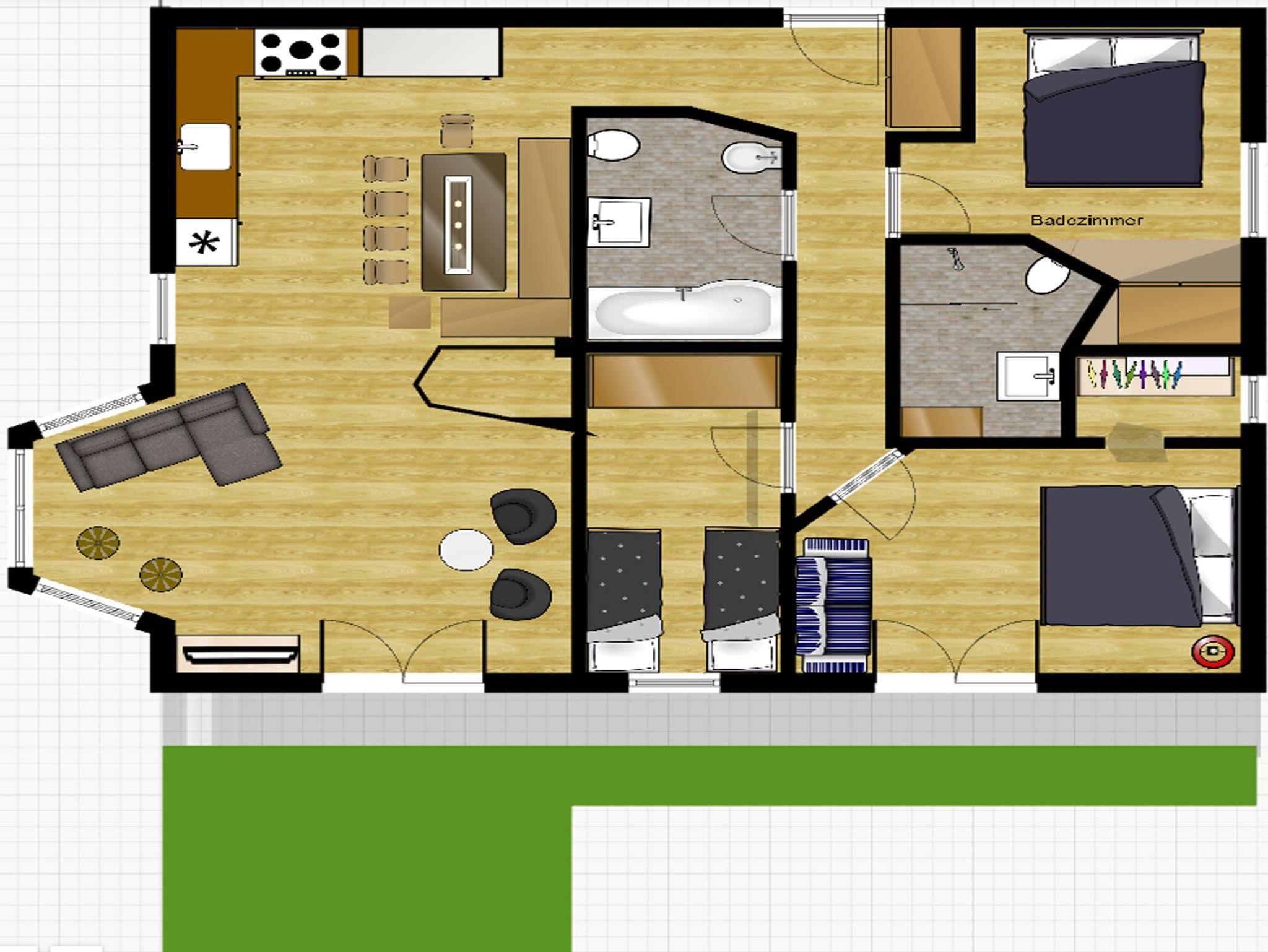 Eine größere Wohnung mit Balkon bietet 2 Schlafzimmer - die weitere Einrichtung ist gleich wie bei den beiden kleineren.