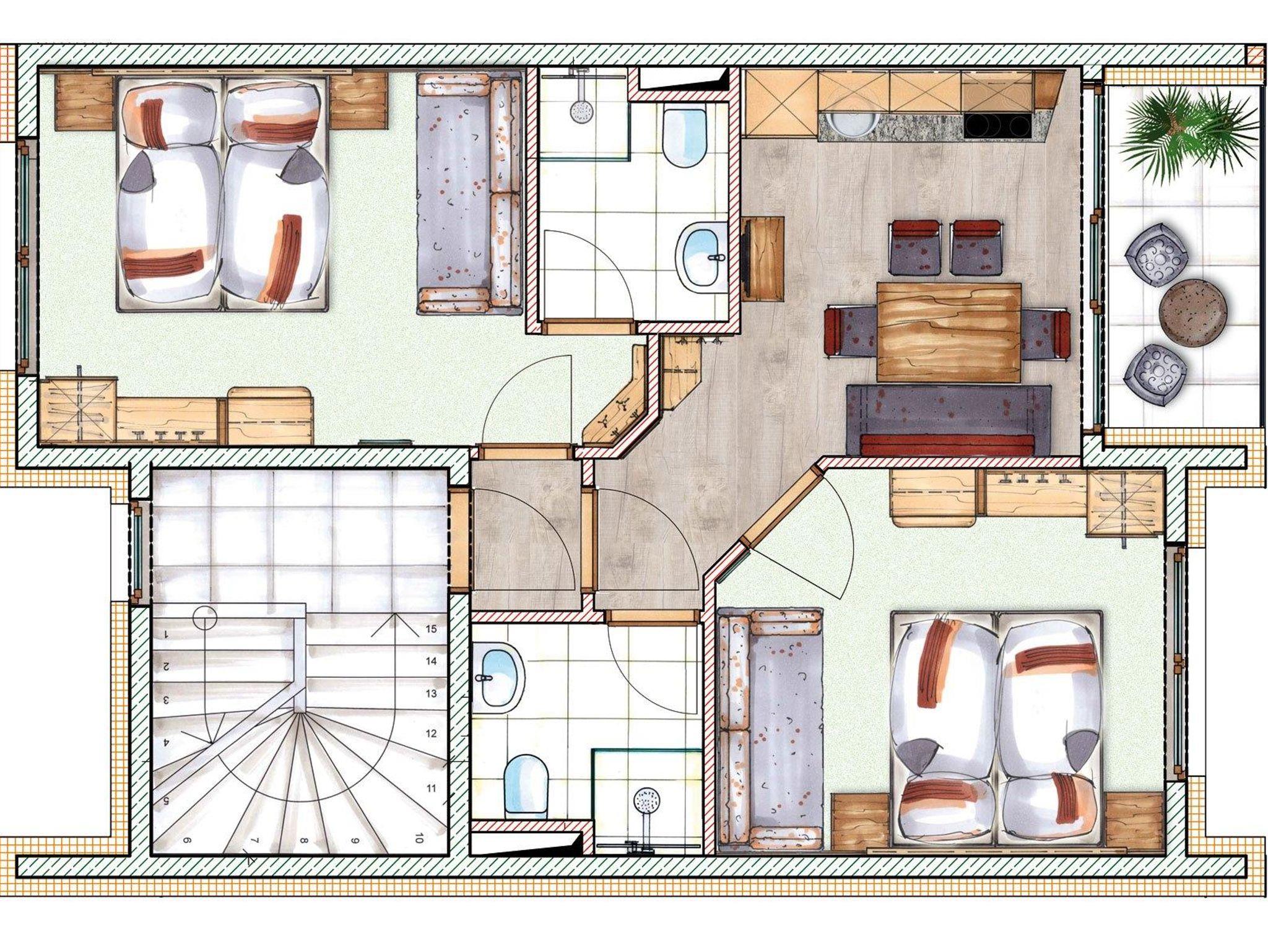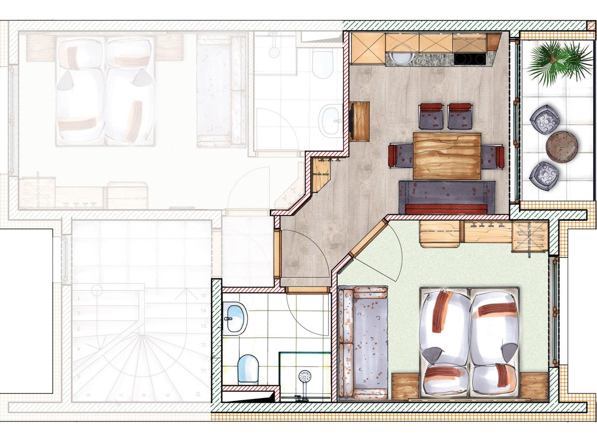 Rund 40 m² Wohnfläche mit 1 komfortablen Schlafzimmer, Bad mit Dusche & WC, einer voll ausgestatteten Wohnküche, einem Vorraum & einer sonnigen Terrasse oder Balkon. Für angenehme Wärme sorgt unsere Fußbodenheizung, hochwertige Matratzen bieten kuschelige Momente und hohen Schlafkomfort. Traumhafte Aussichten, Helligkeit und ein Gefühl von Freiheit geben Ihnen unsere großflächigen Glaselemente.