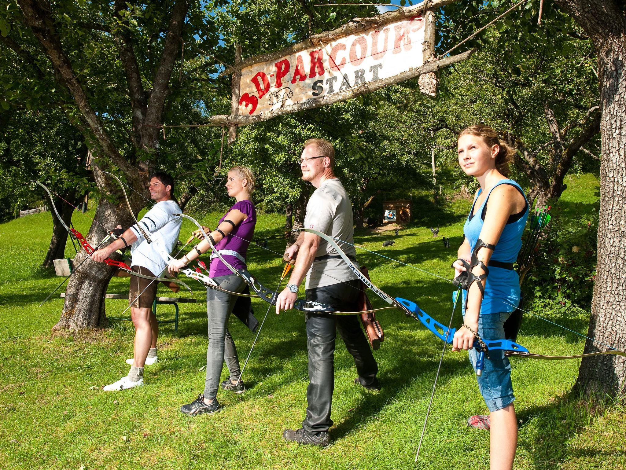 Appartement 60m2 für 4-5 Personen mit 2 Schlafräume, 1 Wohnraum mit Küchenblock incl. Grundausstattung an Geschirr u. Geschirrspüler, getrennte DU/WC , SAT-TV, Radio, Telefon, Safe, W-Lan, und sonnenseitige Terrasse.NEU! Wellness und Beauty: Die Benützung des hauseigenen Wellnessbereiches ist 3x wöchentlich im Preis inkludiert (Dampfbad, Sauna, Ruheraum, Fitnessraum). Behandlungen in unserem Kosmetiksalon können extra gebucht werden. 3-D Jagdbogenparcours: Wir sind aktive Bogenschützen und bieten unseren Gästen einen hauseigenen 3-D Jagdbogenparcours, der gleich hinter dem Haus beginnt. Ausrüstungsverleih und Grundkurse sind, je nach Witterung, auch im Winter möglich.