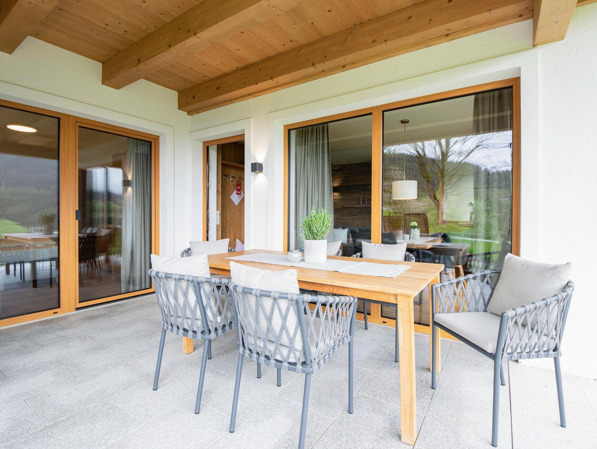 Nach einem aktiven Tag wartet Ihre private Terrasse mit einem einmaligen Blick auf den Hochkönig auf Sie. Machen Sie es sich gemütlich und genießen Sie die letzten Sonnenstrahlen des Tages – ein Sonnenuntergang zum Träumen.