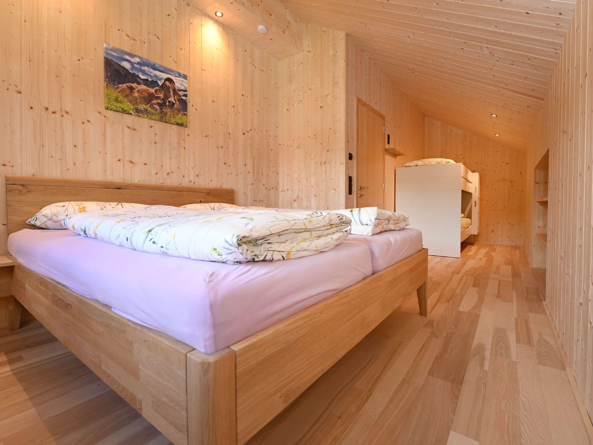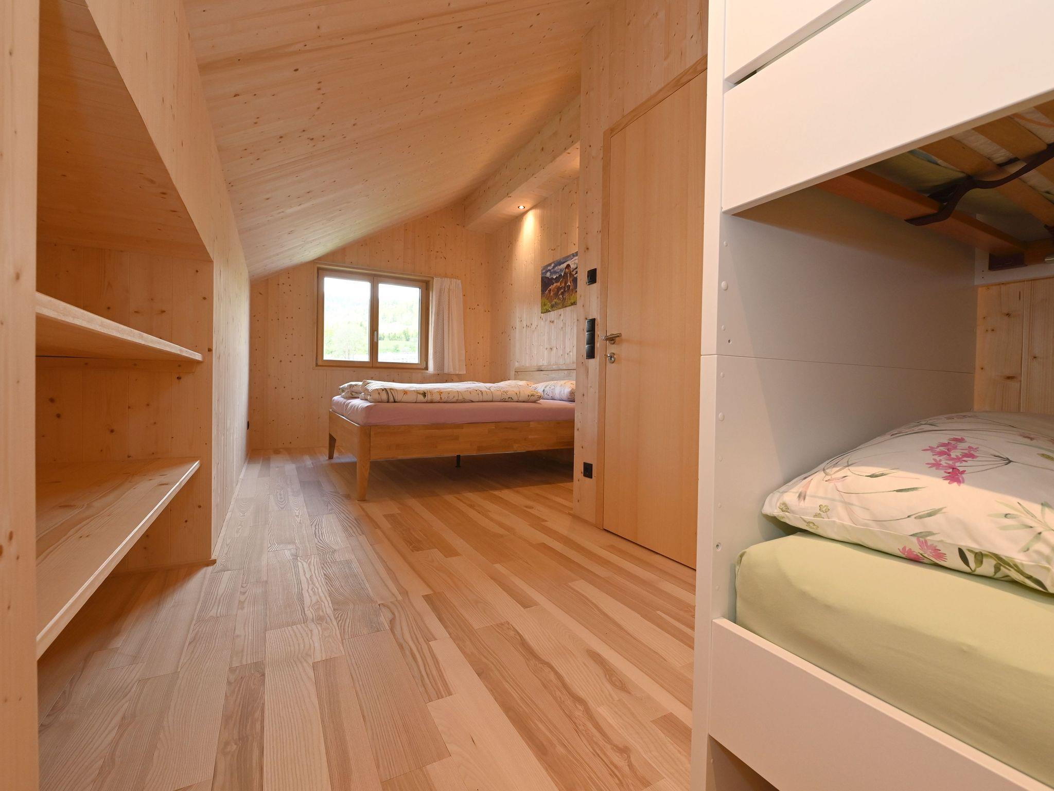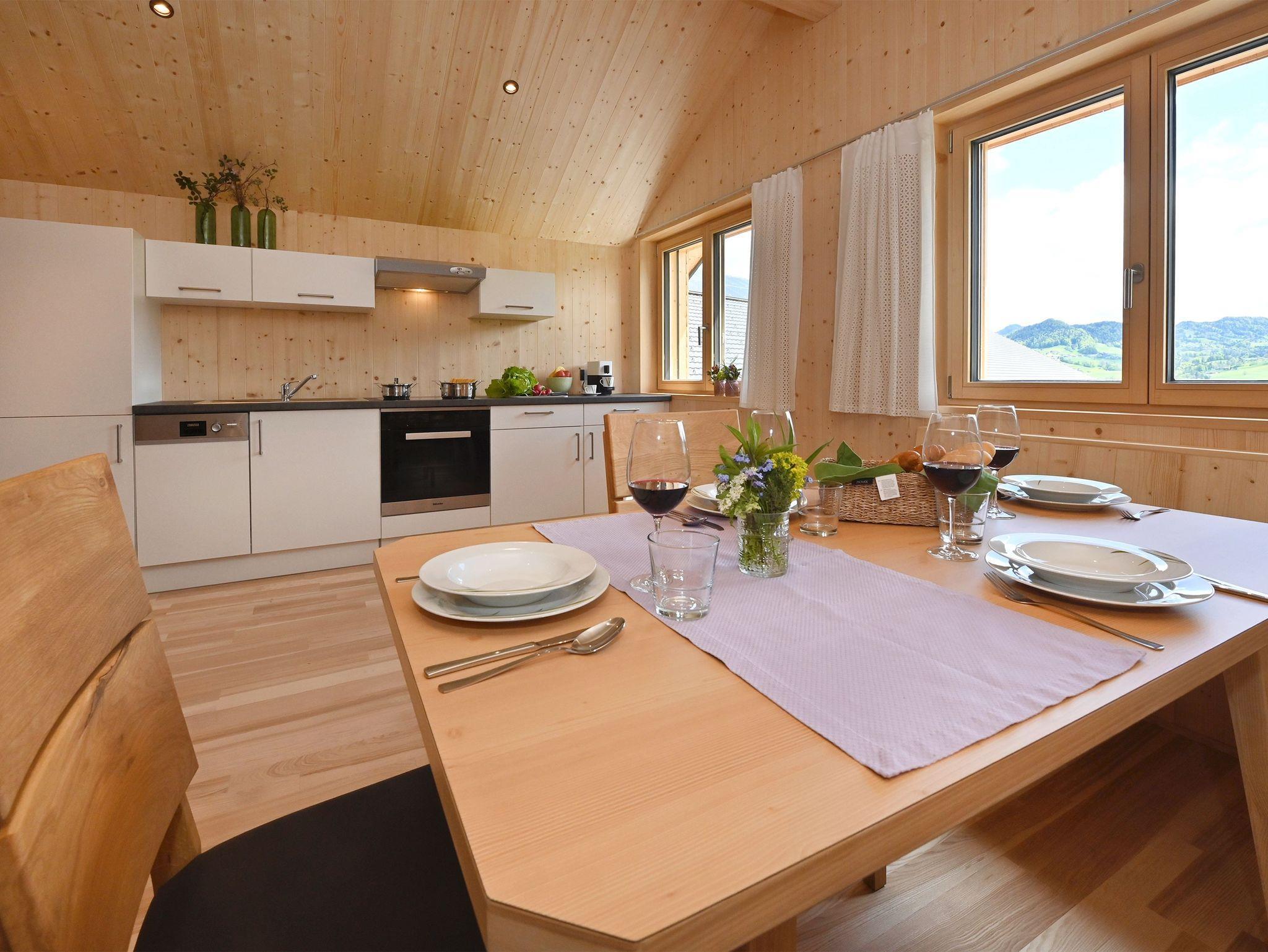 Neue 70m² große Ferienwohnung mit unbehandeltem Vollholzboden und Fichtentäfer, das für gemütliches Flair sorgt. Vollausgestattete Wohnküche inkl. Spülmaschine, Wasserkocher und Kapselkaffeemaschine (Kapseln können vor Ort gekauft oder mitgebracht werden) und einem Sofa, das sich zur hochwertigen Schlafcouch (150cm*190cm) umwandeln lässt. Zusätzlich ein Schlafzimmer mit Doppelbett (180cm *190cm) und einem Stockbett (90cm* 190cm), das sich auch für Erwachsene eignet. Modernes Badezimmer. Separate Eingangstüre in die Wohnung – für Ihre Privatsphäre. Geräumige Garderobe und Kofferraum. Eigener Sitzplatz im großen Garten. Spielplatz und Gartenspiele für Kinder.