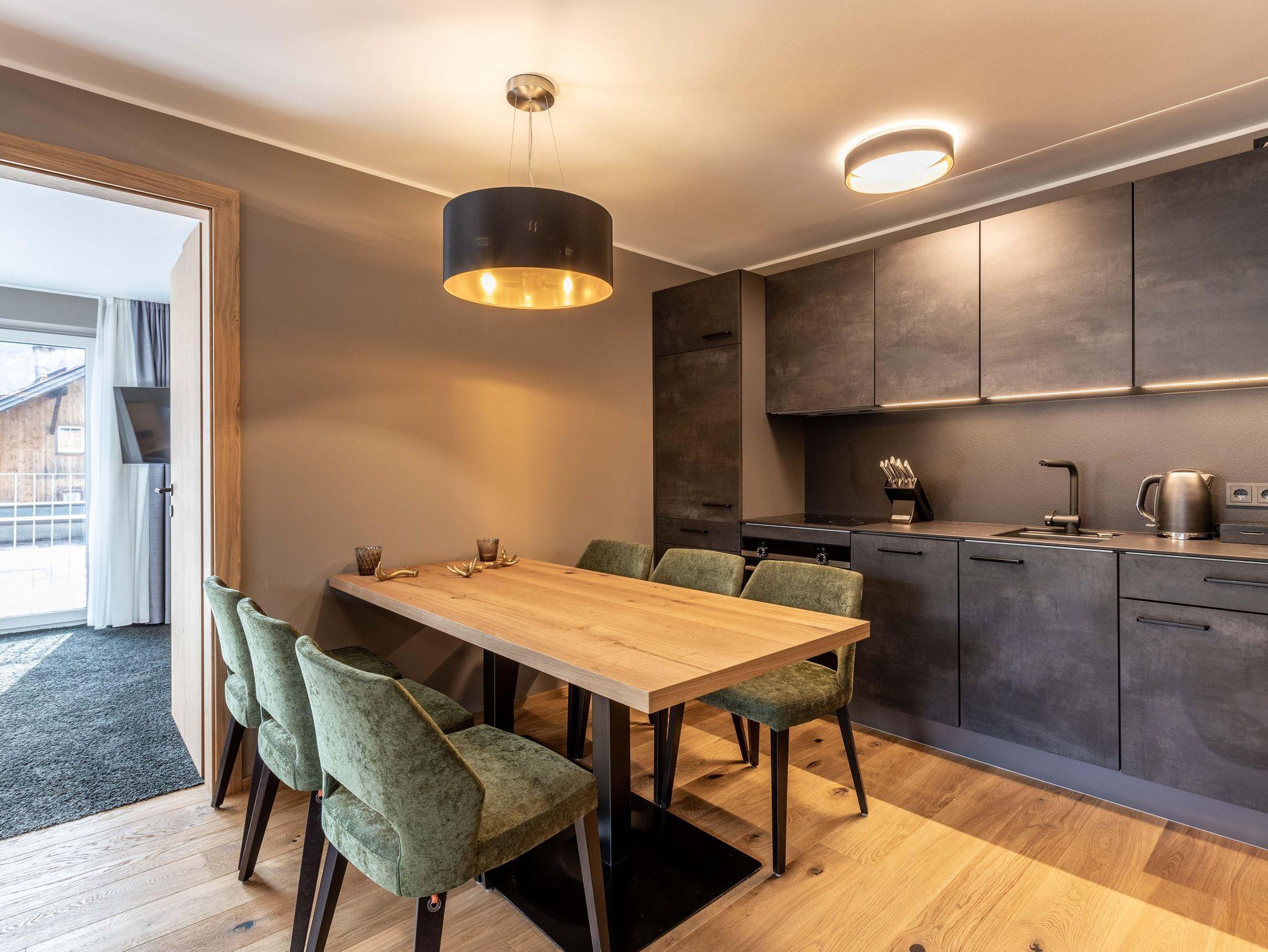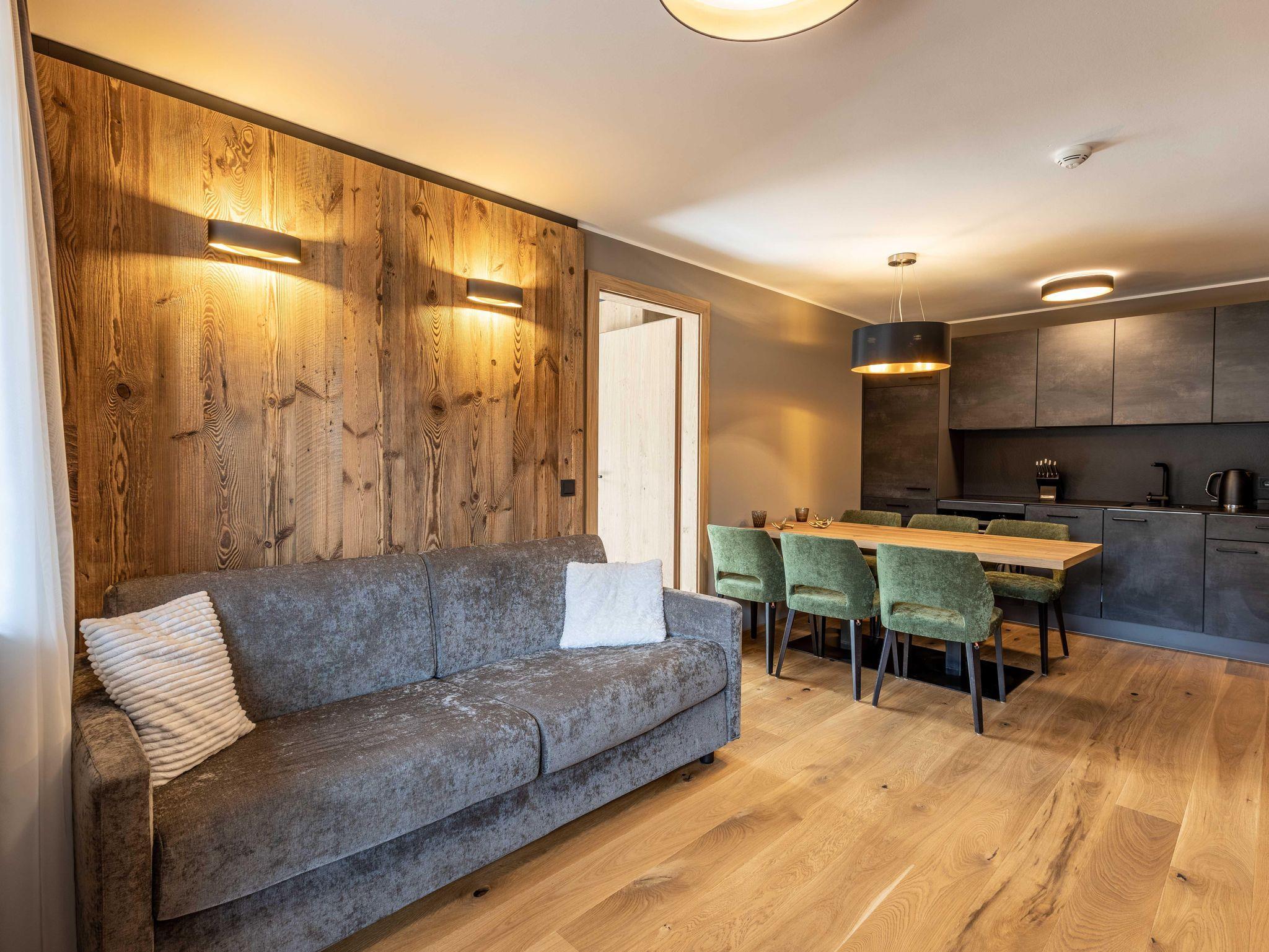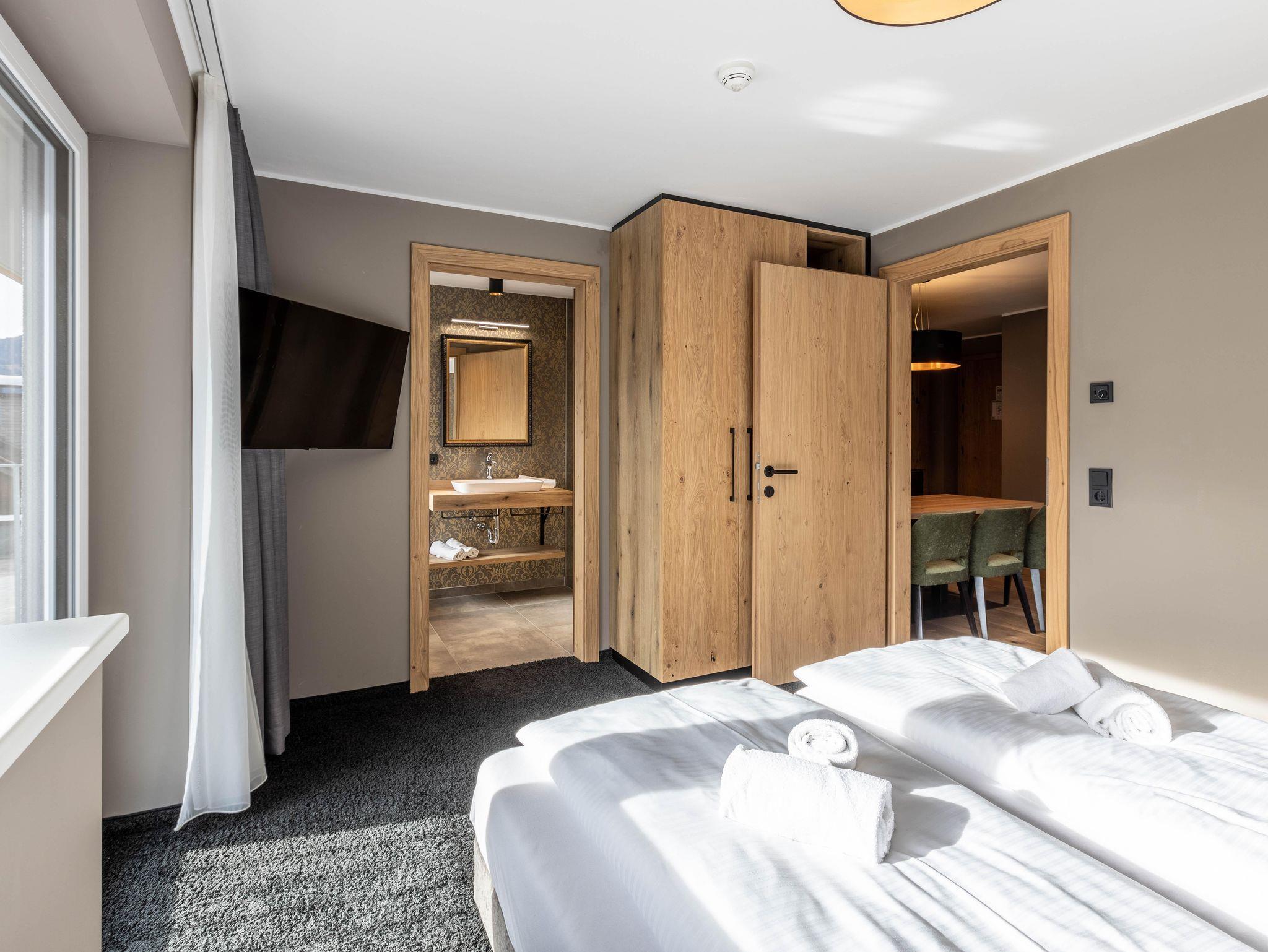 Das Apartment bietet Platz für 6 Personen und bietet Wohnküche, 2 Schlafzimmer (Boxspringbetten - 1x Zugang Balkon/ 1x Terrasse+eigenes Bad), 2 Badezimmer, separates WC + Balkon. Der Eingangsbereich, mit Garderobe, führt direkt in die Wohnküche, welche mit Küchengeräten, Kühl-Gefrierkombi sowie Nespresso Kaffeemaschine ausgestattet ist. Der Esstisch bietet Platz, um gemeinsam ein selbstgekochtes Mahl zu genießen. Im anschließenden Wohnbereich befinden sich TV, Kleiderschrank und Ausziehsofa.