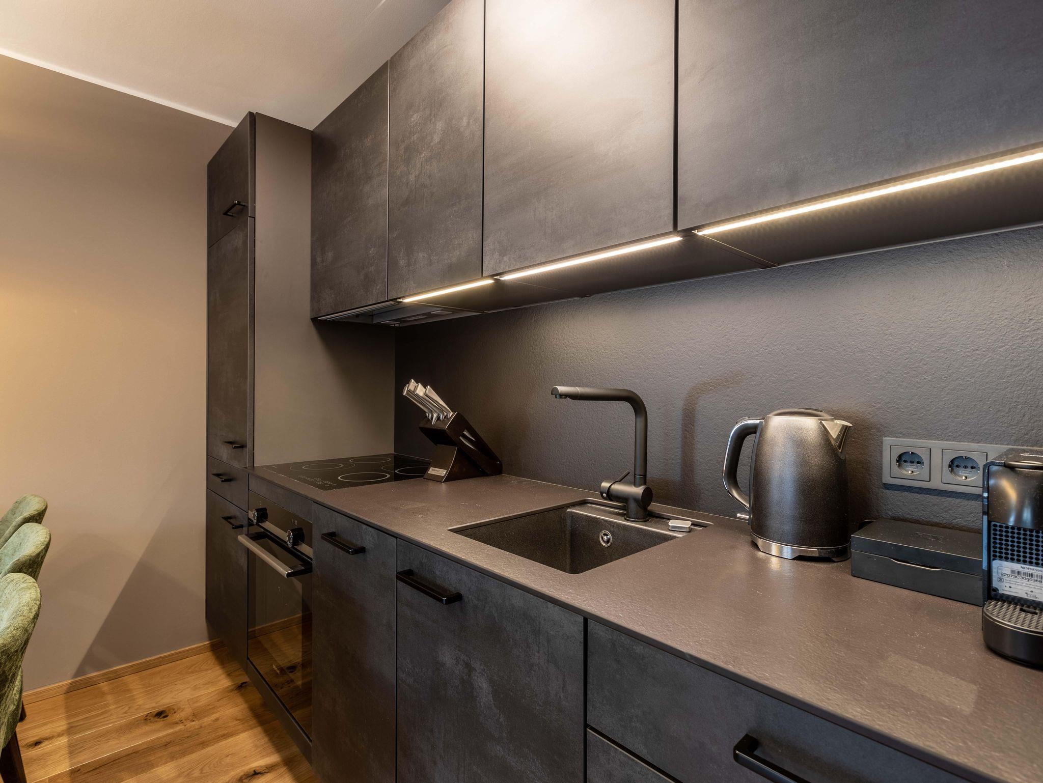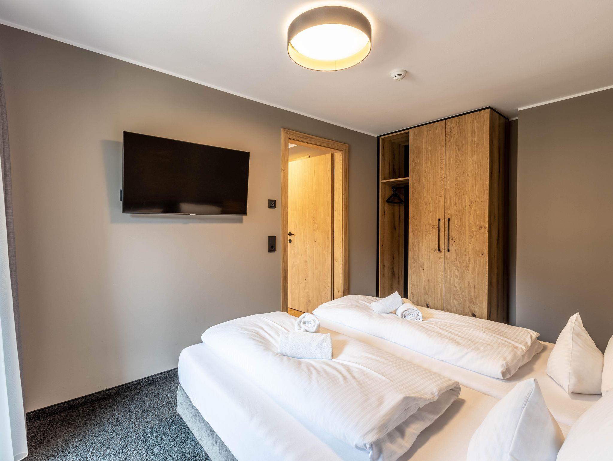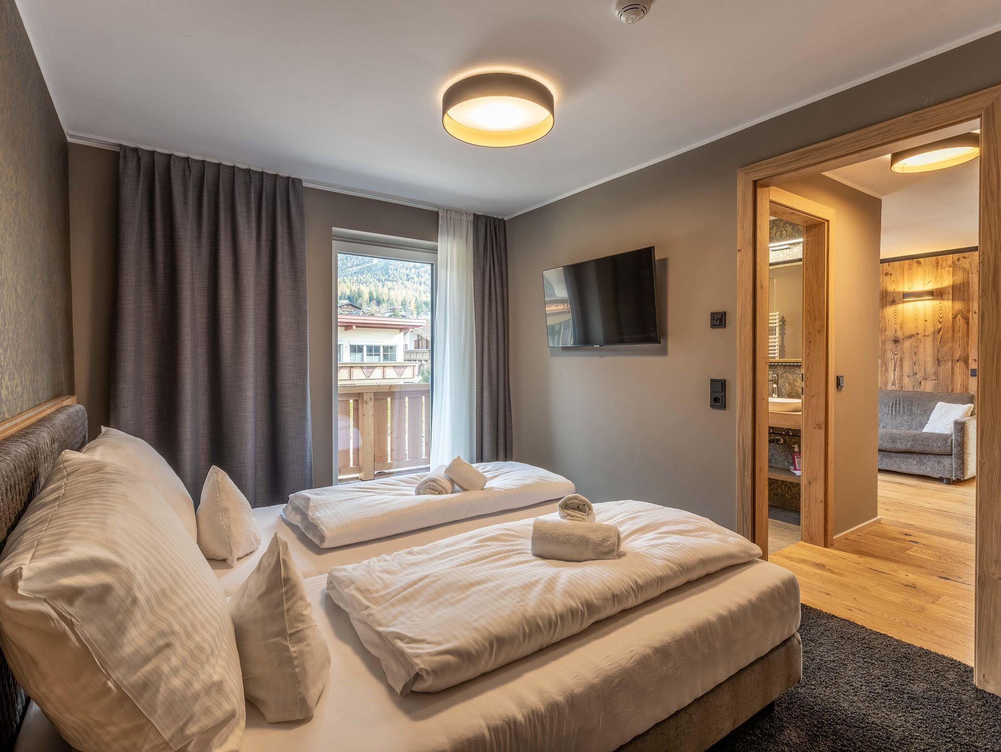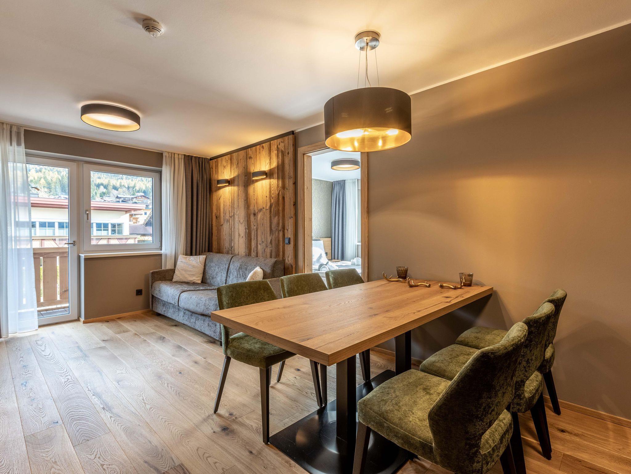 Das Apartment bietet Platz für 6 Personen und bietet Wohnküche, 2 Schlafzimmer (Boxspringbetten - 1x Zugang Balkon/ 1x Terrasse+eigenes Bad), 2 Badezimmer, separates WC + Balkon. Der Eingangsbereich, mit Garderobe, führt direkt in die Wohnküche, welche mit Küchengeräten, Kühl-Gefrierkombi sowie Nespresso Kaffeemaschine ausgestattet ist. Der Esstisch bietet Platz, um gemeinsam ein selbstgekochtes Mahl zu genießen. Im anschließenden Wohnbereich befinden sich TV, Kleiderschrank und Ausziehsofa.