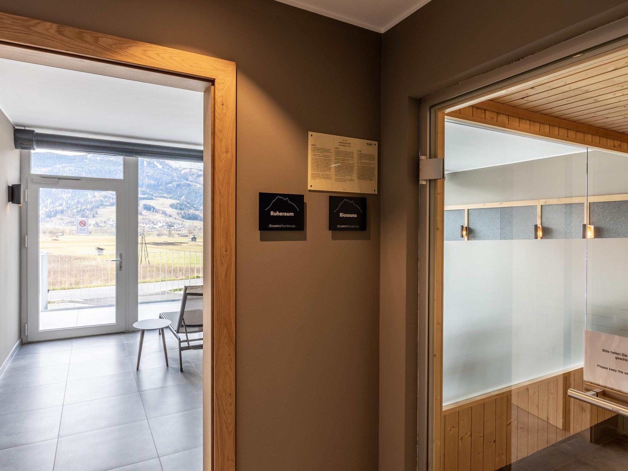 Zugspitz Residences liegt im Herzen von Ehrwald, direkt neben dem Golfplatz und in unmittelbarer Nähe des weit bekannten Ehrwalder Schigebiets. Dieser einzigartige, familienfreundliche Topspot garantiert ganzjährig Sport- und Freizeiterlebnisse der besonderen Art. Die bequem vom Haus aus zu erreichende Zugspitz Arena mit 56 Bergbahnen bietet auf 142 Pistenkilometern abwechslungsreiches Skivergnügen in allen Schwierigkeitsgraden! Des Weiteren sind eine problemlose Anbindung (Flughafen Innsbruck, 75 km - Flughafen München (DE), 147 km - Flughafen Salzburg, 196 km - Flughafen Zürich (CH), 200 km) und diverse Ausflugsziele (Bayrische Königsschlösser, Seefeld, Ötzi Dorf, Swarovski Kristallwelten, Innsbruck uvm.) gegeben. Parkmöglichkeiten sind rund um die Residenz vorhanden. Für Körper und Seele besteht im Erdgeschoß ein exklusiver Wellnessbereich mit Indoor-Infinity-Pool, finnischer Sauna, Bio-Sauna sowie Infrarotkabine, Regenerationsdusche und einem Ruheraum für totale Entspannung. Der Außenbereich animiert im Sommer zum Relaxen in der Sonne und im Winter ist dort Erfrischung nach einem ausgiebigen Saunagang möglich.