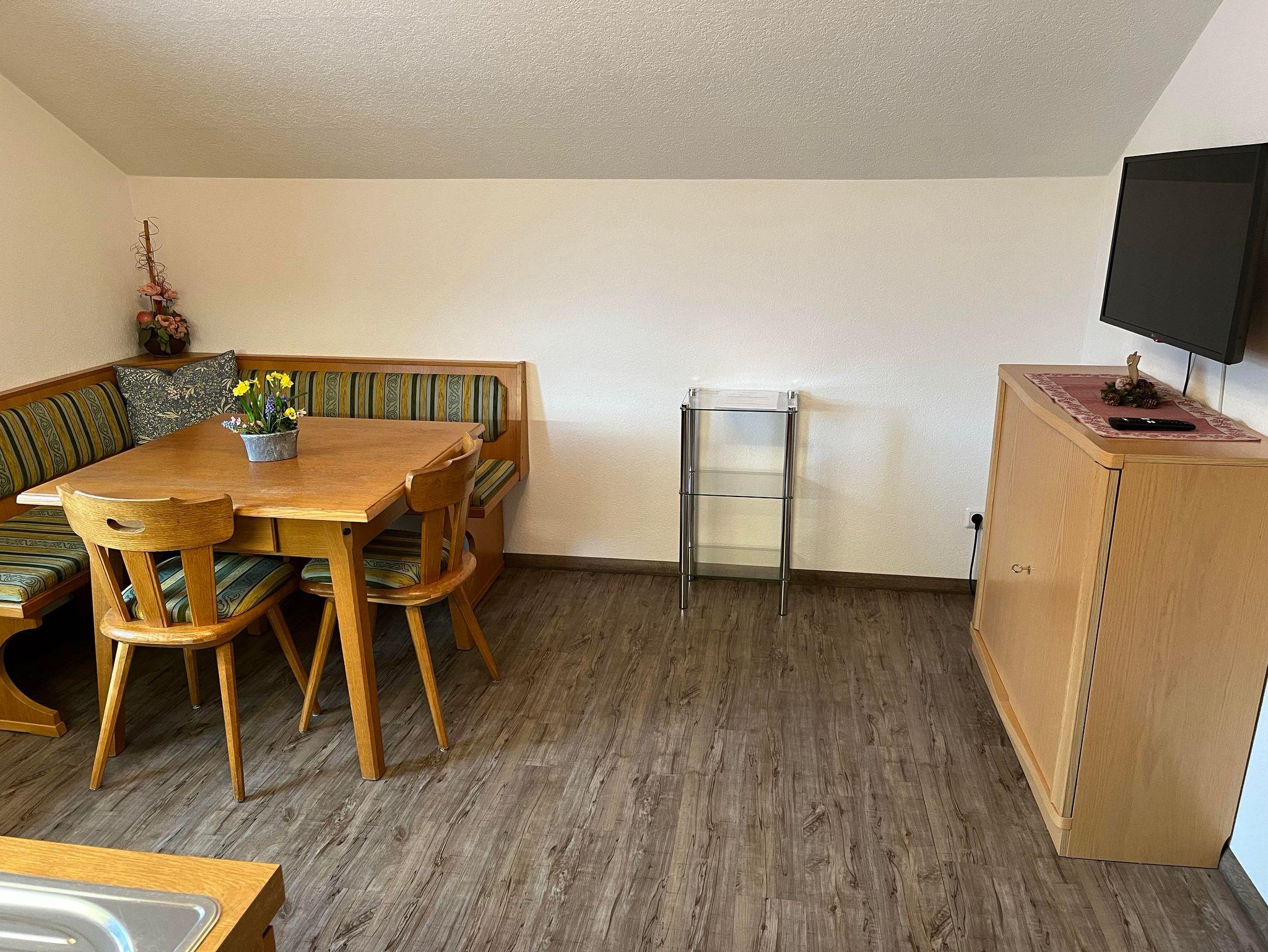 Die Ferienwohnung beinhaltet ein Schlafzimmer, ein Wohn-Schlafzimmer, eine Dusche mit WC, eine Wohnküche und natürlich TV mit Sat. Sie hat südliche Lage mit großem Balkon.