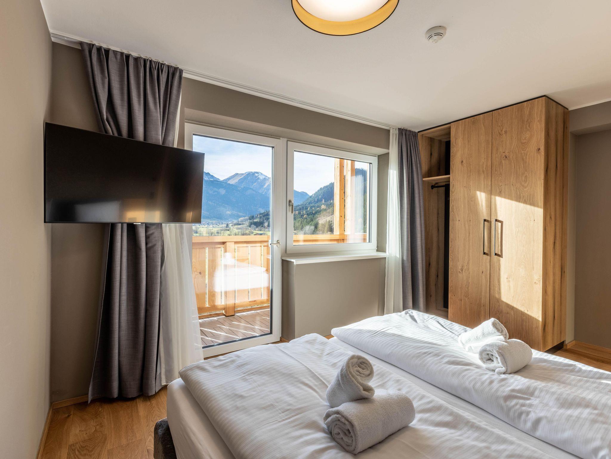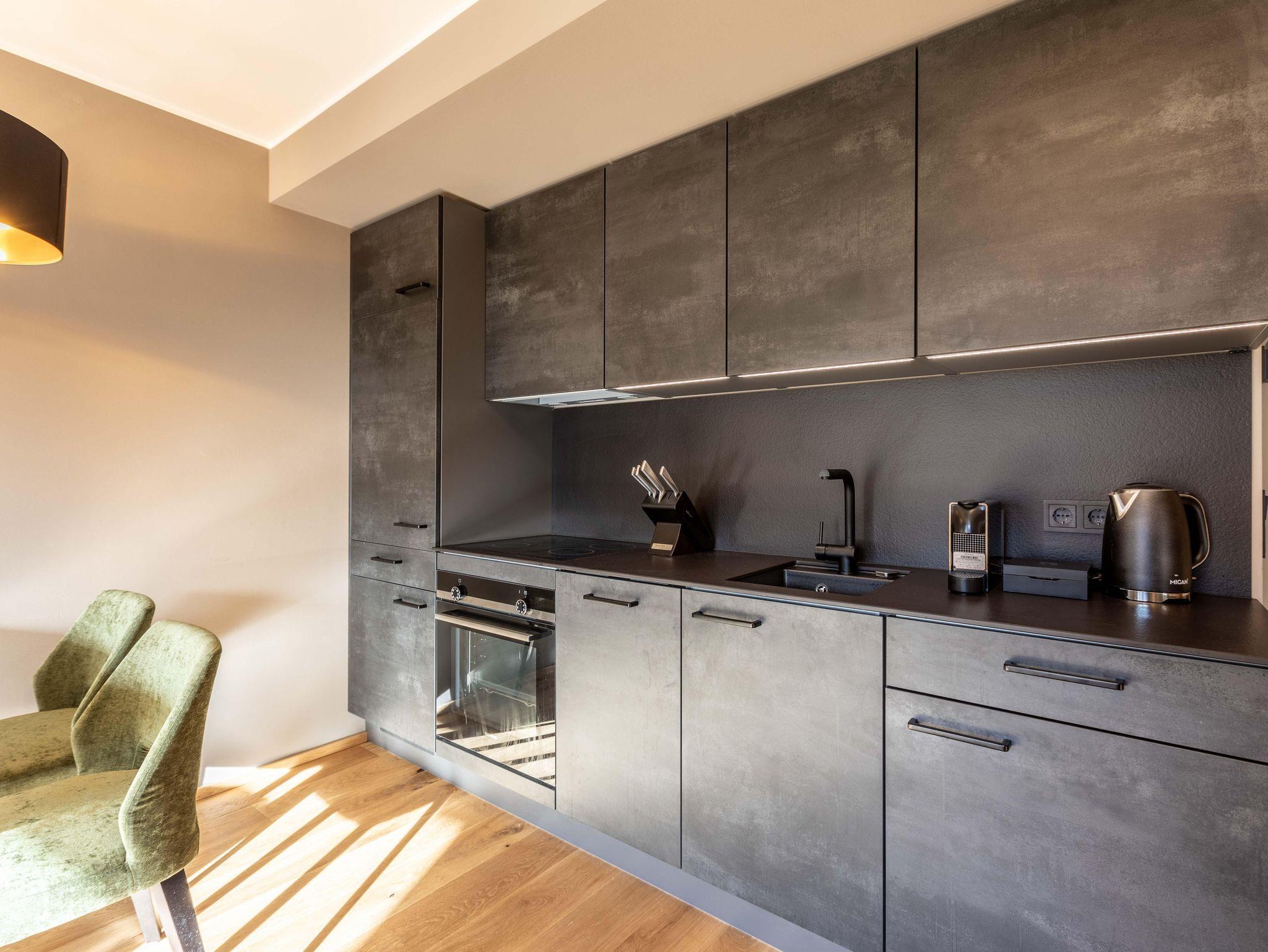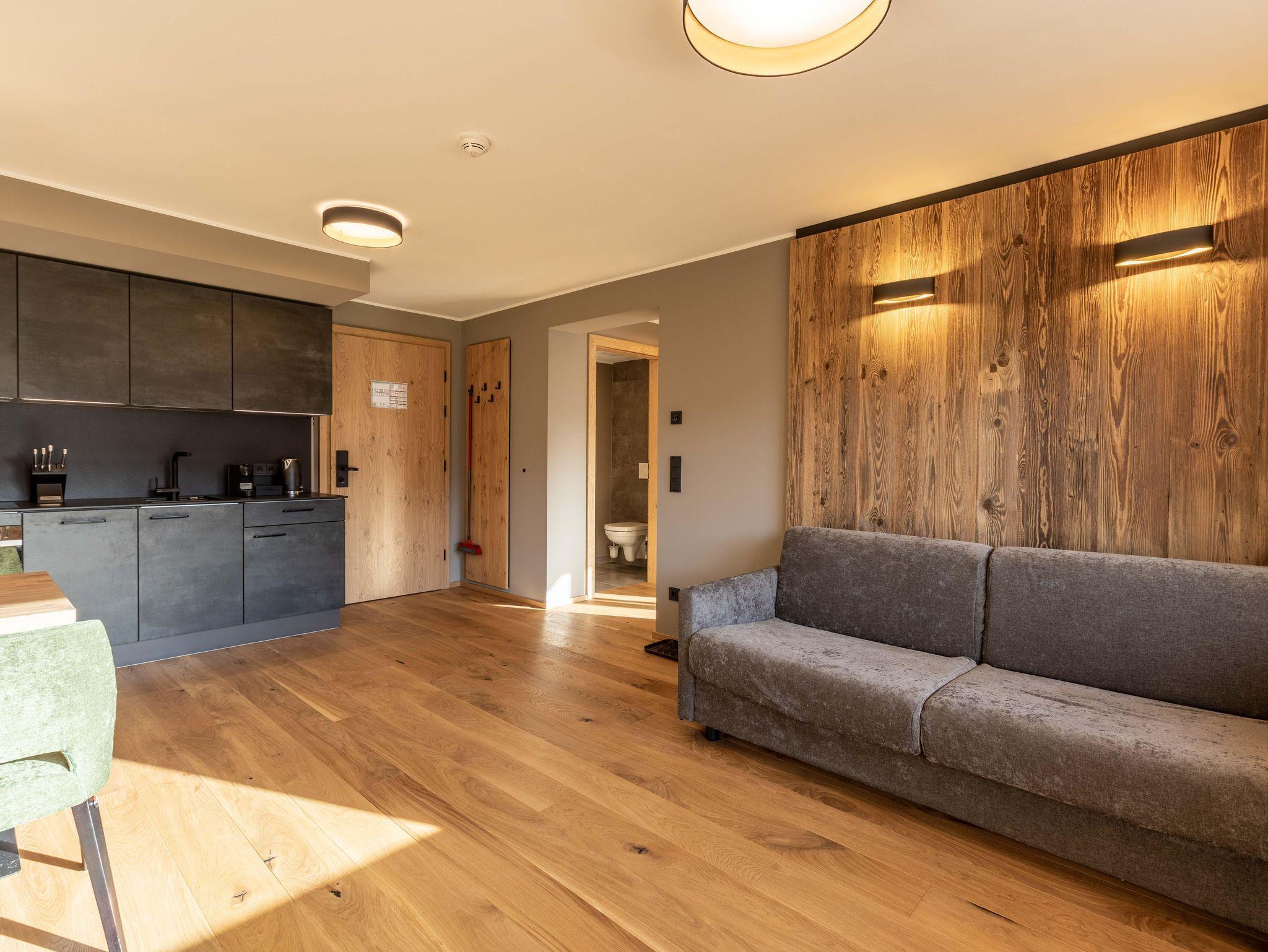 Das Apartment hat Platz für 4 Personen und bietet Wohnküche, Schlafzimmer (Boxspringbett und Balkonzugang), Bad und separates WC. Der Eingangsbereich, mit Garderobe, führt direkt in die Wohnküche mit Essbereich (Balkongzugang), welcher mit Esstisch, TV, Kleiderschrank und einem Ausziehsofa aufwartet. Die angrenzende Küche ist mit Küchengeräten, Kühl-Gefrierkombi sowie Nespresso Kaffeemaschine ausgestattet und verfügt außerdem über Küchengeschirr inklusive Töpfe und Pfannen.