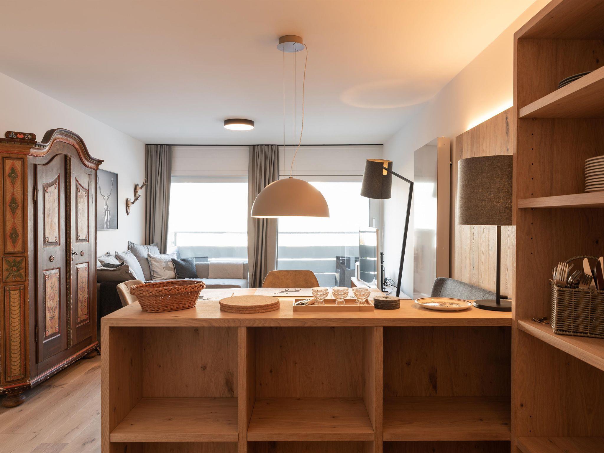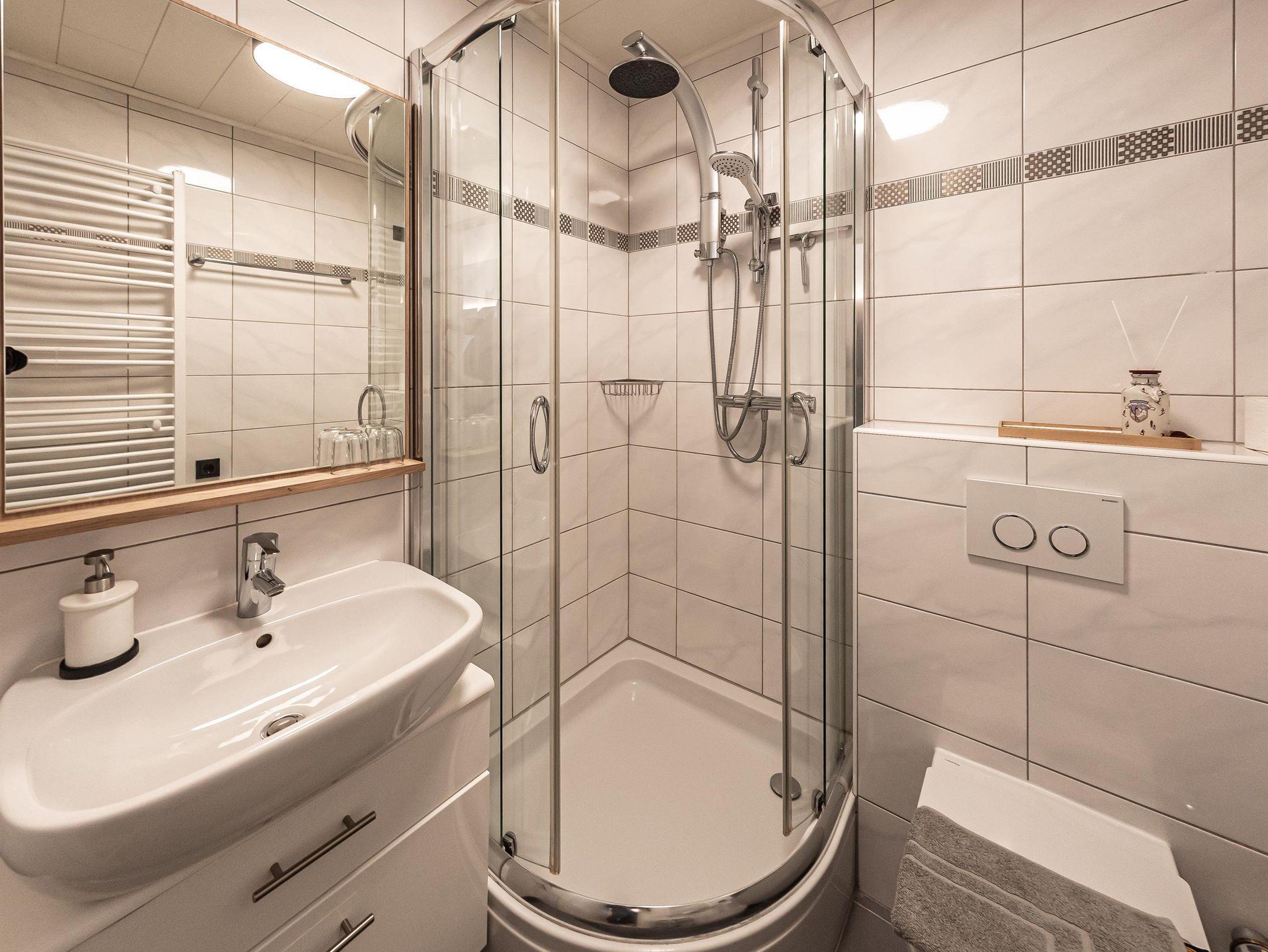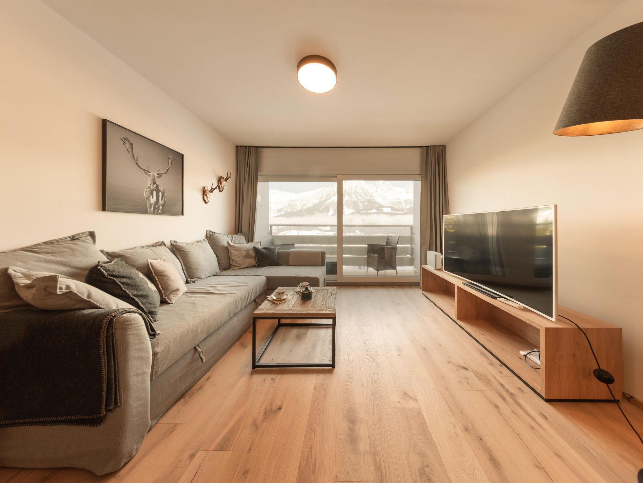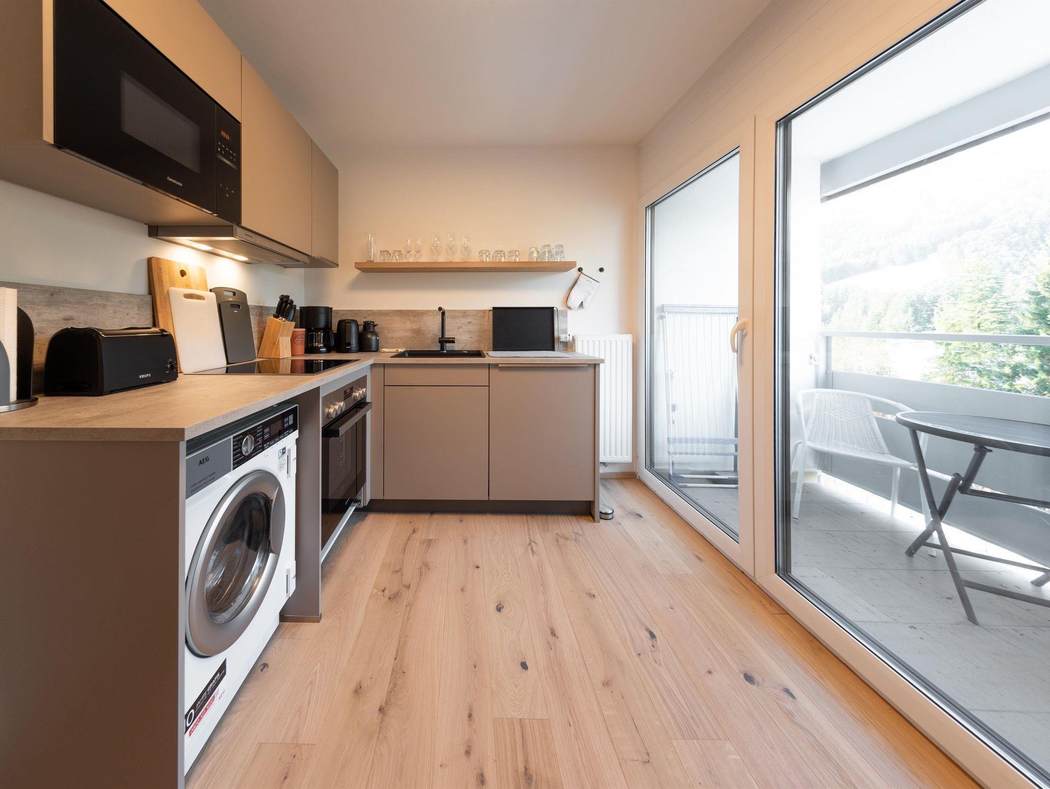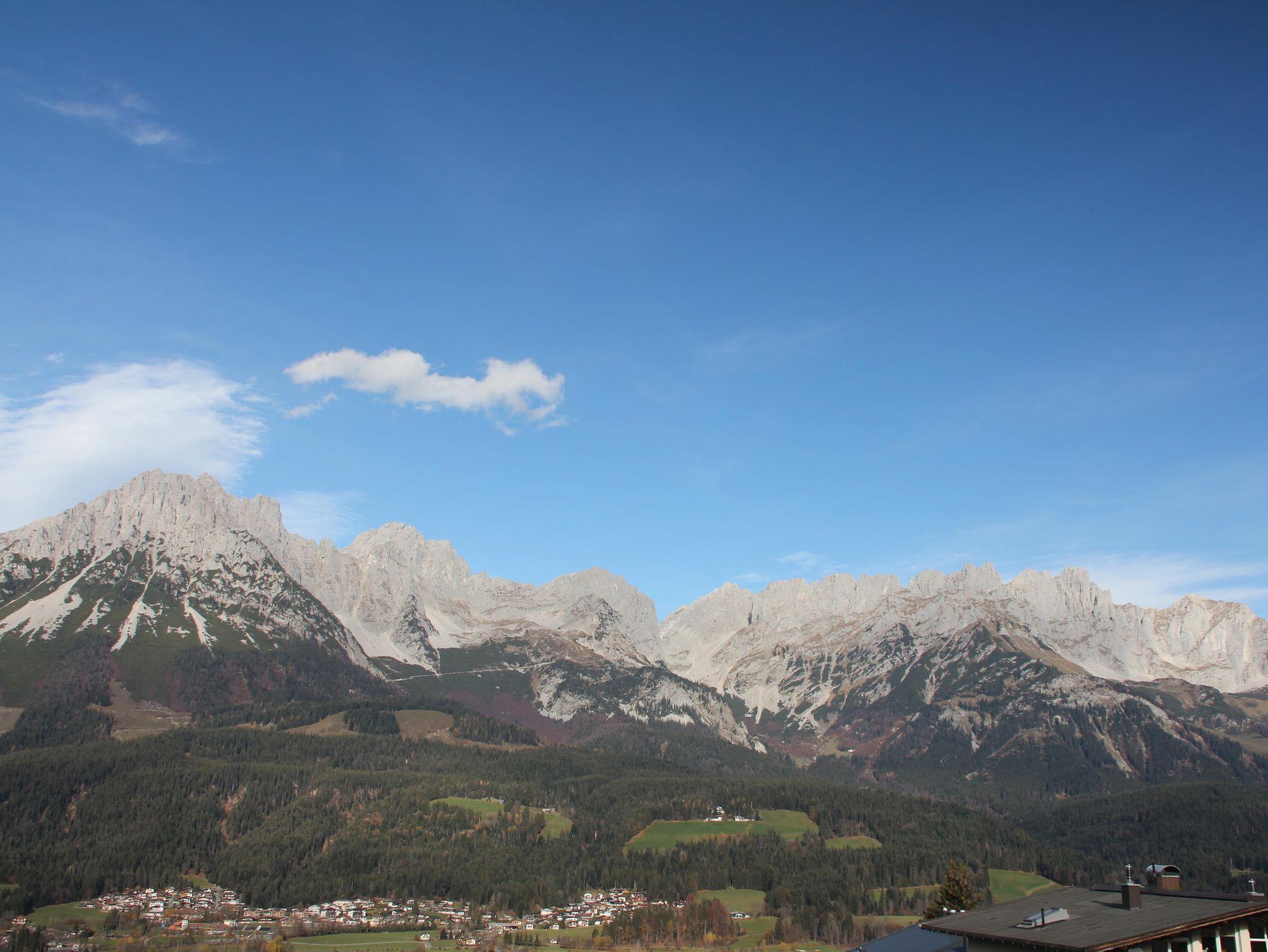 Das Apartment Alpenblick besteht aus einem Schlafzimmer, einem Wohnzimmer mit einer Schlafcouch (Liegefläche 1,40m x 2,04 m), einer Küche und einem Badezimmer mit Dusche auf insgesamt 70 qm2. Das Apartment liegt im dritten Stock des Berghofes und hat zwei Balkone mit einem phantastischen Blick auf den Wilden Kaiser und das Ellmauer Tor. Zusätzlich verfügt das Apartment über einen kleinen Westbalkon, welcher sich vor der Küche befindet und zum Sonnen ab mittags einlädt. Die Küche ist ausgestattet mit einem Backofen, einer Mikrowelle, einer Cremesso Kapselmaschine, einer Waschmaschine und ab Ende September noch zusätzlich mit einer Spülmaschine. Eine gemütliche Couch sowie der von ihr aus zu sehende, große Fernseher lädt im Wohnzimmer auf gemütliche Stunden ein. Doch eines sei im Apartment Alpenblick gesagt: das mit dem Fernsehen ist bei dem herrlichen Ausblick, welchen man auf den Wilden Kaiser hat, gar nicht so einfach - hier ist es eine wirkliche Herausforderung, dass die Augen am Bildschirm bleiben. Aus eigener Erfahrung kann gesagt werden, dass die Augen immer wieder in die malerisch-imposante Tiroler Berglandschaft abschweifen - und das, obwohl man im Apartment Alpenblick sogar Zugriff auf Unterhaltungskünstler wie Netflix und Amazon Prime hat.