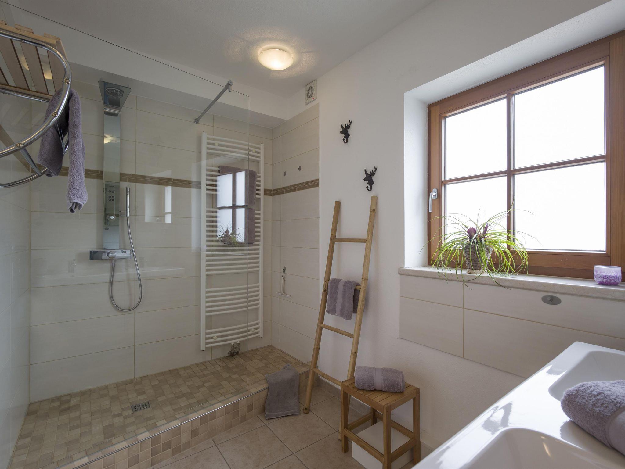 Das geräumige Badezimmer mit Wellness-Dusche und Doppelwaschtisch und viel Stauraum ist getrennt vom WC nutzbar und mit einem Föhn ausgestattet.