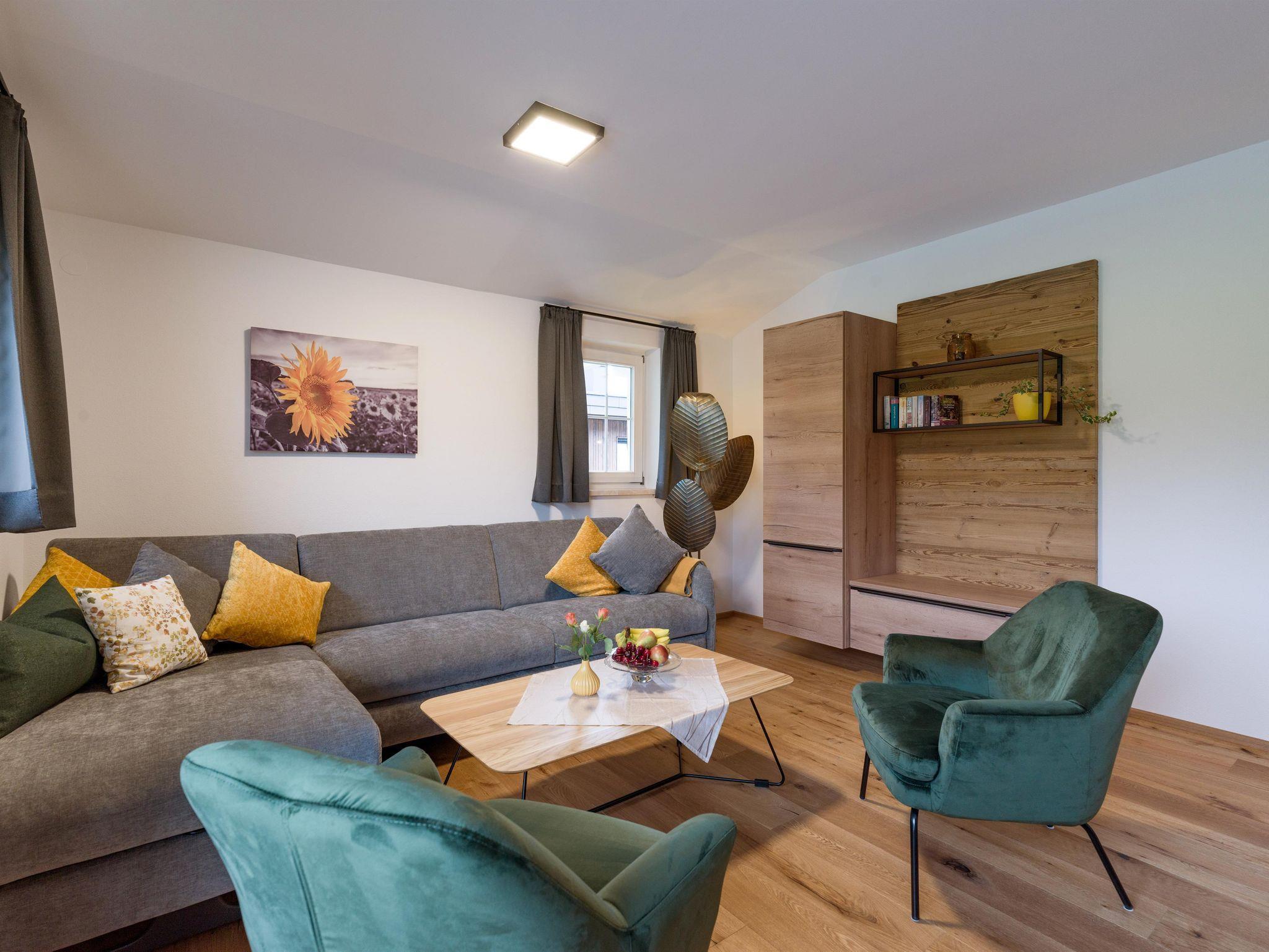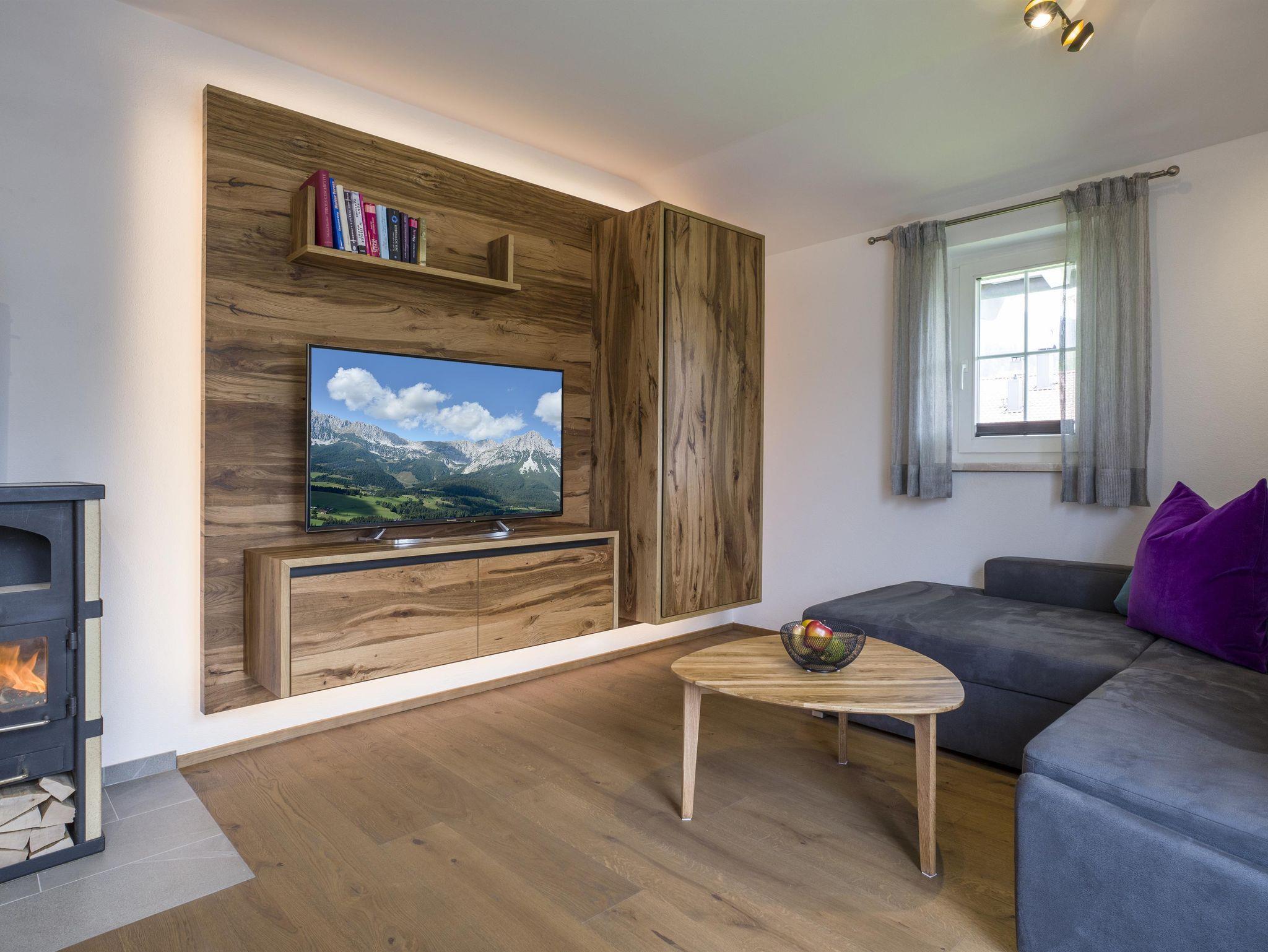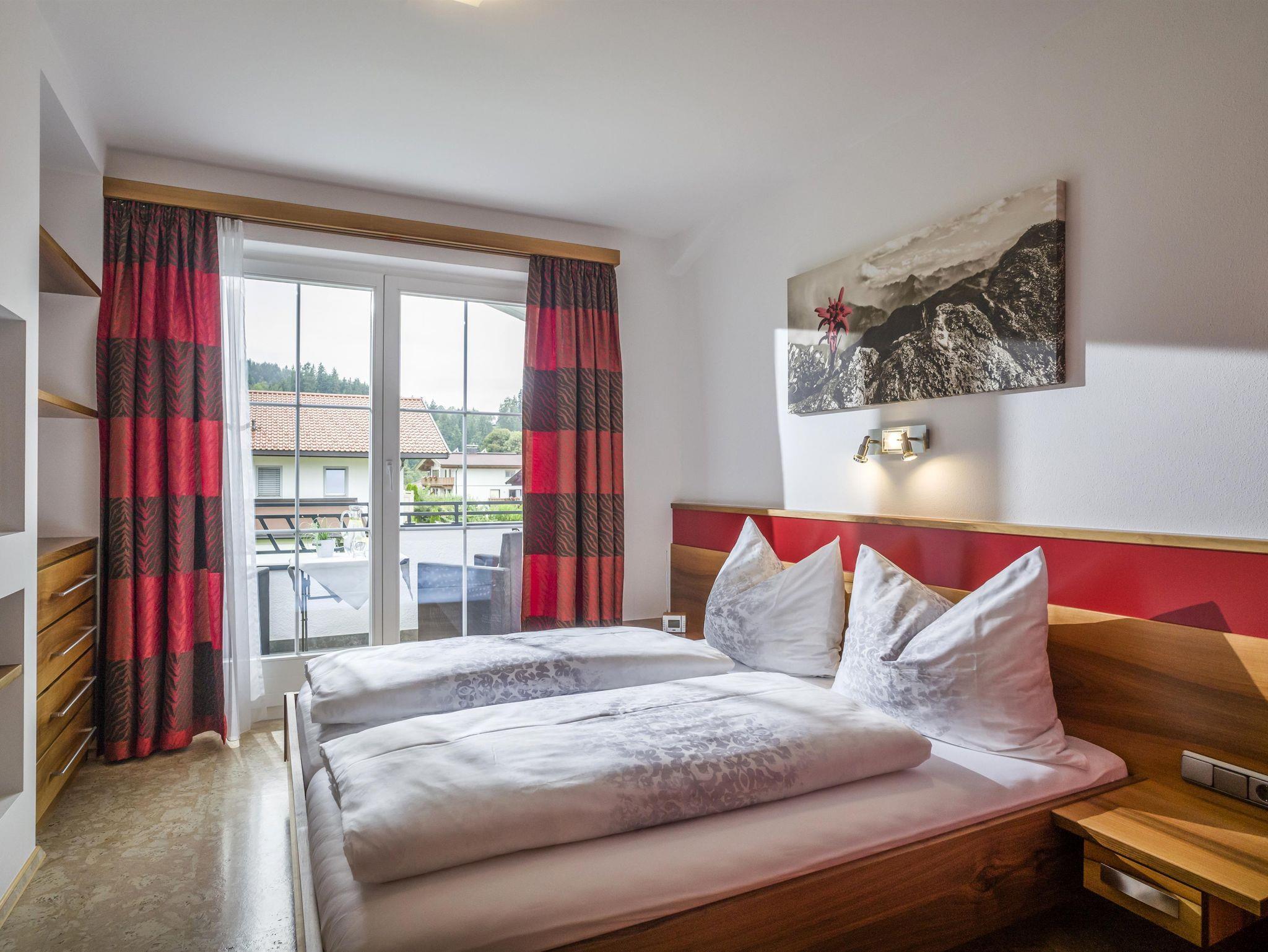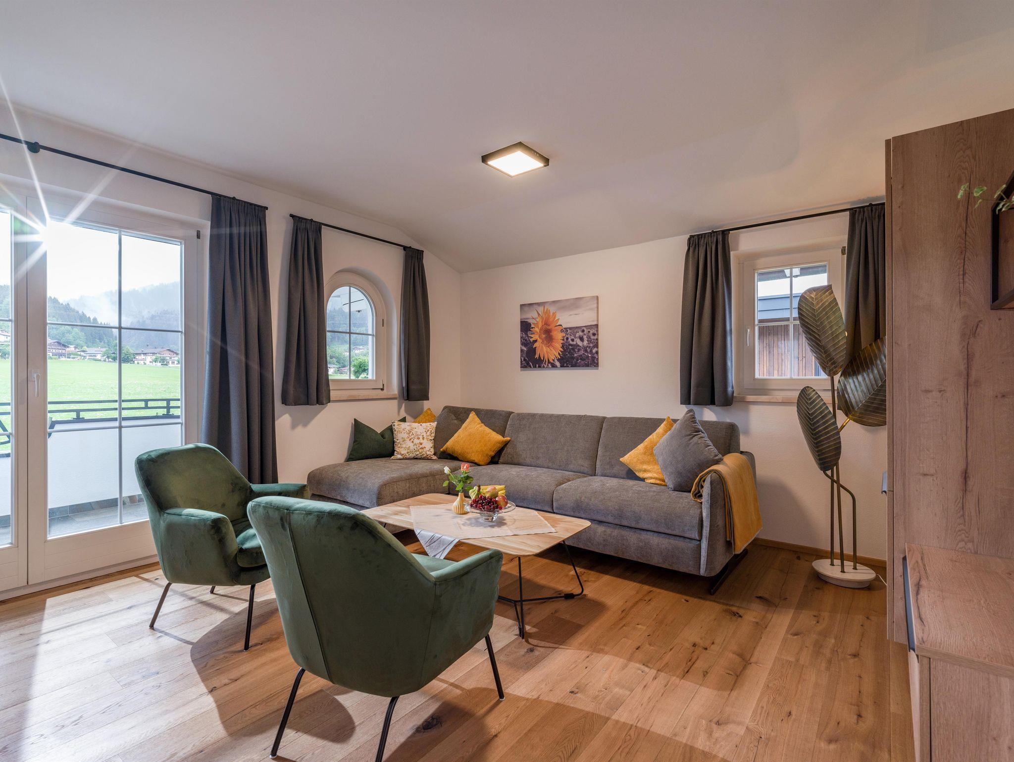Ruhige, sonnige und gemütliche Nichtraucherwohnung mit ca. 54m² im 1. Stock, 1 Schlafzimmer, 1 Wohn- Schlafzimmer mit bequemer Wohnlandschaft u. Kabel-TV, komplett ausgestattete Wohnküche mit Sitzecke,Vorraum mit Garderobe, Dusche/WC, Balkon zur Süd- und Westseite. Hier können unsere Gäste die freie Aussicht auf den Astberg und Hartkaiser genießen.
