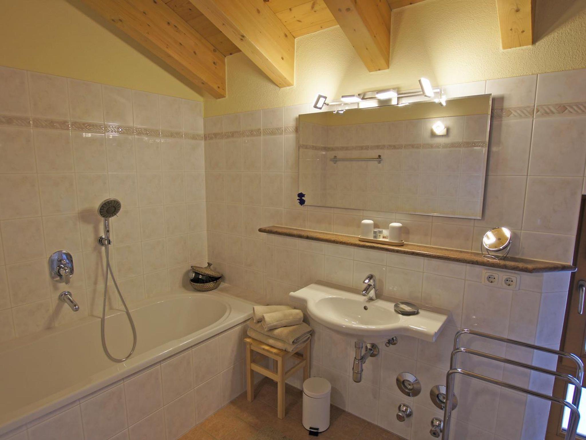 Komfortables Bad mit Badewanne, Dusche und WC, separates Gäste-WC.