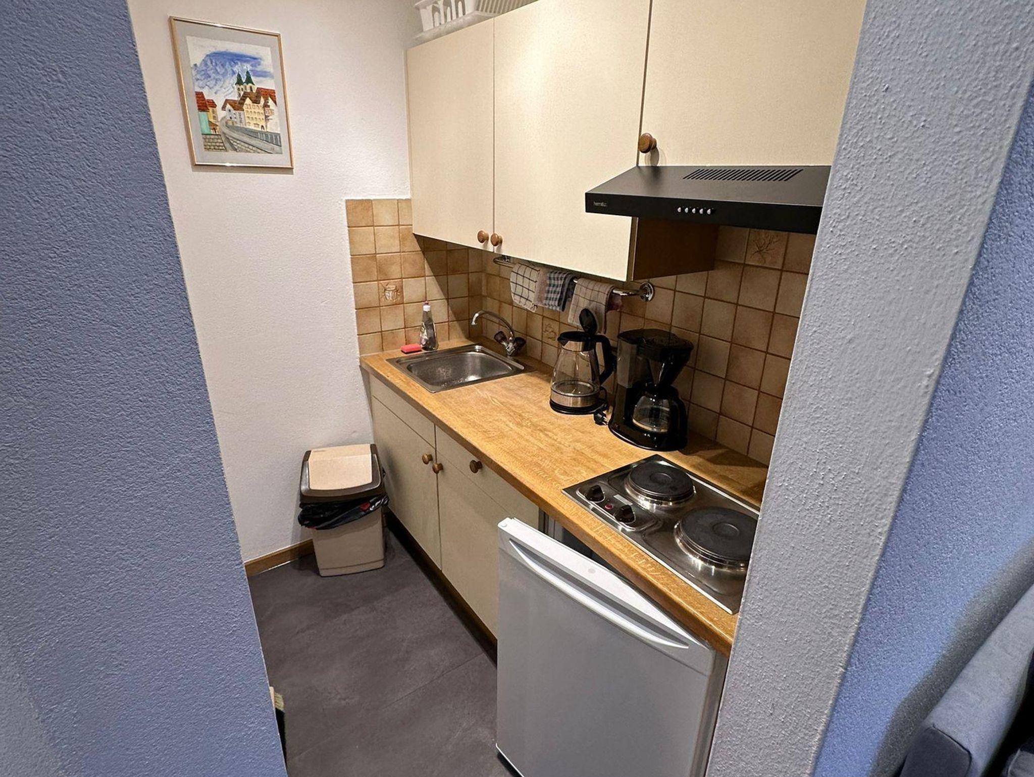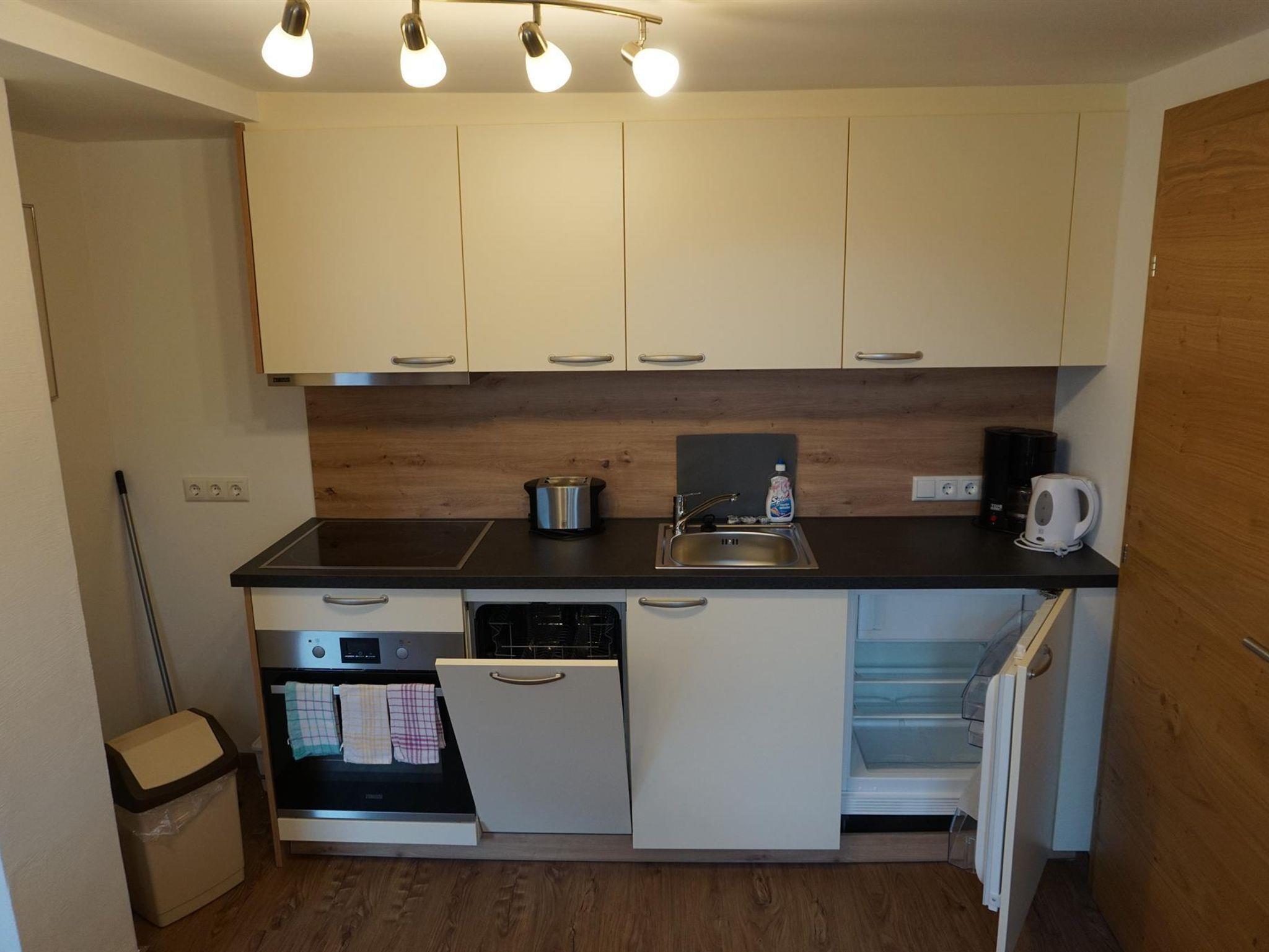 Die Küche ist mit Herd, Ceranfeld, Geschirrspüler, Kühlschrank mit Gefrierfach, Kaffeemaschine, Wasserkocher, Toaster und Geschirr ausgestattet.