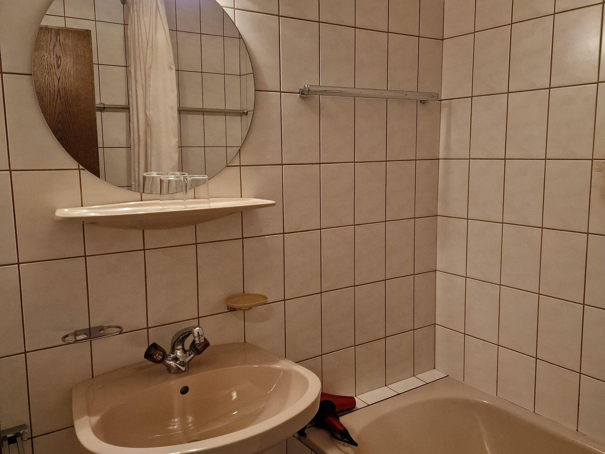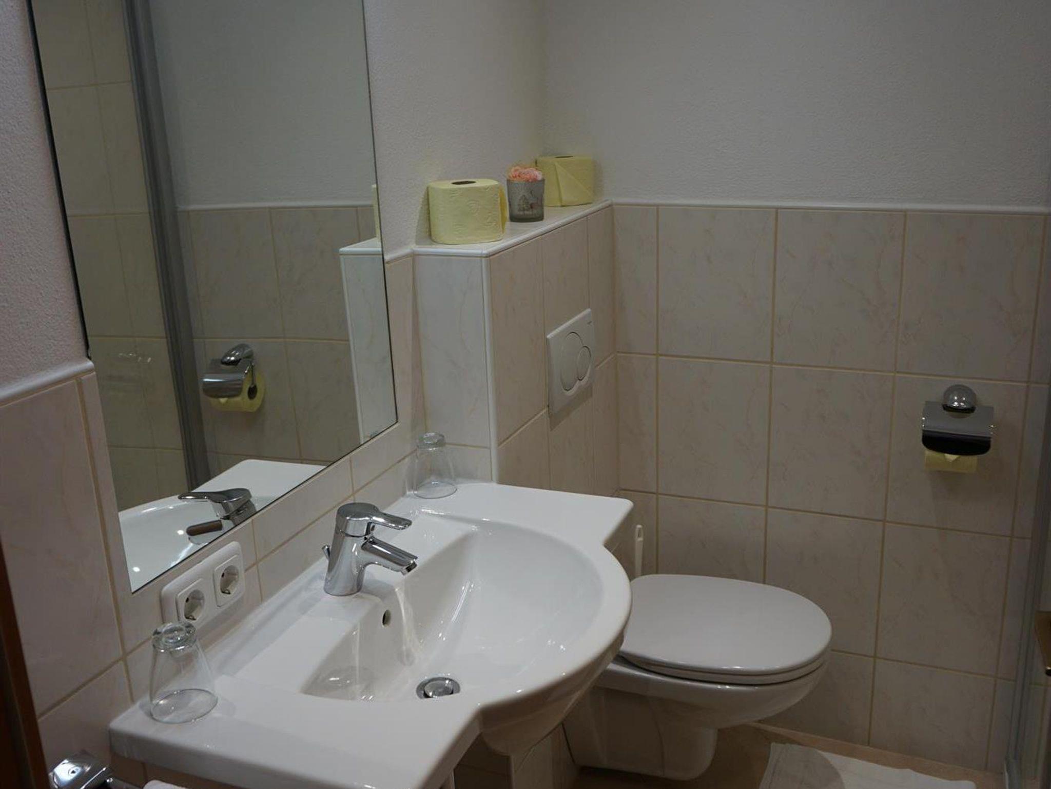 Das Badezimmer ist mit Dusche, Waschbecken eingerichtet.