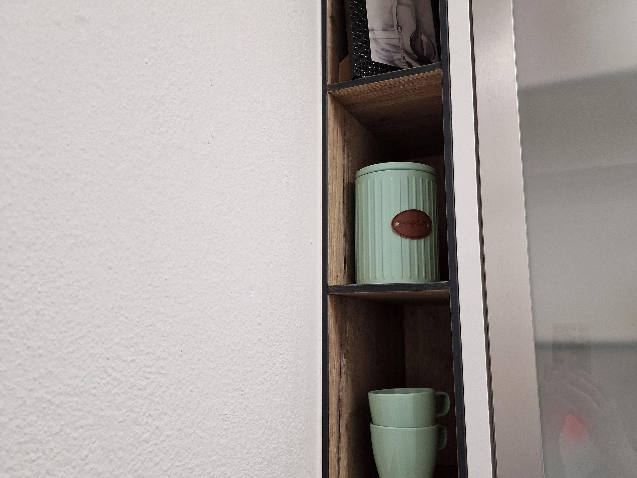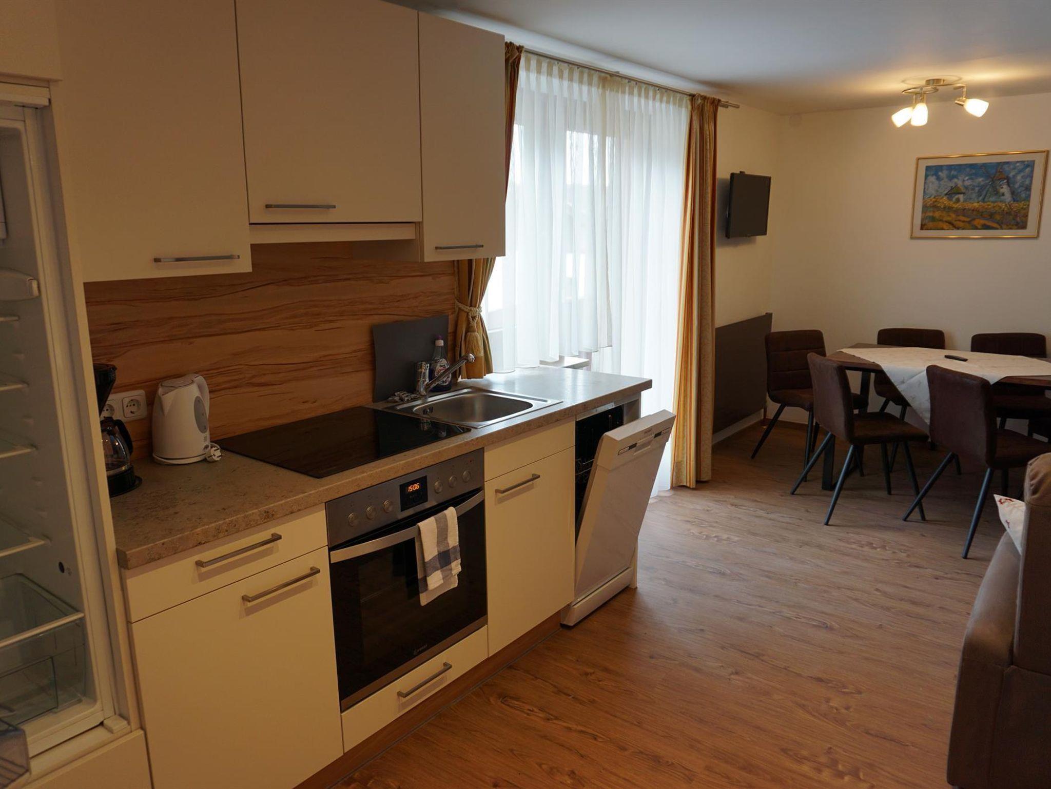 Die Küche ist mit E-Herd, Ceranfeld, Kühlschrank und Geschirrspüler ausgestattet.