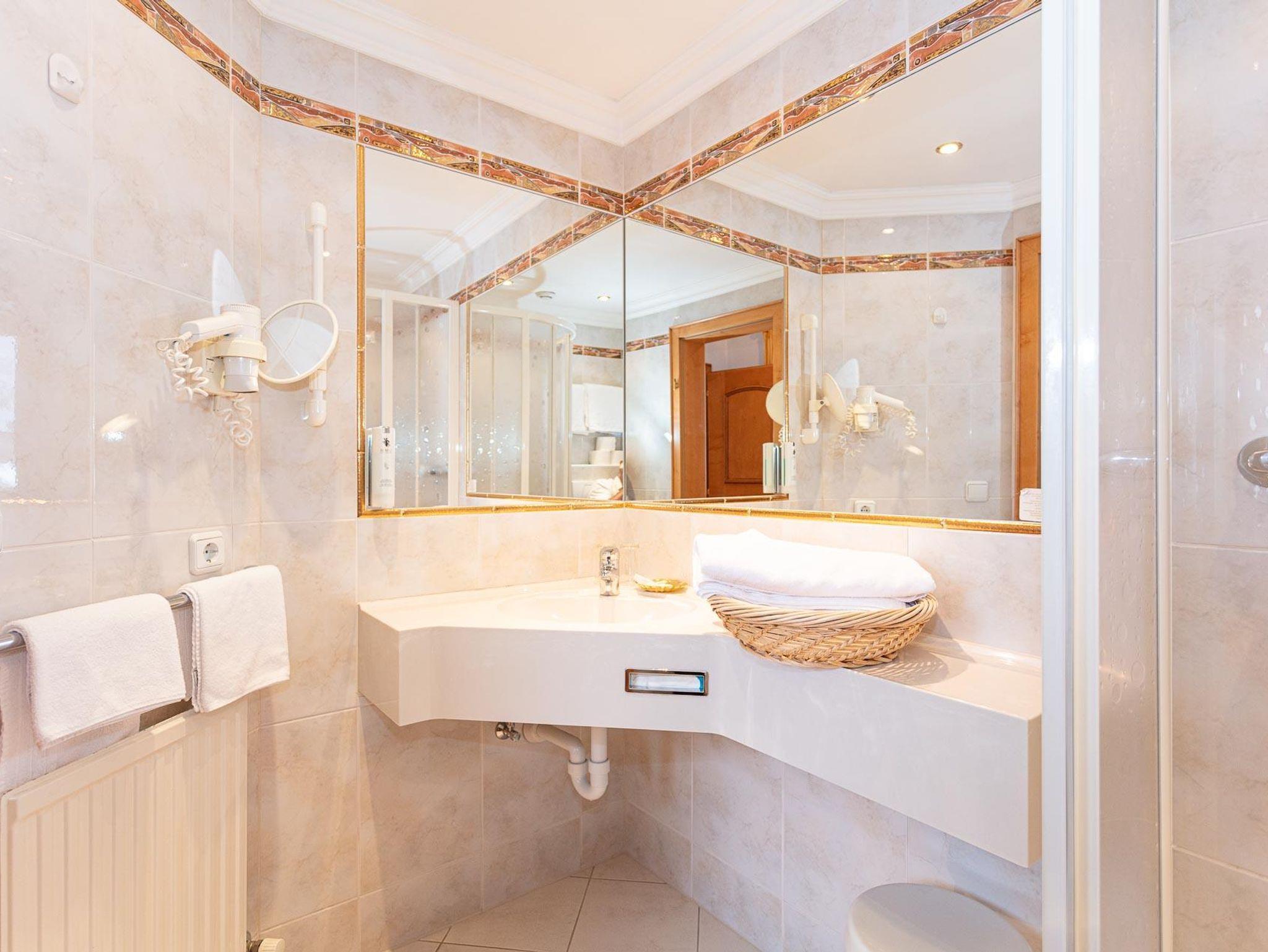 Ein Balkon mit herrlicher Aussicht in die Tiroler Berge. Neben Telefon und Fernseher mit Kabelanschluss befindet sich noch einer Zimmersafe zur sicheren Verwahrung Ihrer Wertgegenstände. Weiterhin gibt es für unsere Gäste Bademäntel (nur Erwachsene).