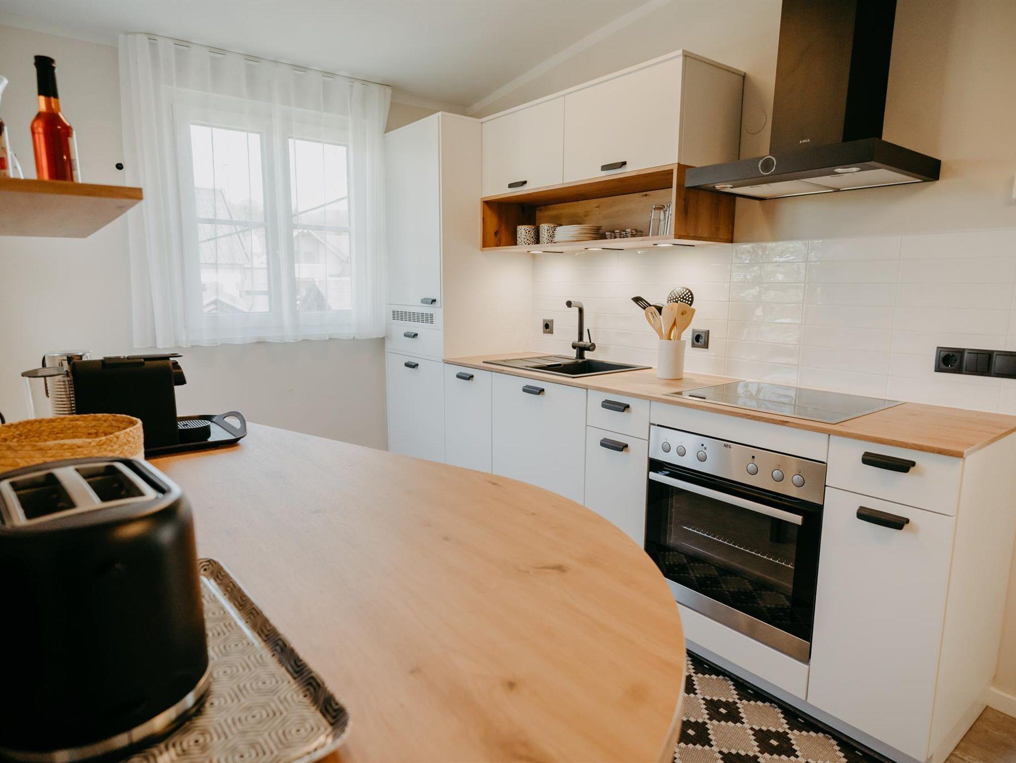 • komplett ausgestattete Wohnküche mit Geschirrspüler, Kühlschrank mit Gefrierfach, besonders gut ausgestattet mit Geschirr und Besteck für Selbstversorger, Nespresso-Kaffeemaschine und -Milchschäumer