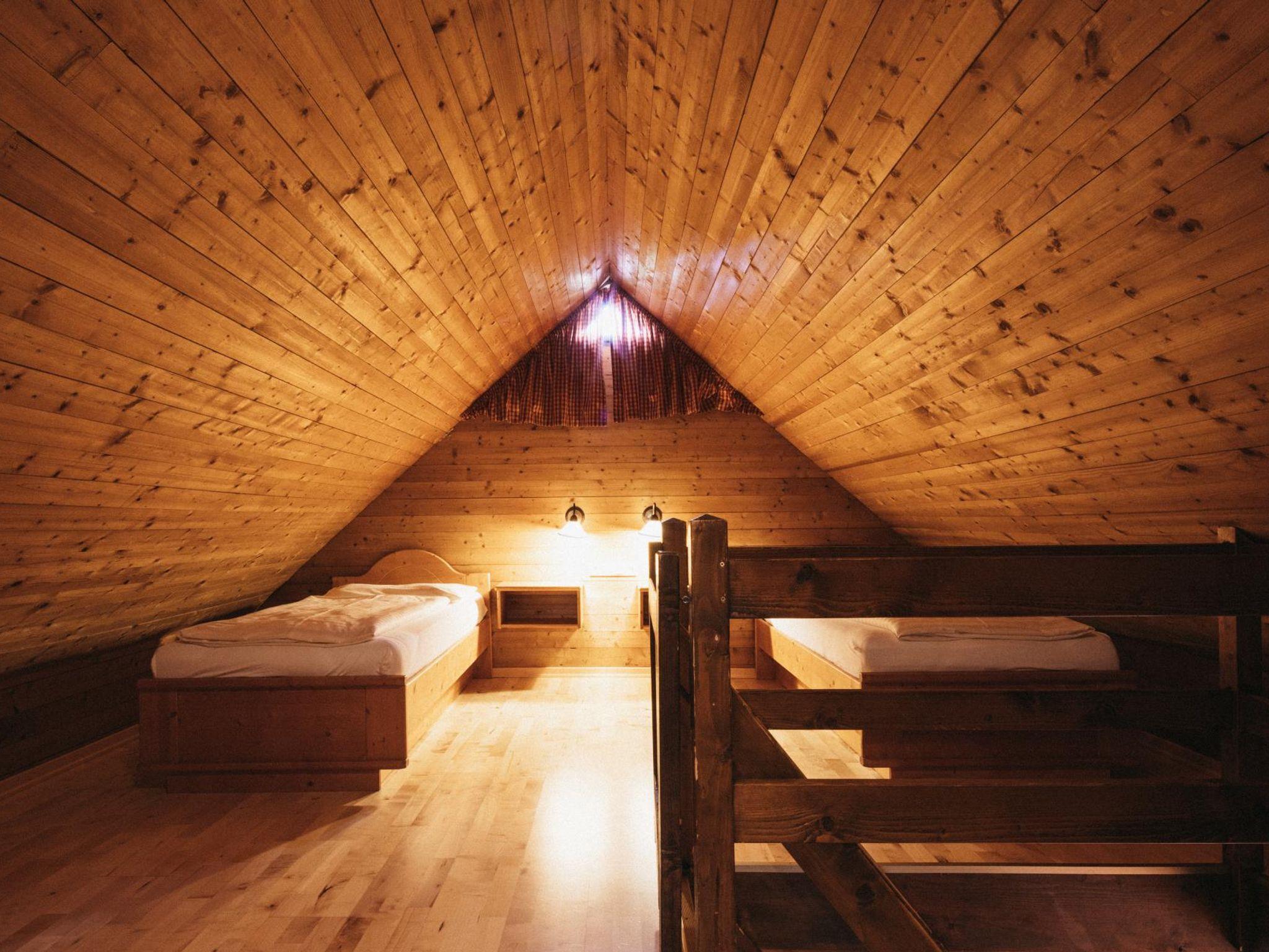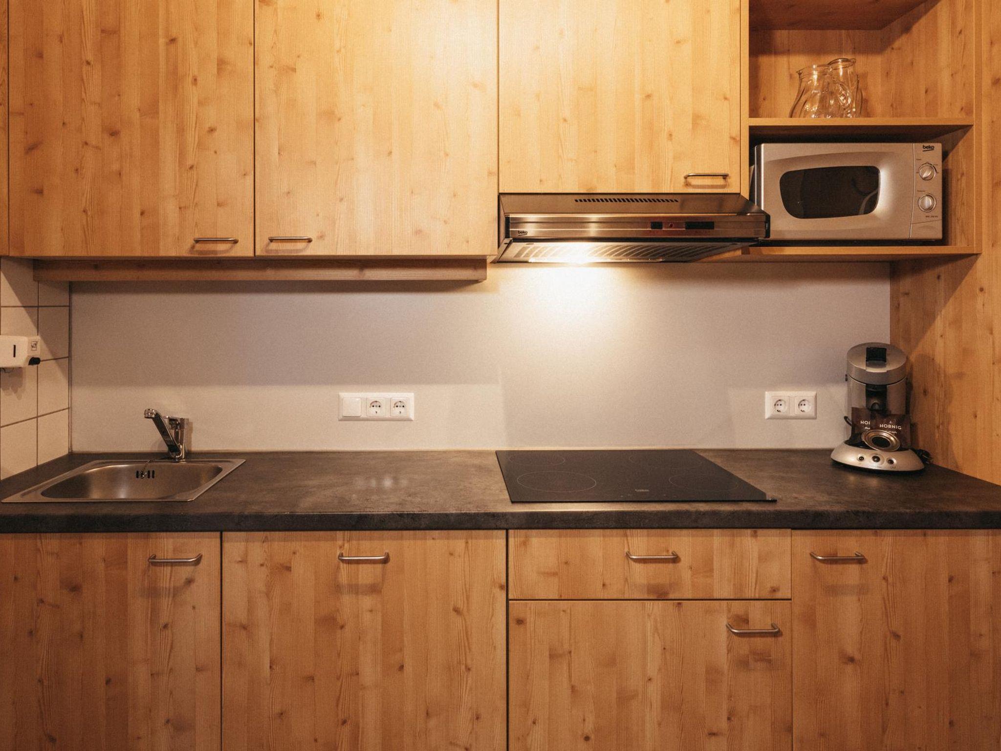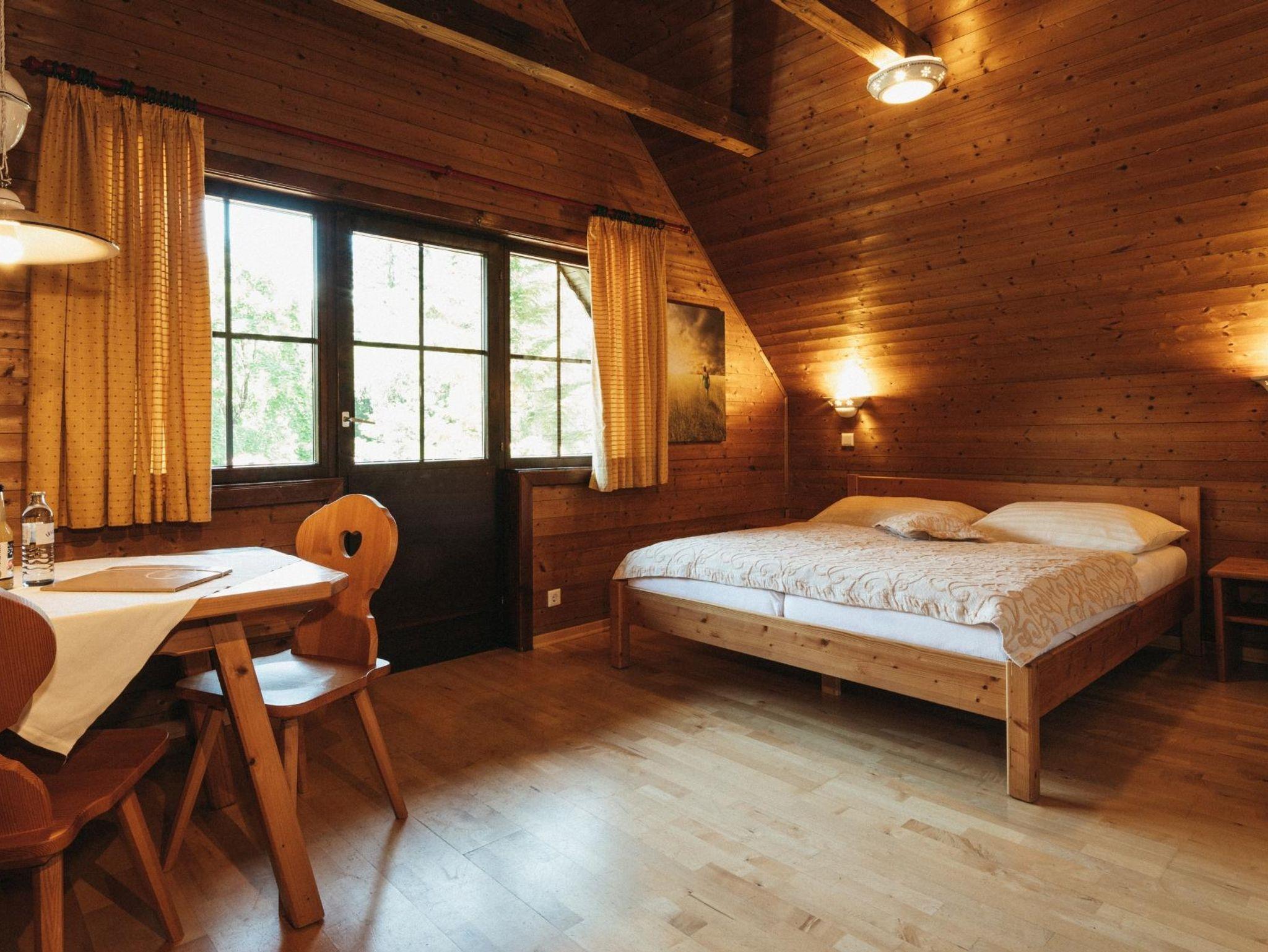 Im Parterre mit einer Wohnfläche von ca. 35 m², augestattet mit Küchenzeile, Wohnraum mit Sitzgruppe (2 Sitz-/Schlafcouches), Kachelofen und Essecke, kleines Schlafzimmer mit Etagenbett, Dusche, WC.