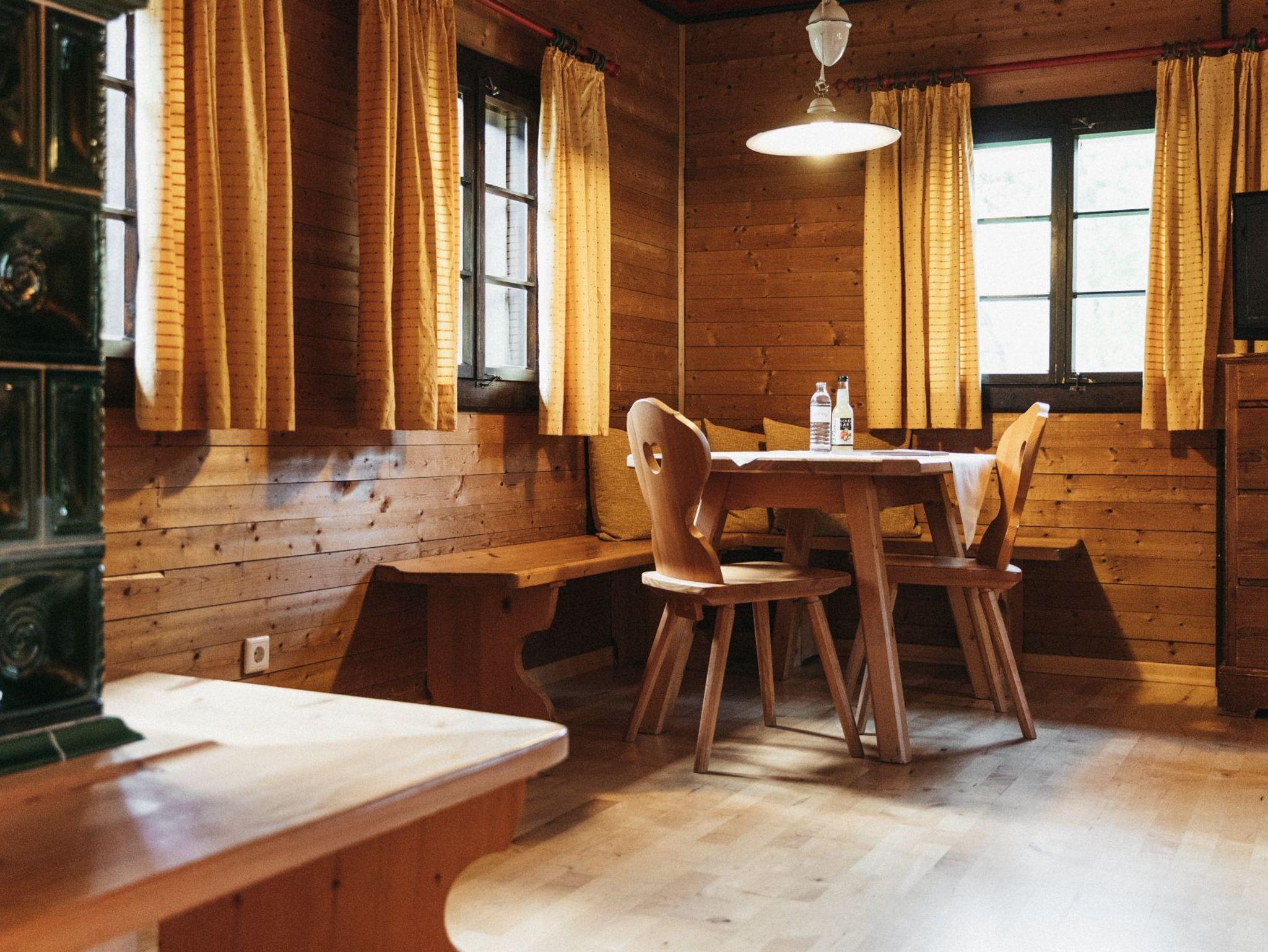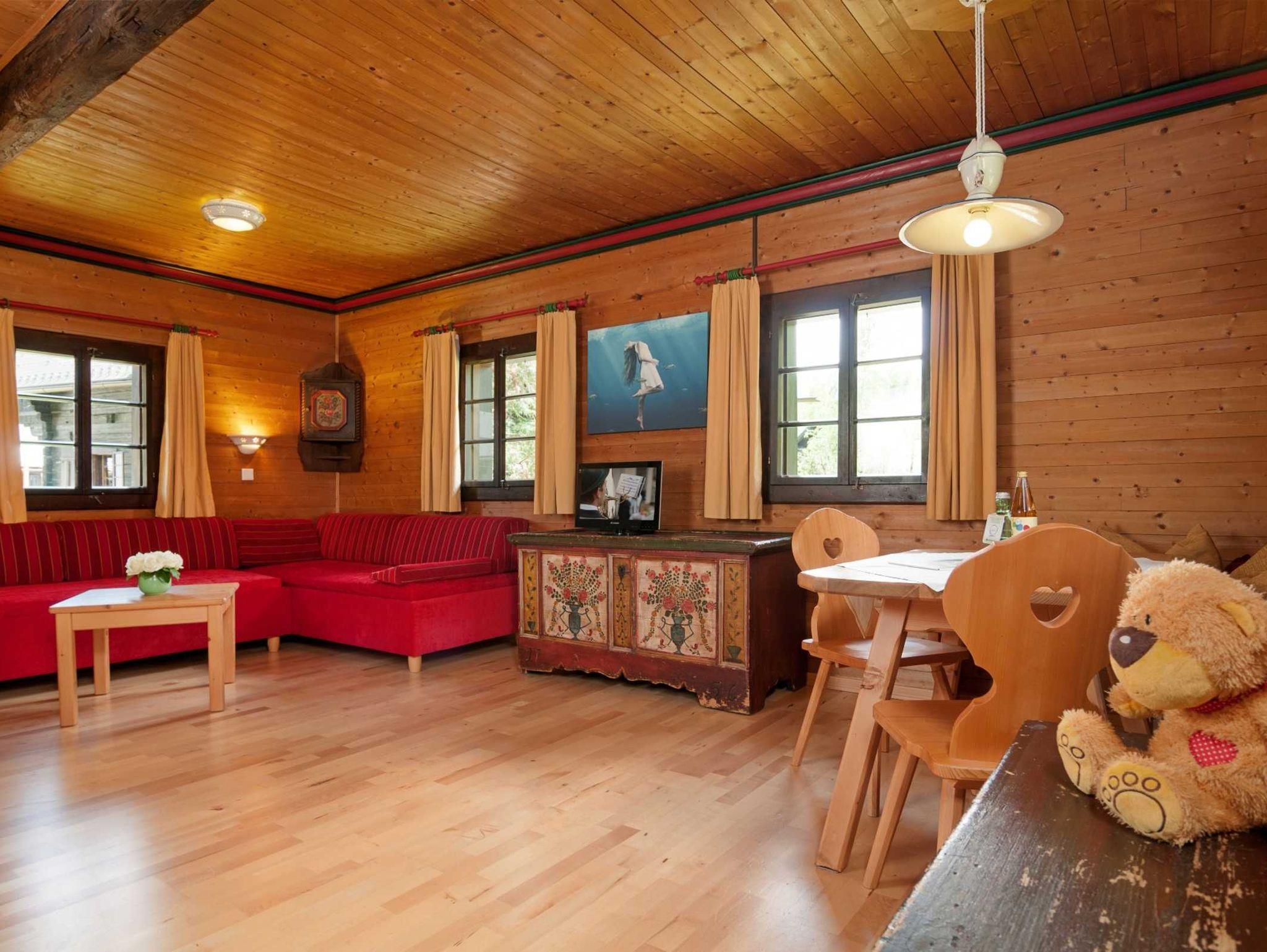 Im Parterre mit einer Wohnfläche von ca. 35 m², augestattet mit Küchenzeile, Wohnraum mit Sitzgruppe (2 Sitz-/Schlafcouches), Kachelofen und Essecke, kleines Schlafzimmer mit Etagenbett, Dusche, WC.