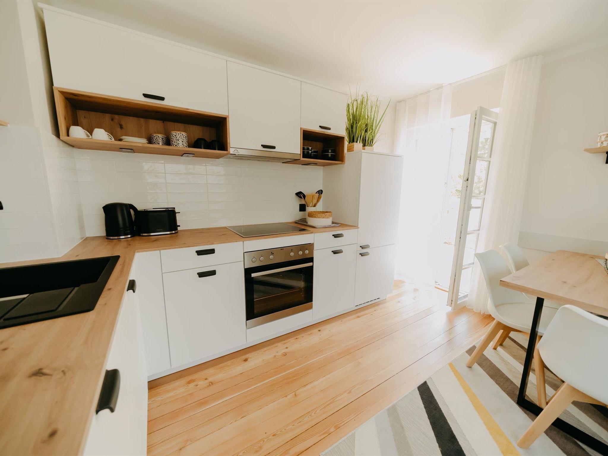 • komplett ausgestattete Wohnküche mit Geschirrspüler, Kühlschrank mit Gefrierfach, besonders gut ausgestattet mit Geschirr und Besteck für Selbstversorger