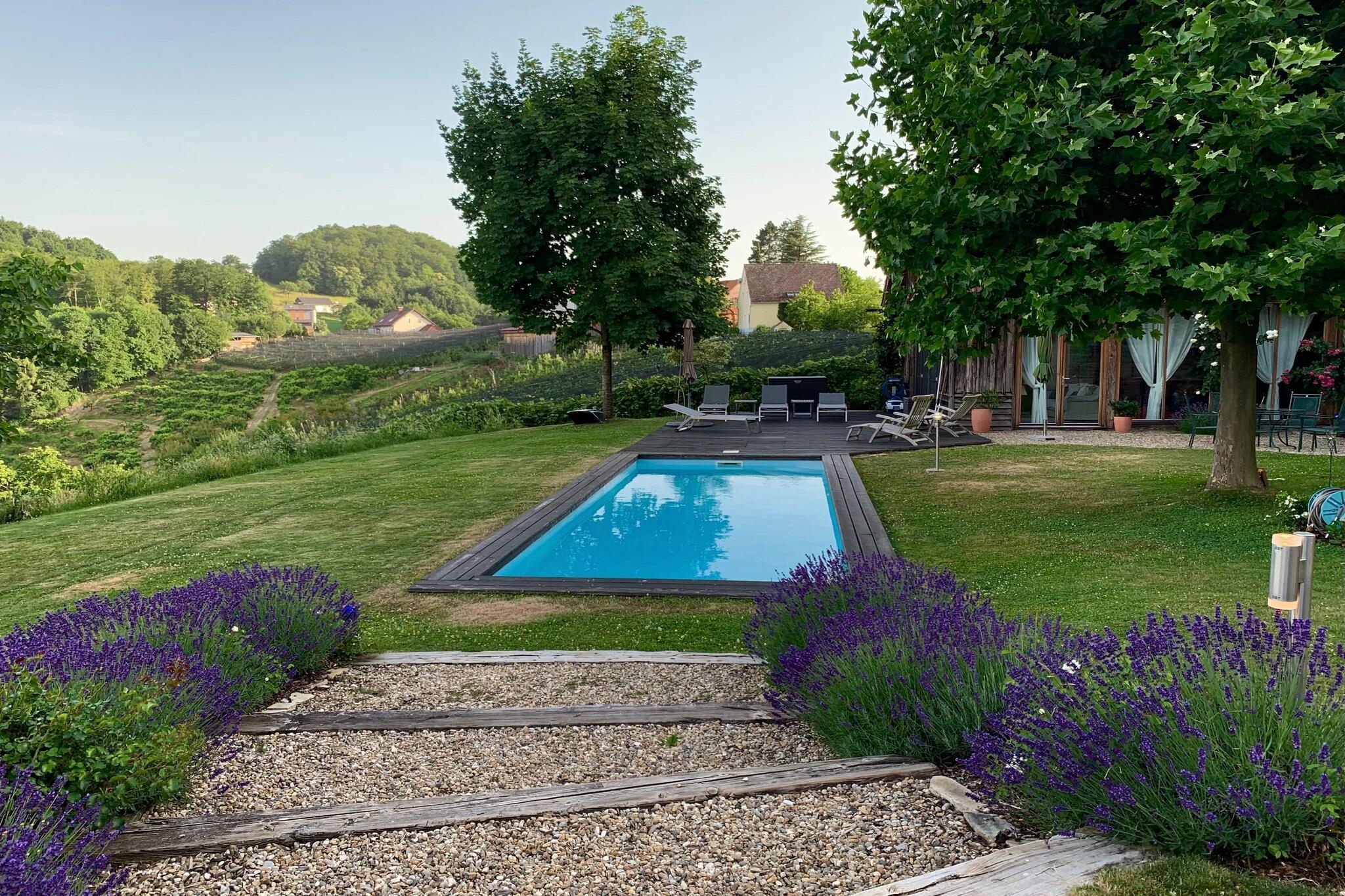 Den 250 år gamle hovedbygning (175 m²) er blevet grundigt revitaliseret. Dens gamle charme er blevet bevaret og er blevet kærligt møbleret med moderne teknologi og udsøgte antikviteter. To soveværelser med en-suite badeværelser (hvoraf det ene er åbent integreret, hver med badekar, bruser, toilet, hårtørrer, badekåber) kan komfortabelt rumme 4 personer. Den rummelige stue med pejs (satellit-tv, musikanlæg, bibliotek) er åben på 2 sider til terrassen og haven. Det fuldt udstyrede køkken og bryggers (vaskemaskine og tørretumbler) er åbne for hinanden. Endvidere indgangsparti og gæstetoilet.Det 75 kvadratmeter store, hemslignende udhus, "Presshaus", er helt i træ og byder på en smuk panoramaudsigt til to sider gennem de høje vinduer. Det store gavlvindue giver natudsigt til stjernehimlen i det sydlige Steiermark Midtpunktet er en cirka hundrede år gammel vinpresse, på hvis pressegulv en dobbeltseng er smukt integreret Med endnu et badeværelse med regn bruser, toilet og Der er nok plads til en anden 2 people.A Daikin klimaanlæg giver køling om sommeren og fungerer som opvarmning i winter.A sovesofa plads til 1 ekstra barnets tarv hyggelig have med swimmingpool ( 9 x 3 m, biologisk salt rengøring) og solen terrasse forbinder de to bygninger og skaber en fredelig atmosfære. Detaljer: Forbrugsbaserede energiomkostninger, sengelinned, håndklæder, slutrengøring, WiFi-velkomstpakke, byskat Aktiviteter i nærheden: Det maleriske bakkede landskab af vulkansk oprindelse med dets skove, vinmarker og frugtplantager er ideelt til lange gåture. Oplev de mange paladser og slotte langs Schlösserstraße, som betragtes som udfordrende vidner fra en svunden tid. Flere golfbaner såsom Traminergolf Klöch (ca. 20 km) eller Thermengolf Loipe