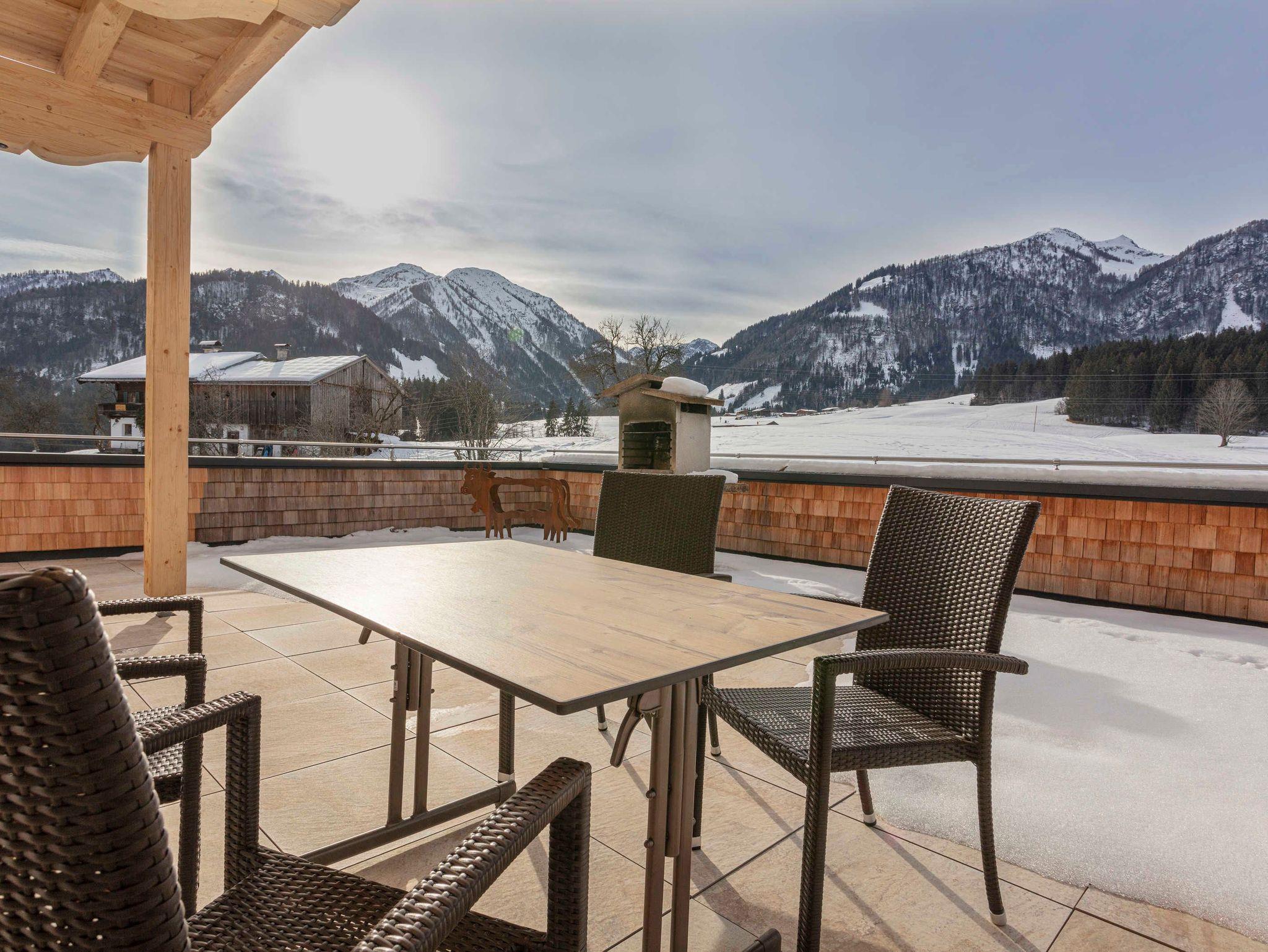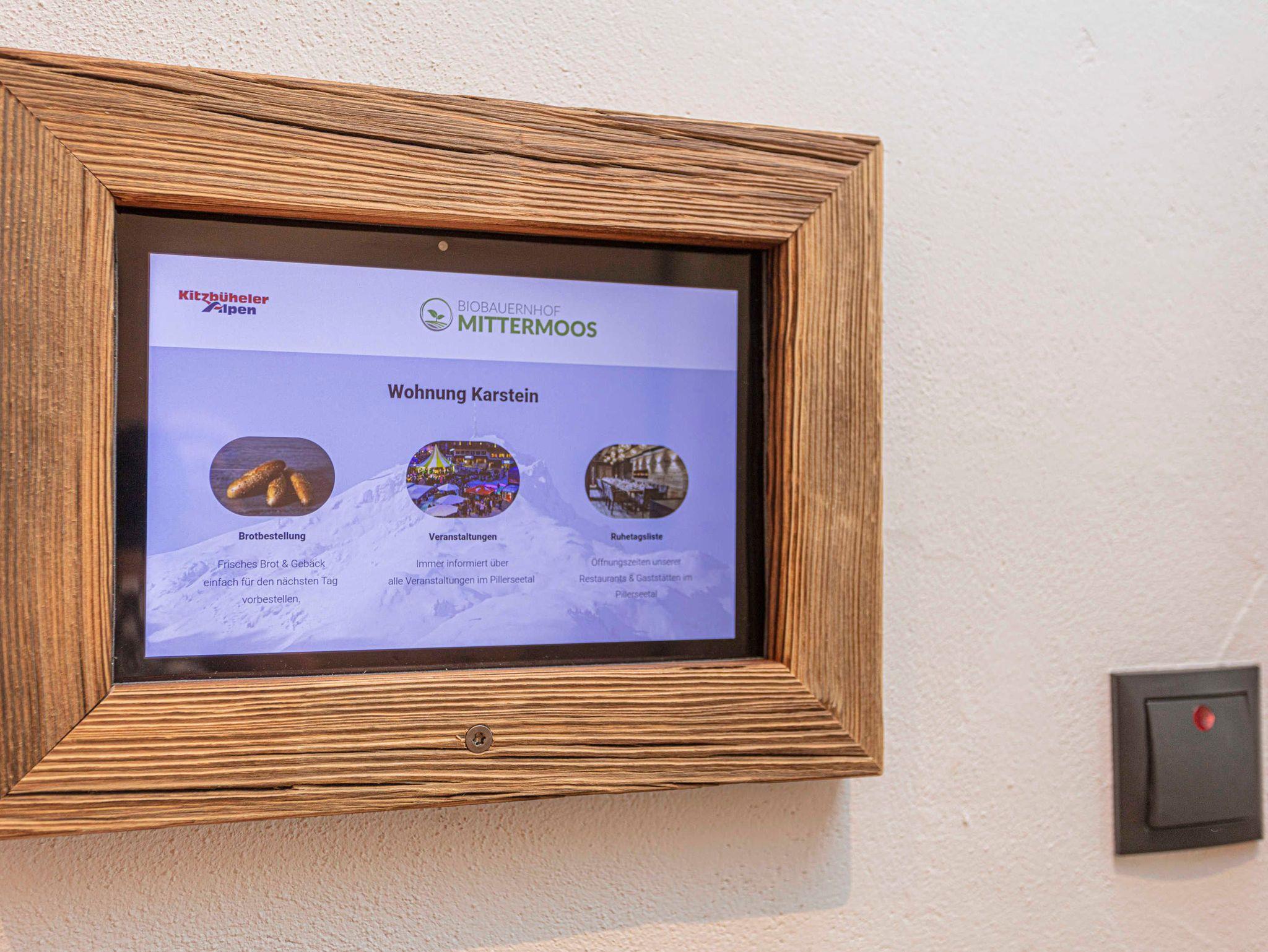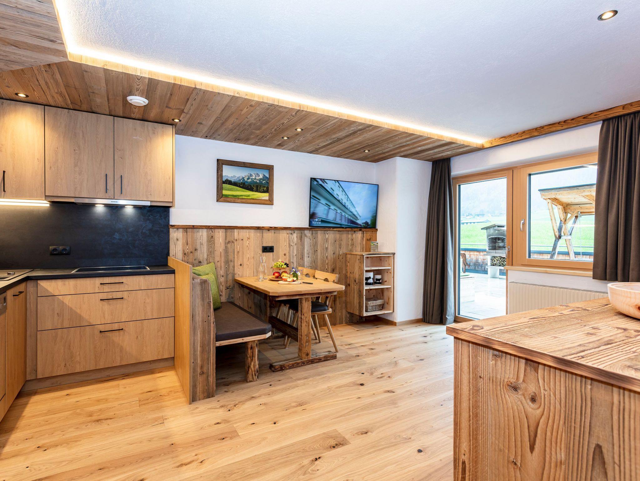 Herrlich!! Sonnenuntergang in den Tiroler Bergen mit Blick auf Kitzbühler Horn und den Wilden Kaiser. Ebenerdiger Zugang zum Garten mit Gartengarnitur und Liegestühlen. Für gemütliche Grillabende kann ein Griller kostenlos ausgeliehen werden. Komplett eingerichteter Küche mit Kaffeemaschine und Wasserkocher, Geschirrspüler und E-Herd mit Backofen, gemütliche Essecke, Couch, FLAT-TV, Radio, gratis WLAN, Dusche/WC, ein Schlafzimmer.