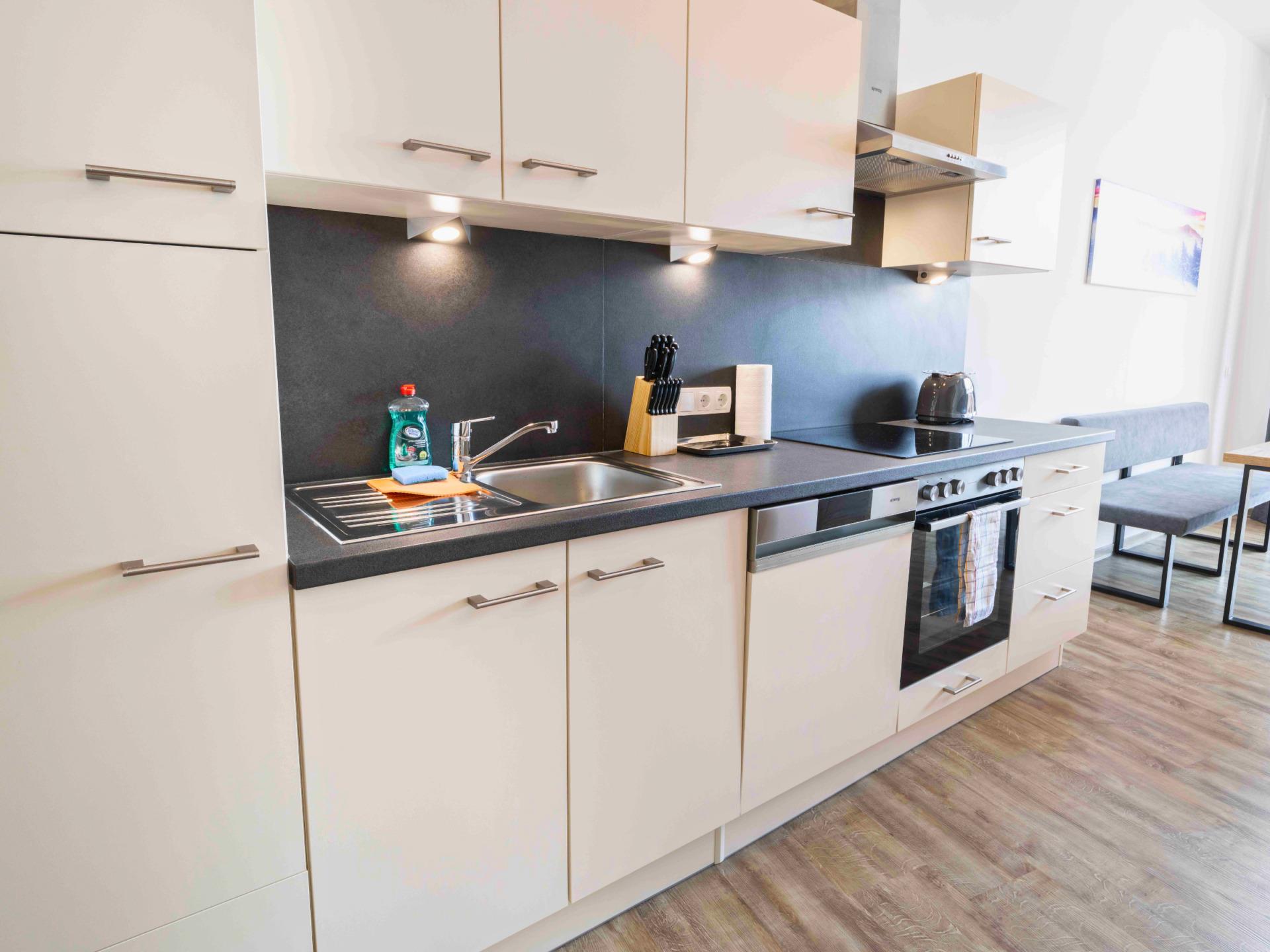 Die Wohnung ist mit einer Fußbodenheizung ausgestattet, die Küche ist komplett eingerichtet und der Wohnbereich verfügt über ein Sofa und einen Flachbildfernseher.