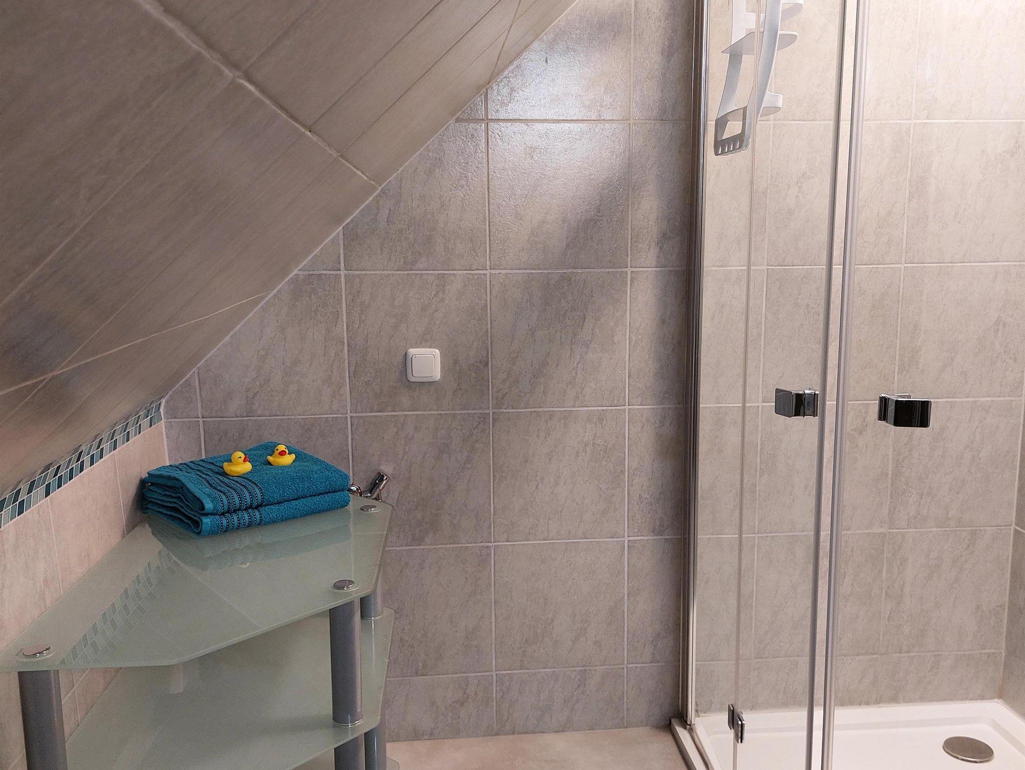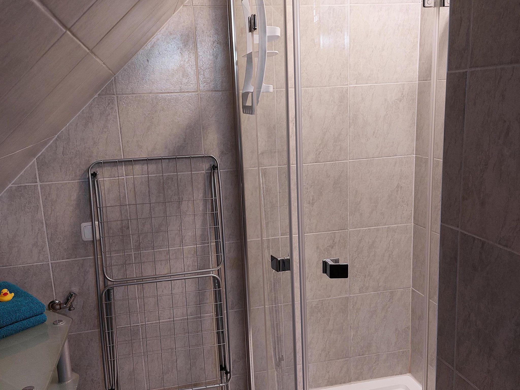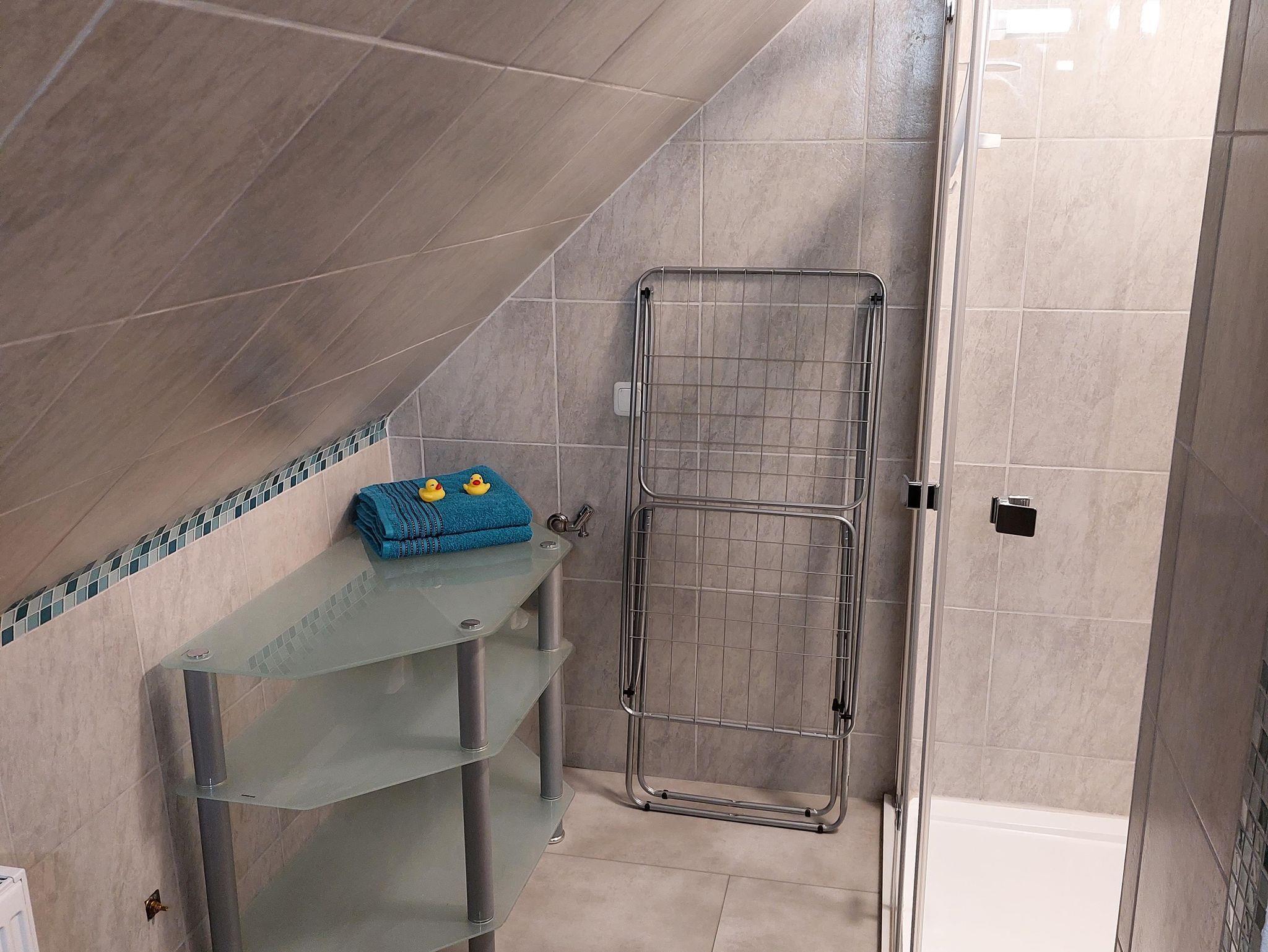 1 Badezimmer mit Dusche und Wäscheständer