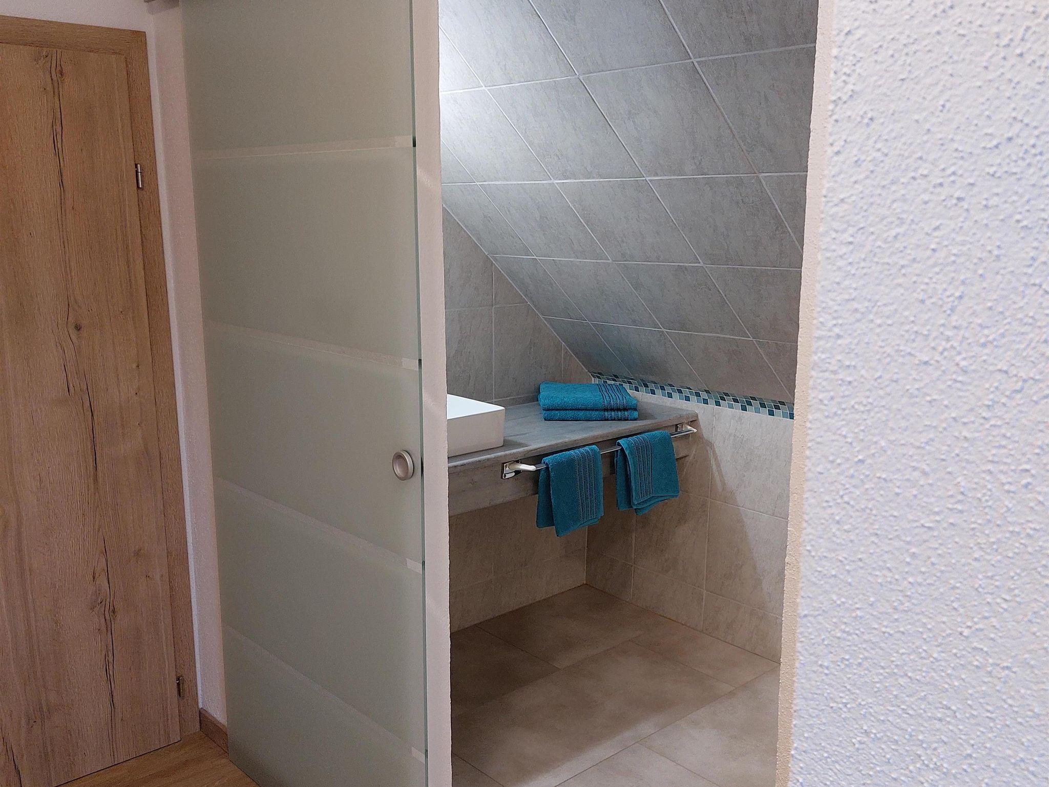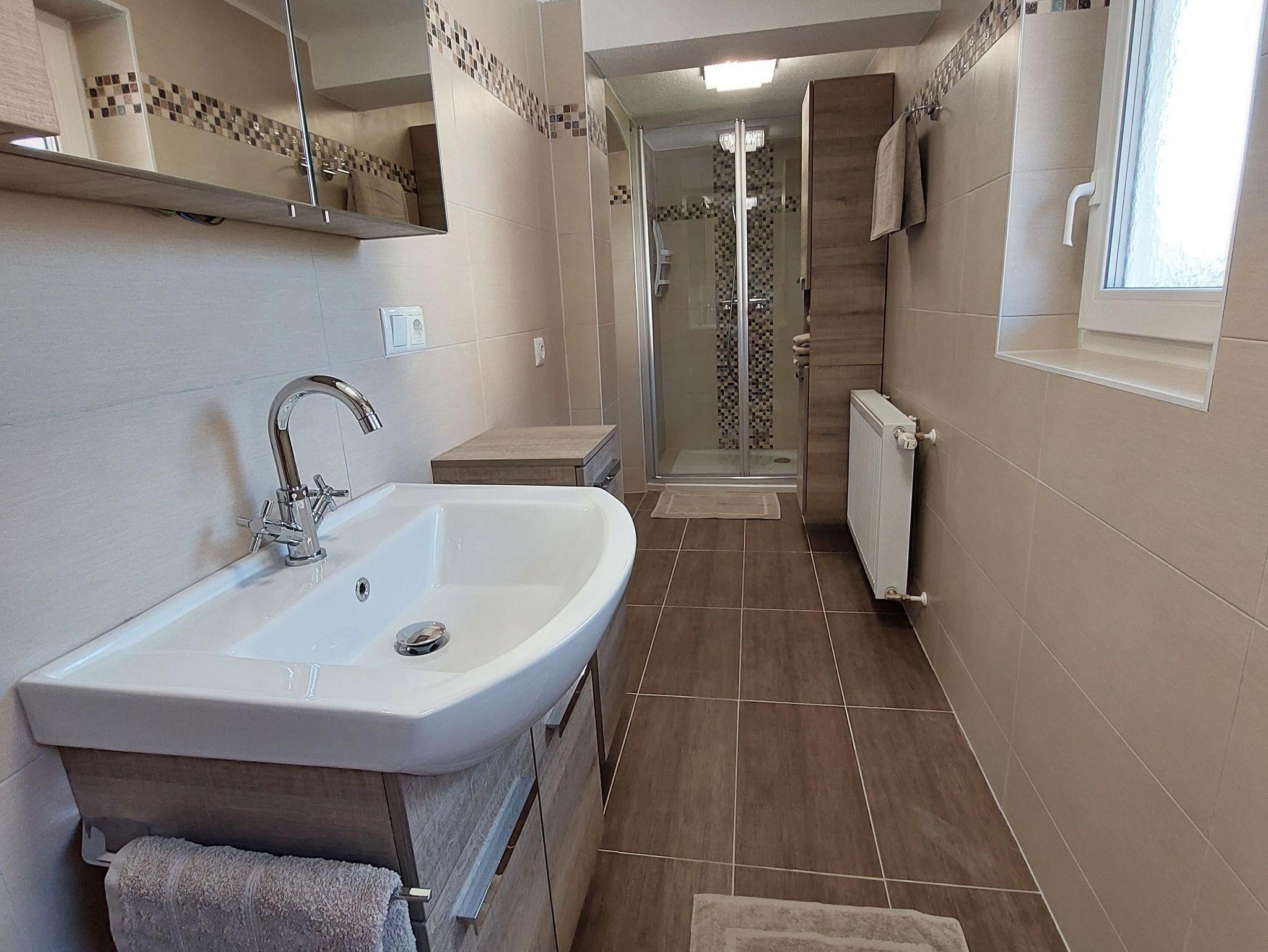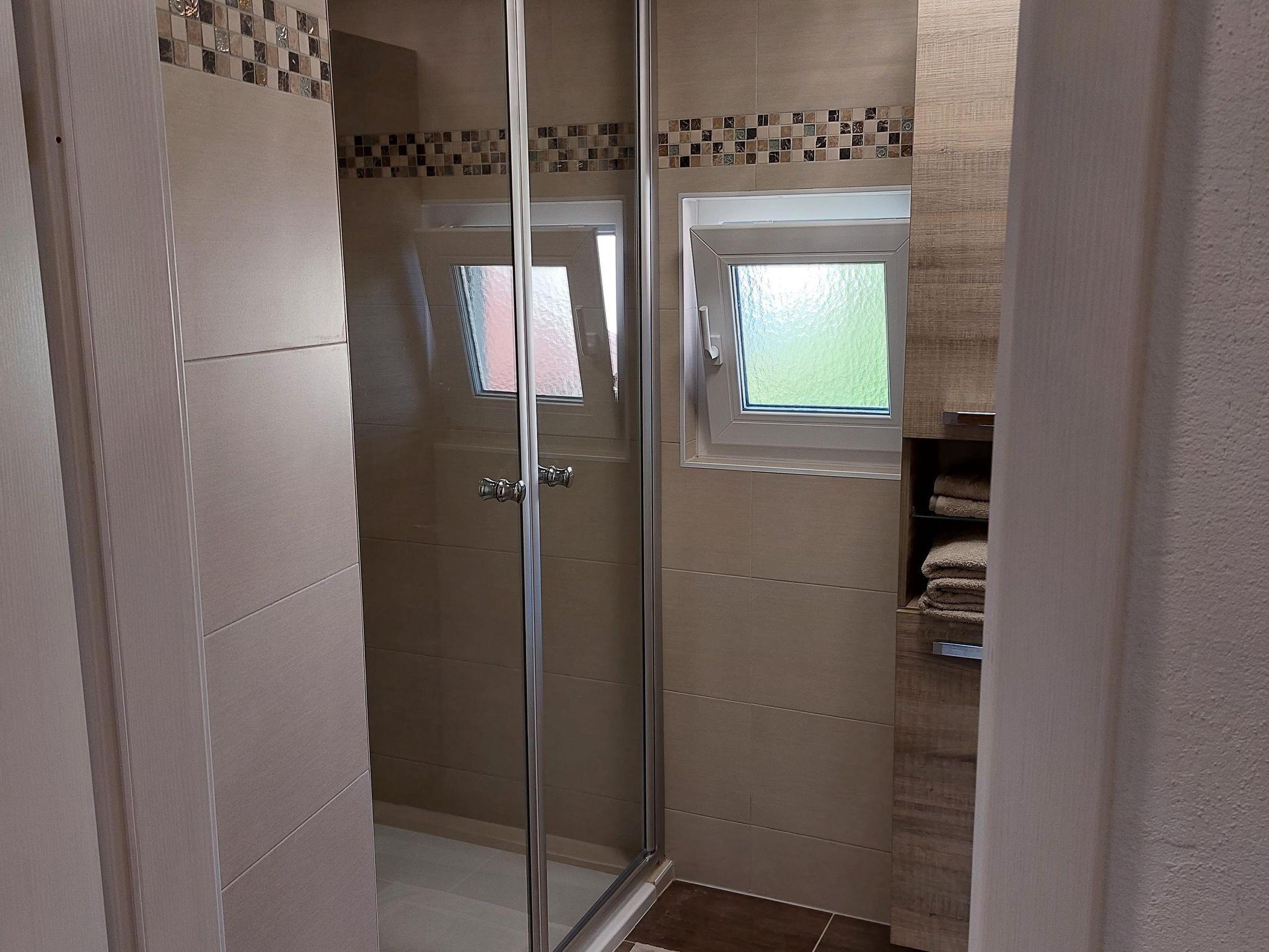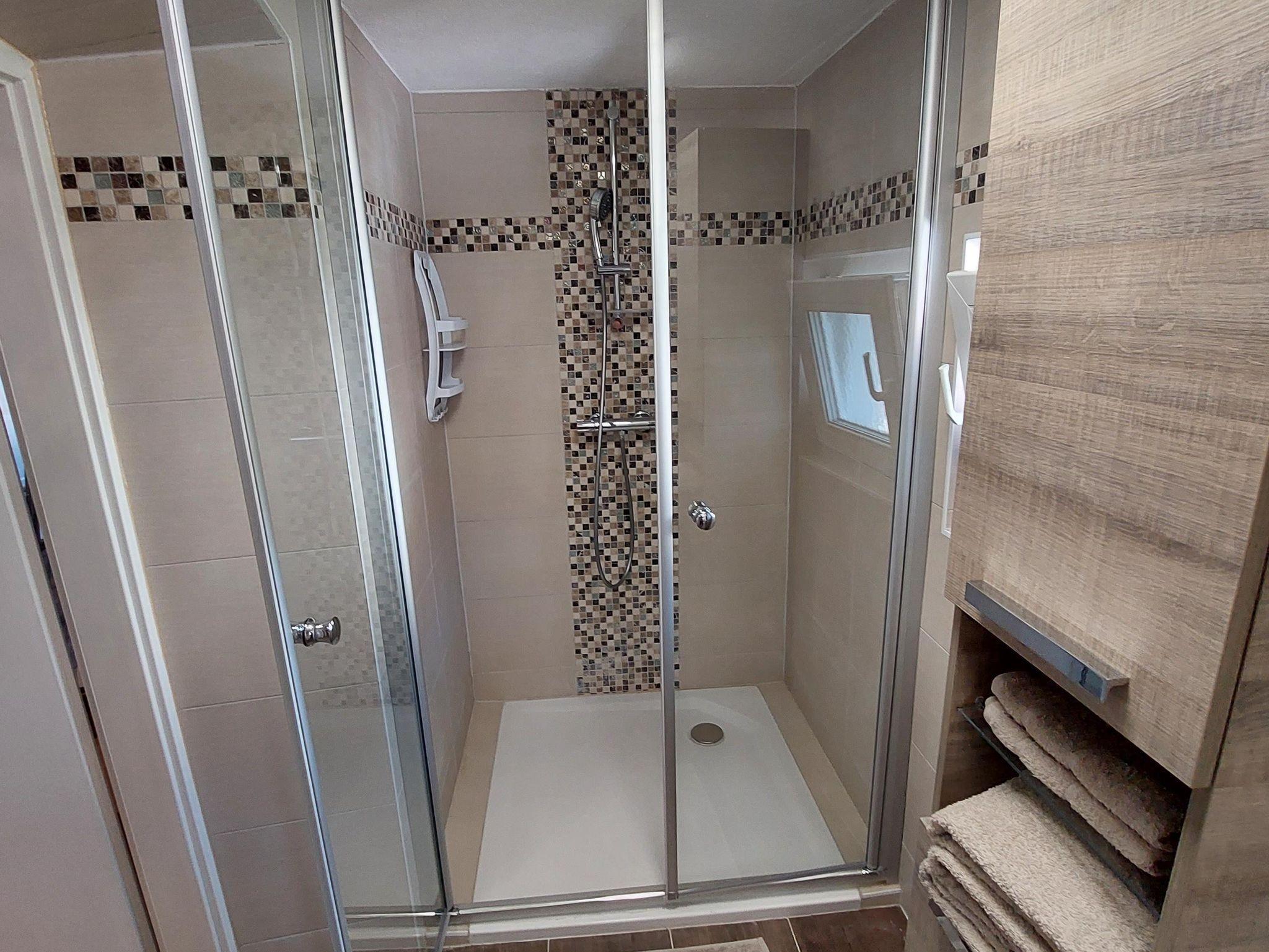 1 Badezimmer mit Dusche und Wäscheständer