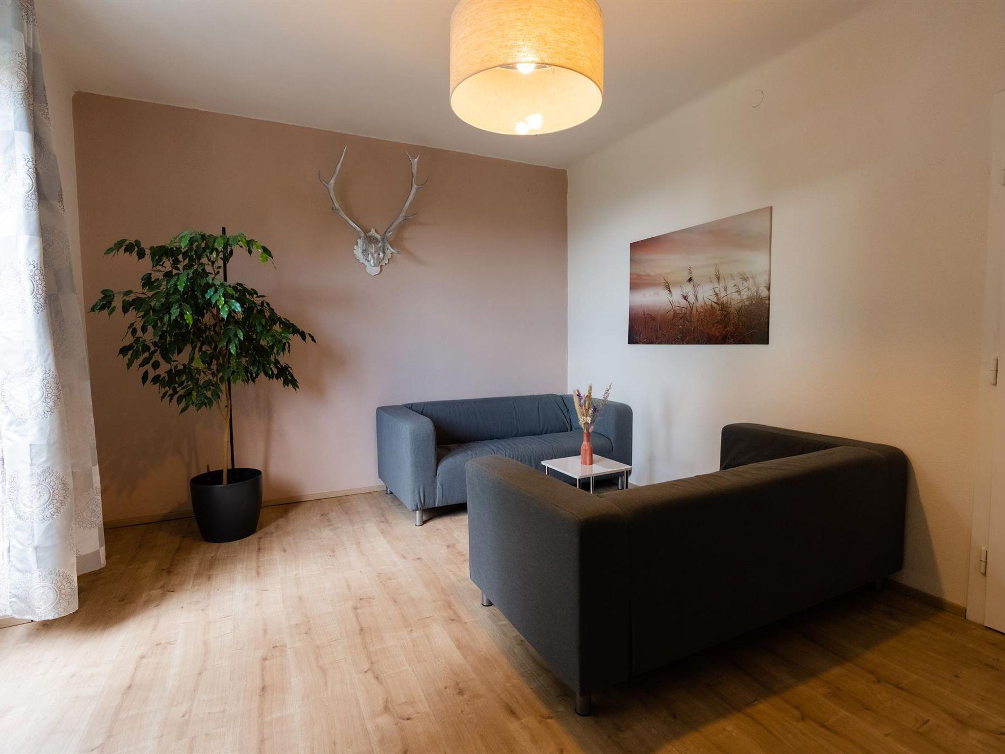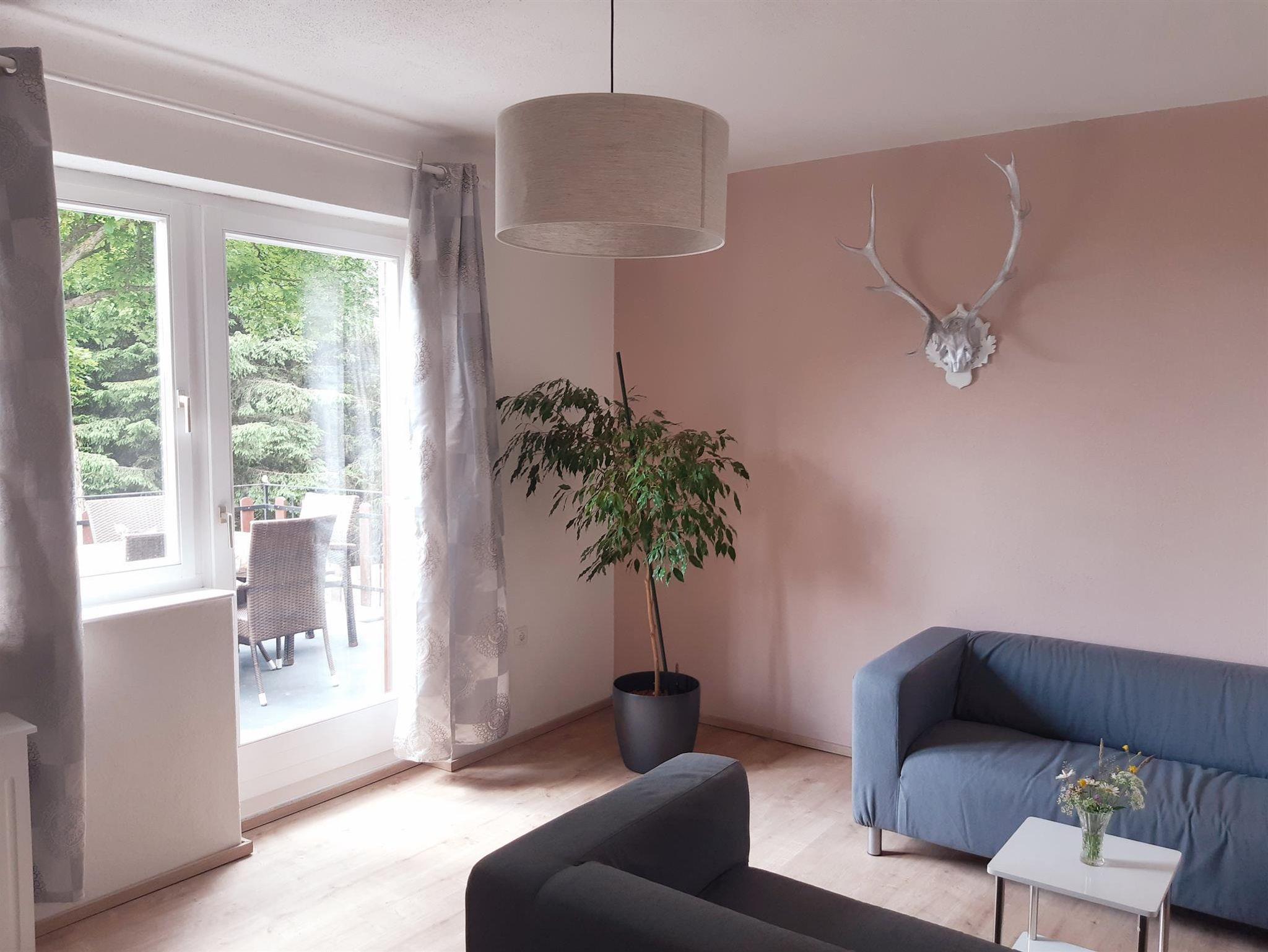 • Wohnbereich mit Schlafcouch (140 x 200 cm) und Schreibtisch, sowie Zugang auf den Balkon
