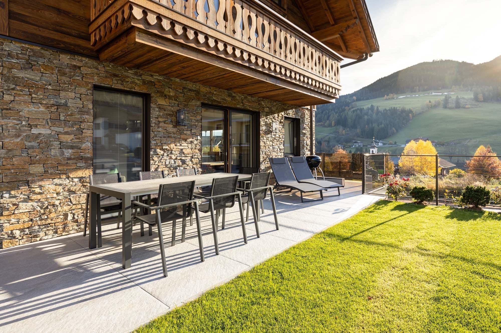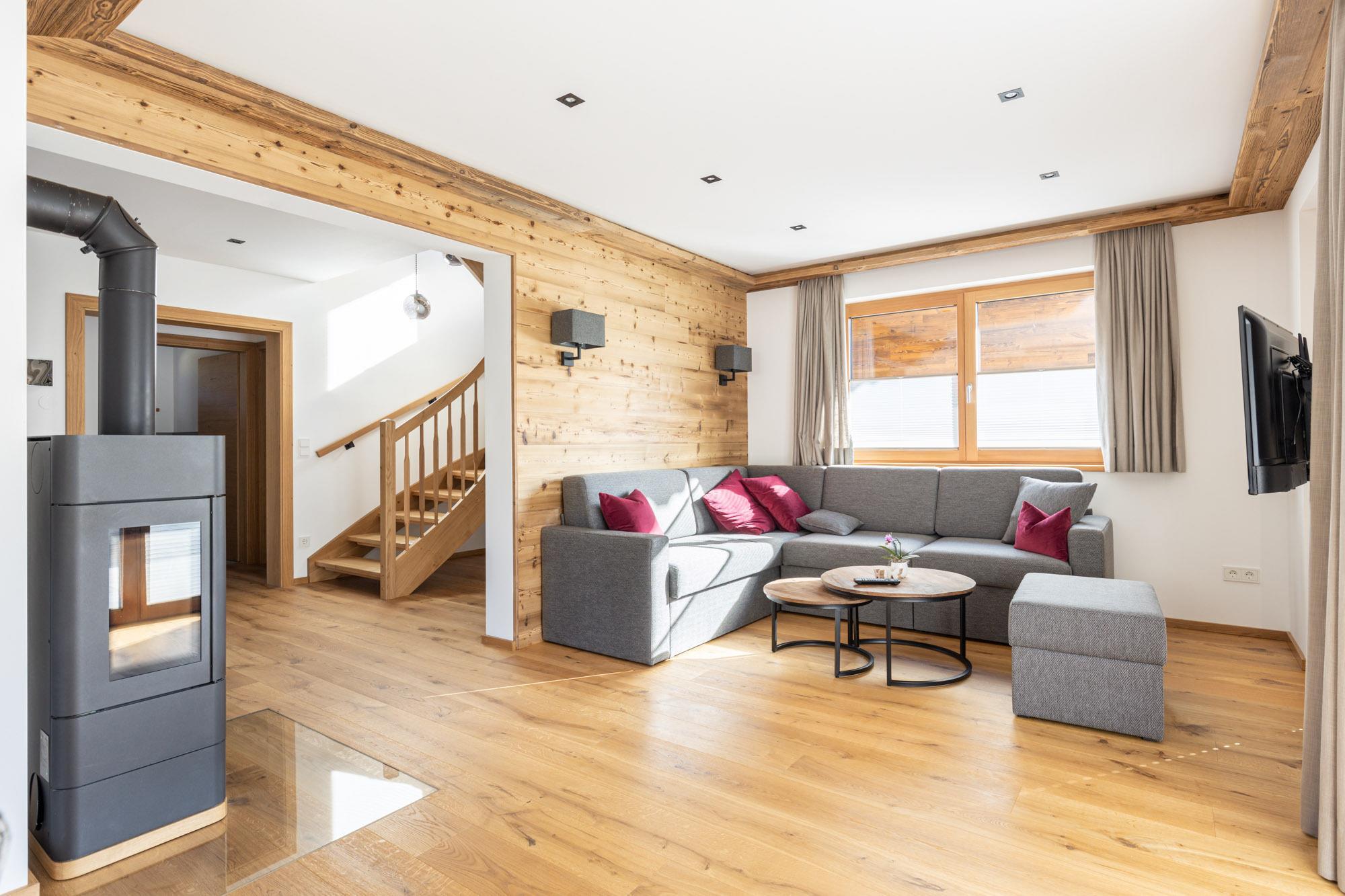 Genießen Sie Komfort und Gemütlichkeit auf höchstem Niveau: Ein Flachbild-TV sorgt für Unterhaltung, während Sie auf dem Balkon frische Bergluft und entspannte Stunden mit Blick auf die Alpen genießen.